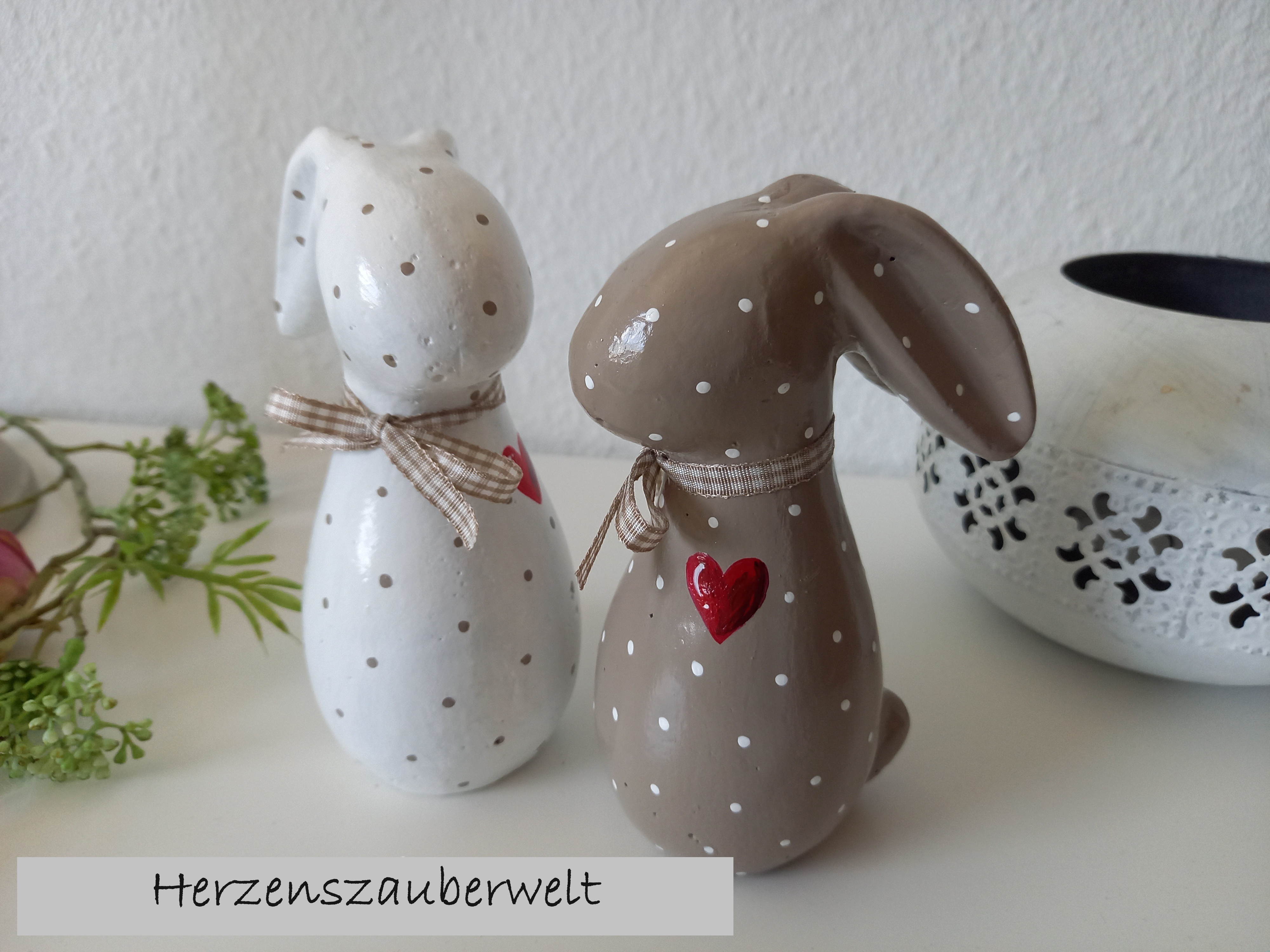 2 Osterhasen * Beton * Beige-Weiß * 15 cm * Herz * Hasenpaar * Pünktchen