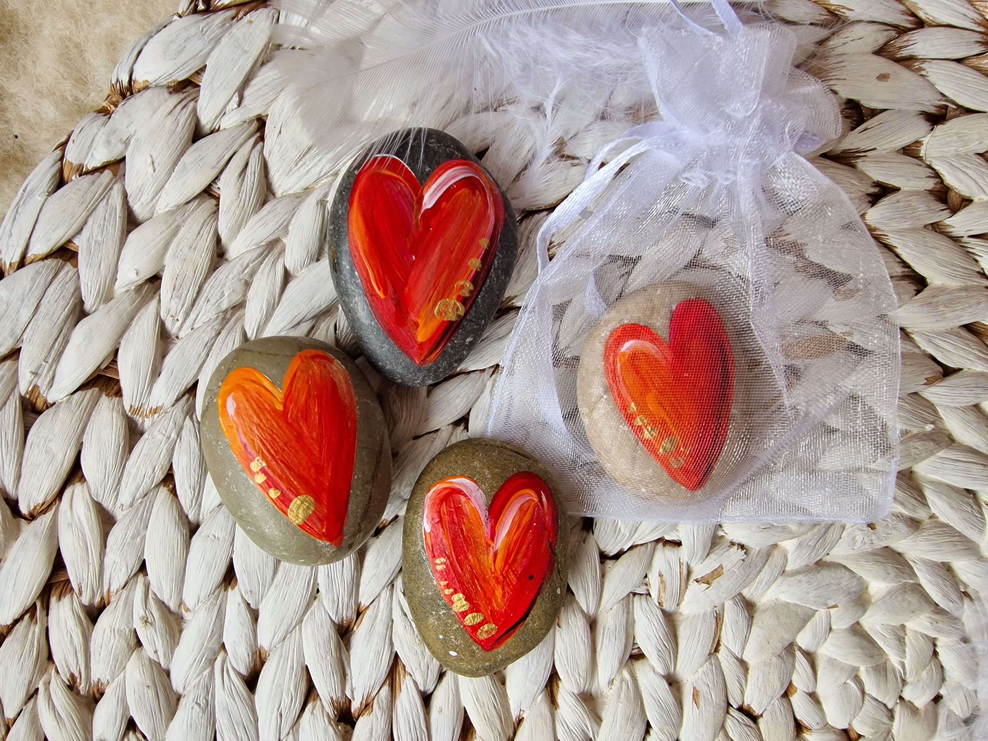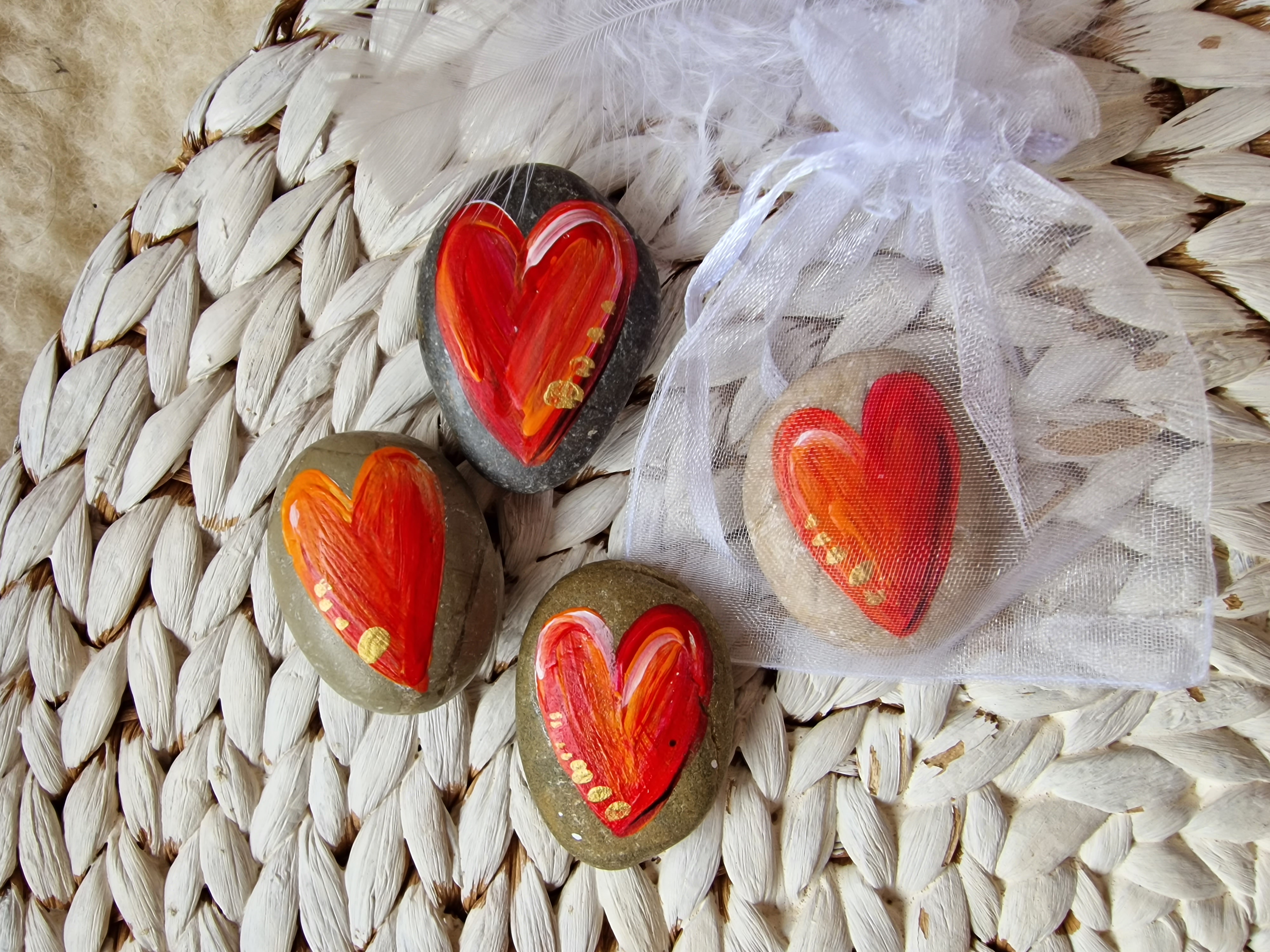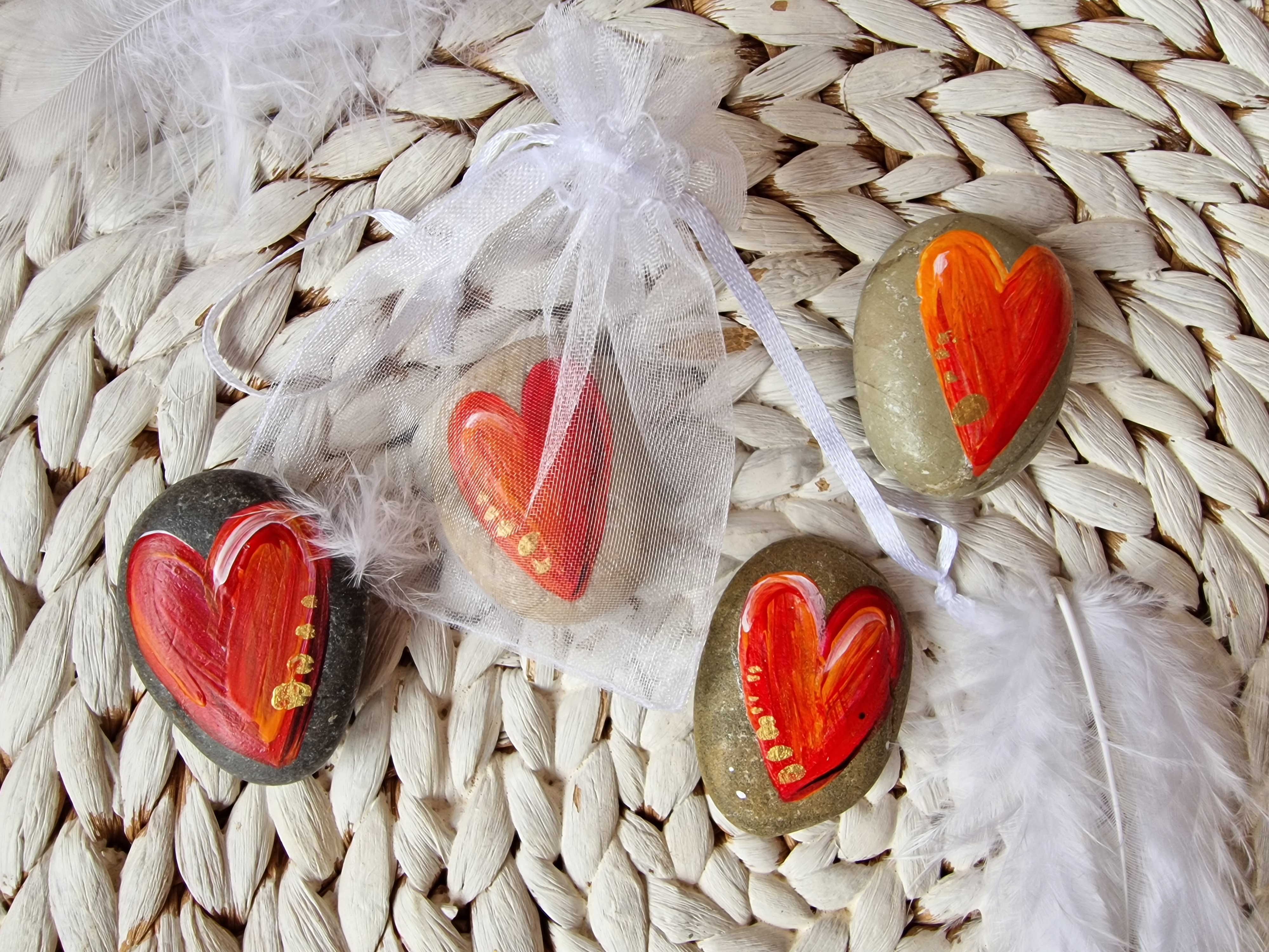 4 Herzsteine * bemalt * in Organzasäckchen * 3-4 cm