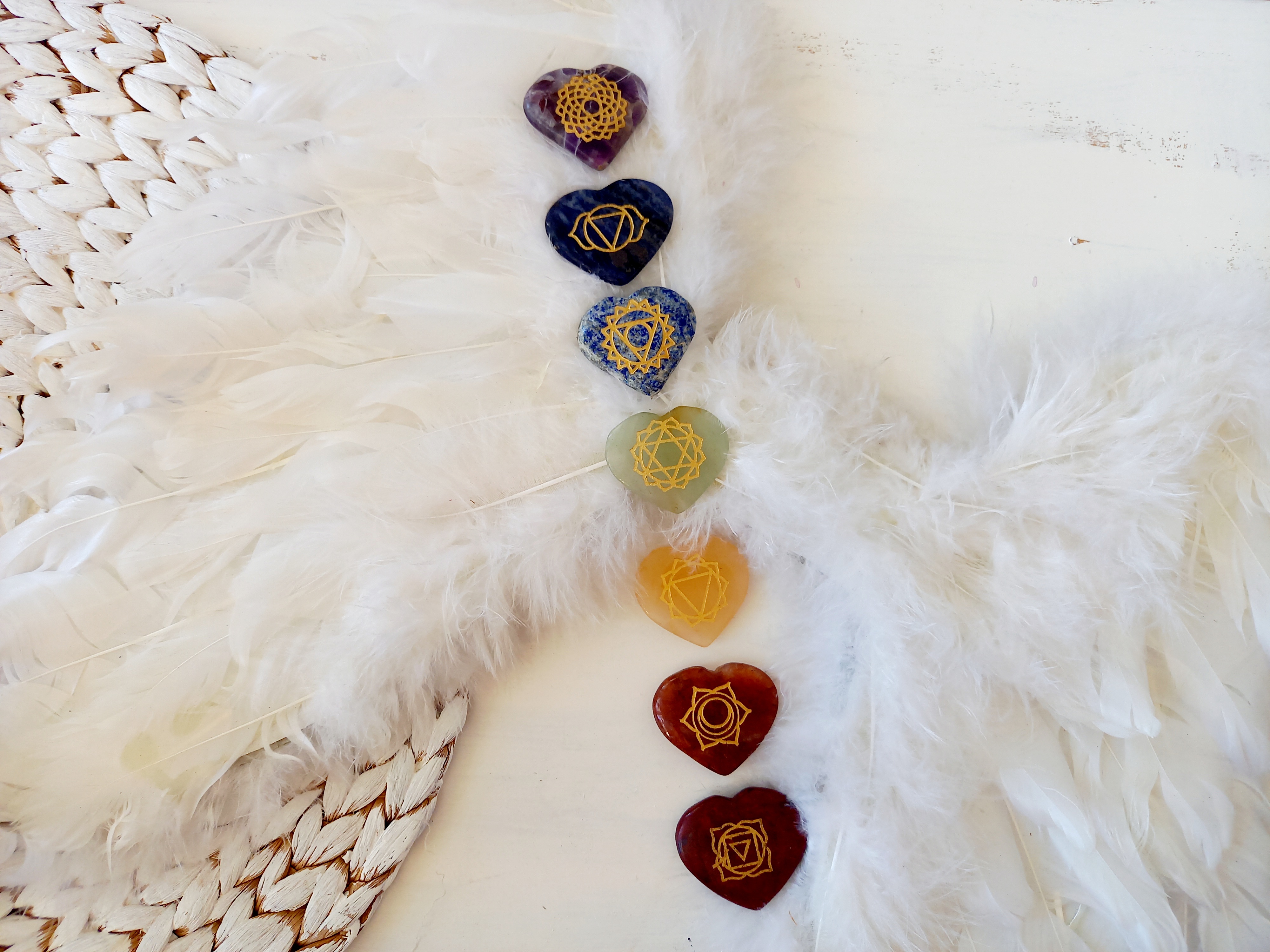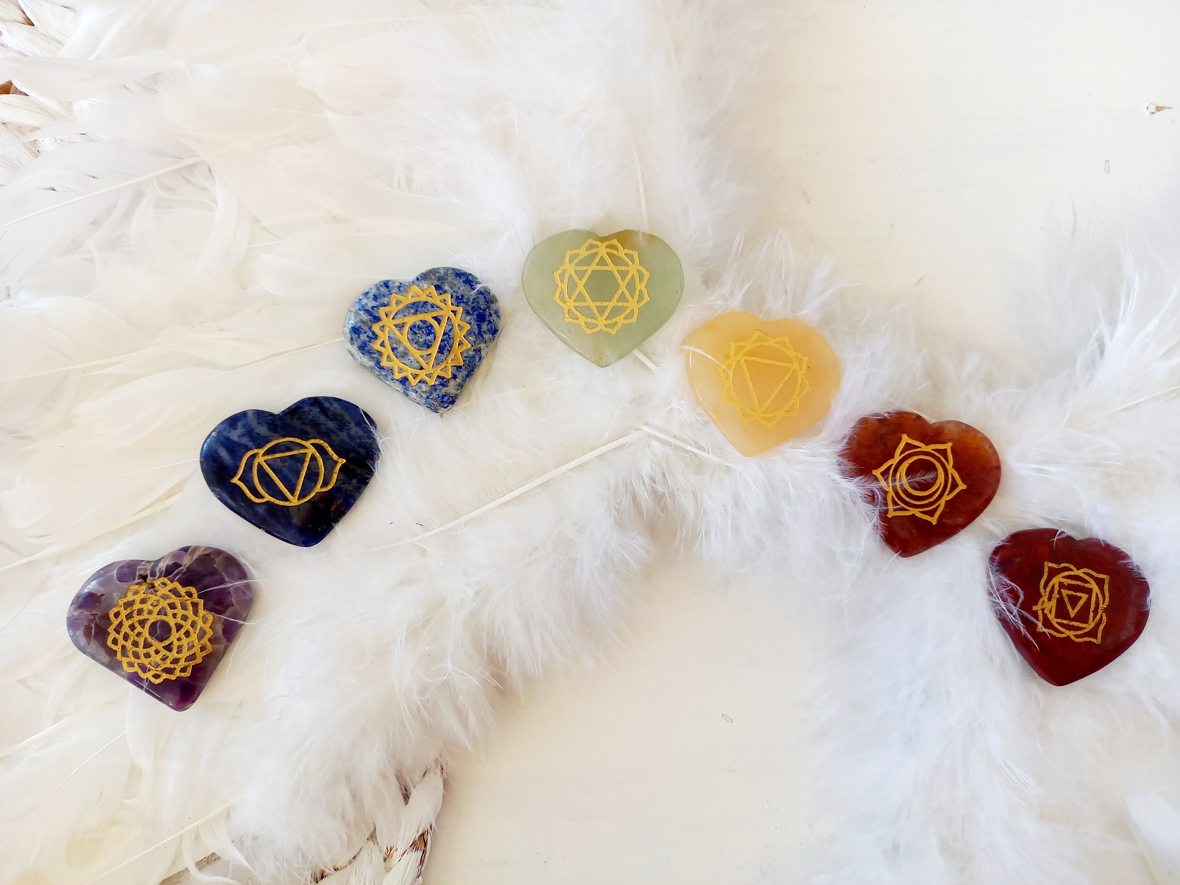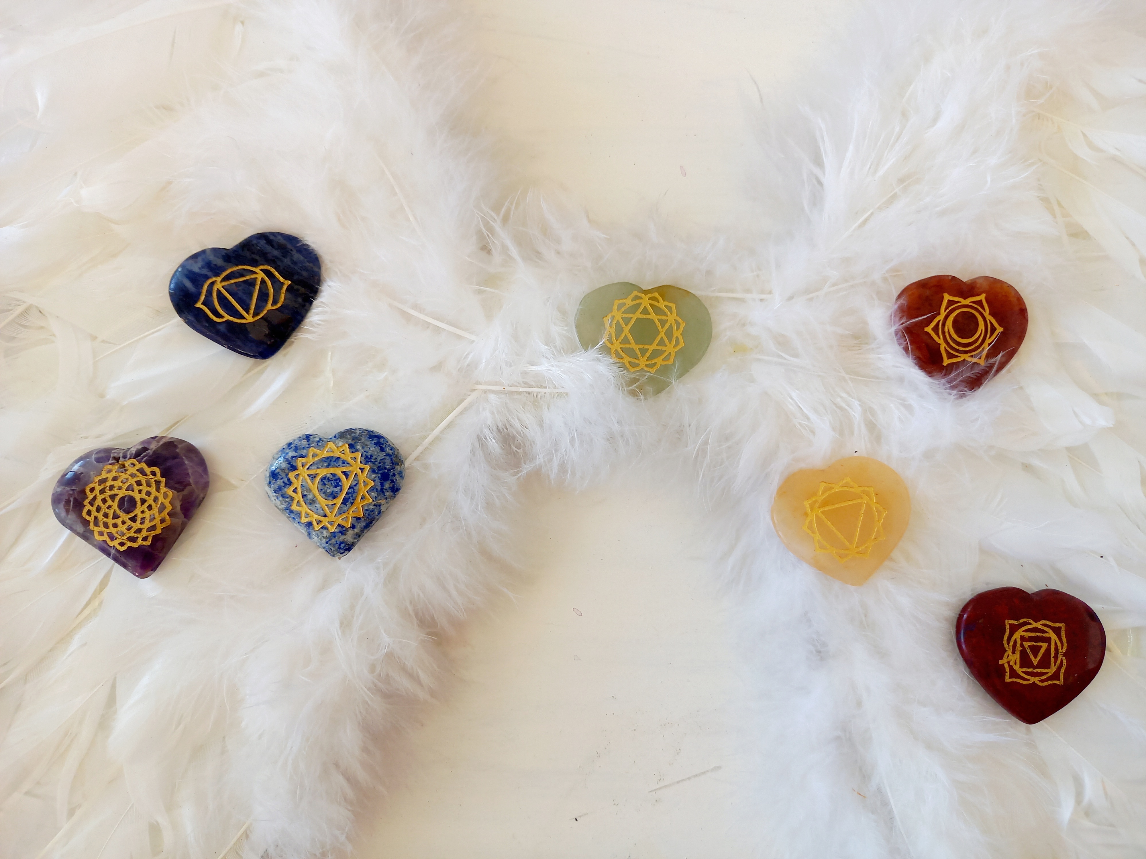 Schönes Set, bestehend aus sieben flachen, herzförmigen Edelsteinen in verschiedenen Farben mit goldgravierten Symbolen der sieben Chakren.