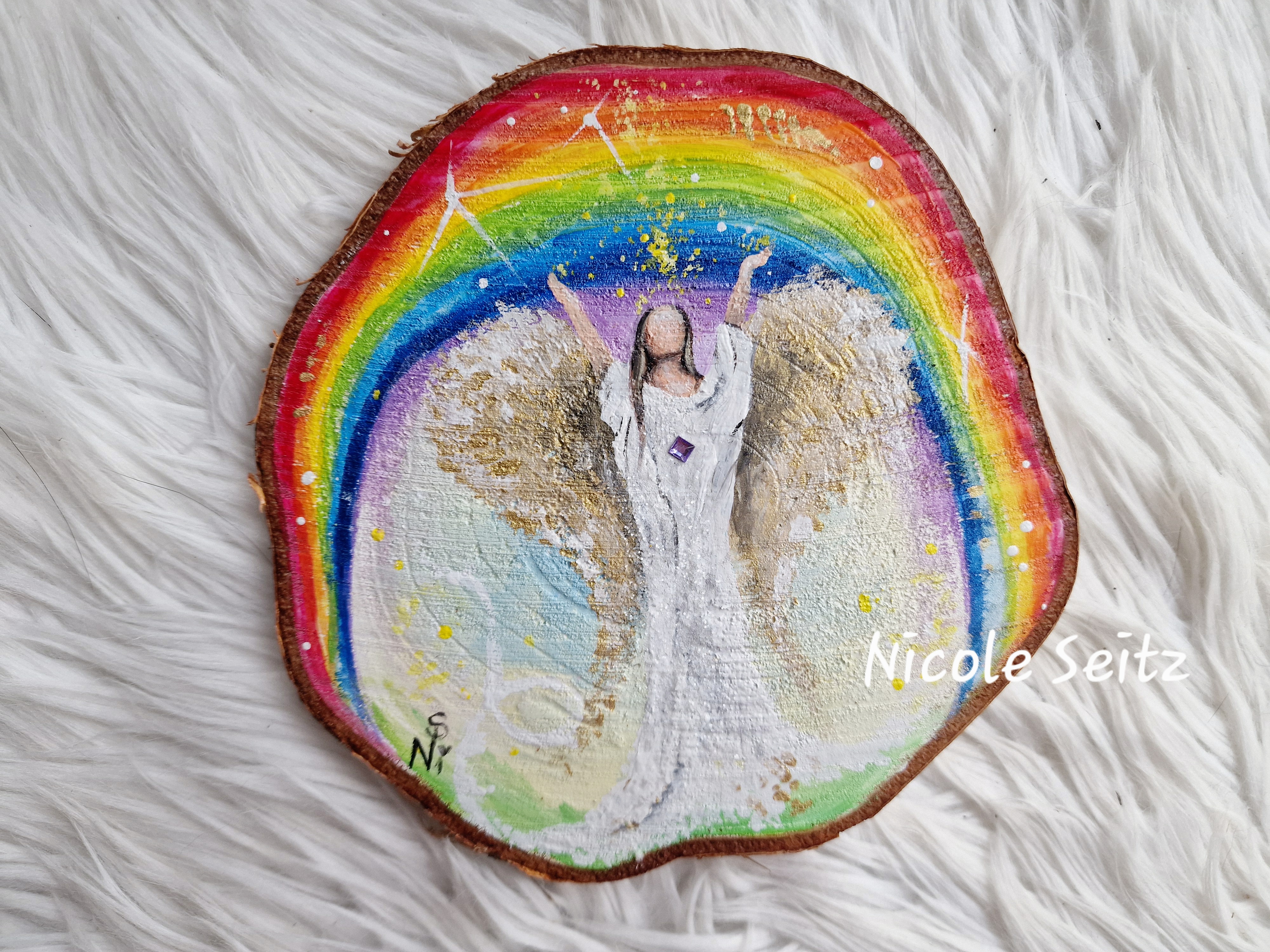 Regenbogenengel auf Baumscheibe gemalt * 16 x 16 cm