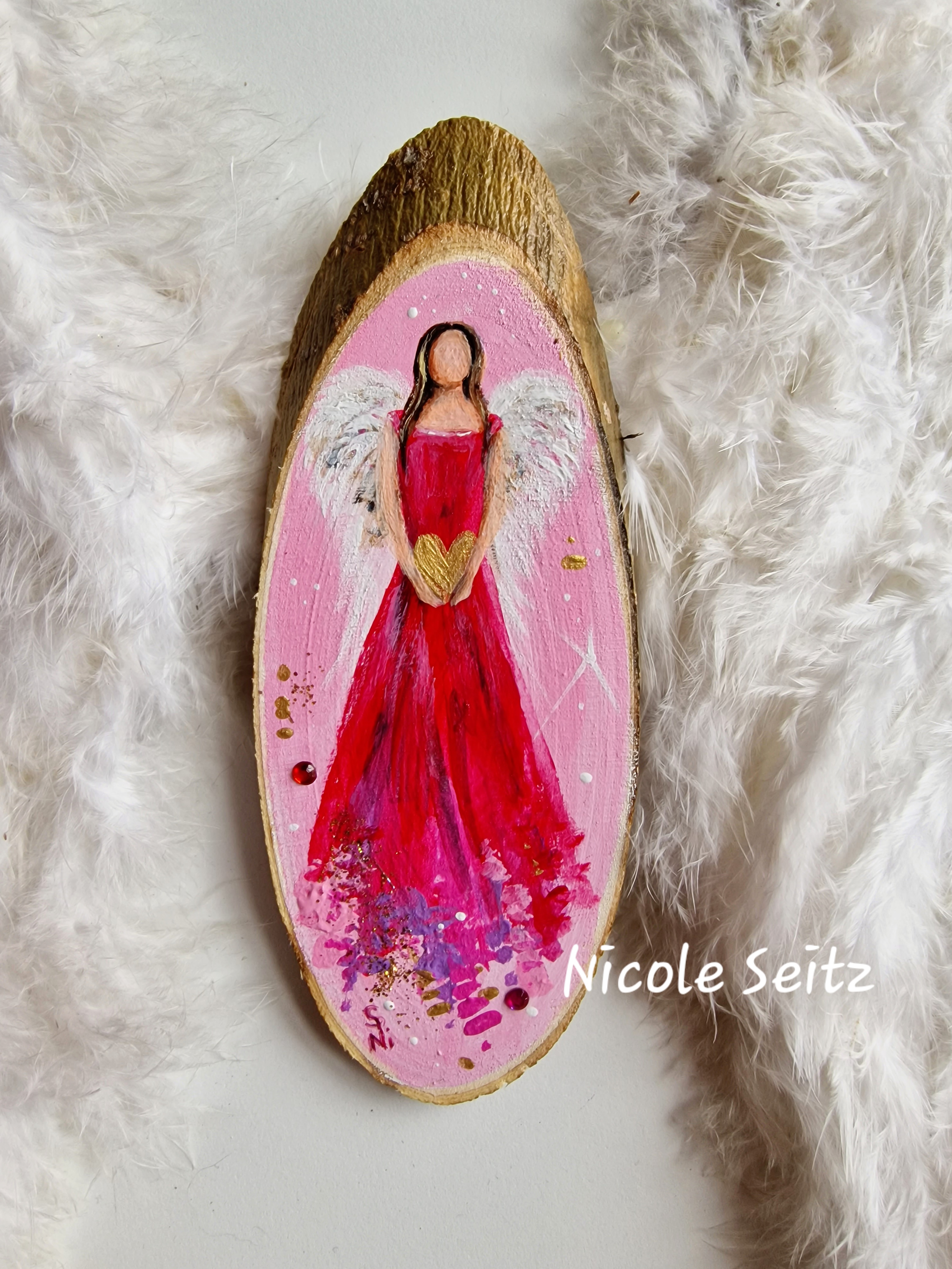 Engel auf Baumscheibe gemalt * Herz * 17,2 x 6,5 x 1 cm * Pink-Rosa-Rot