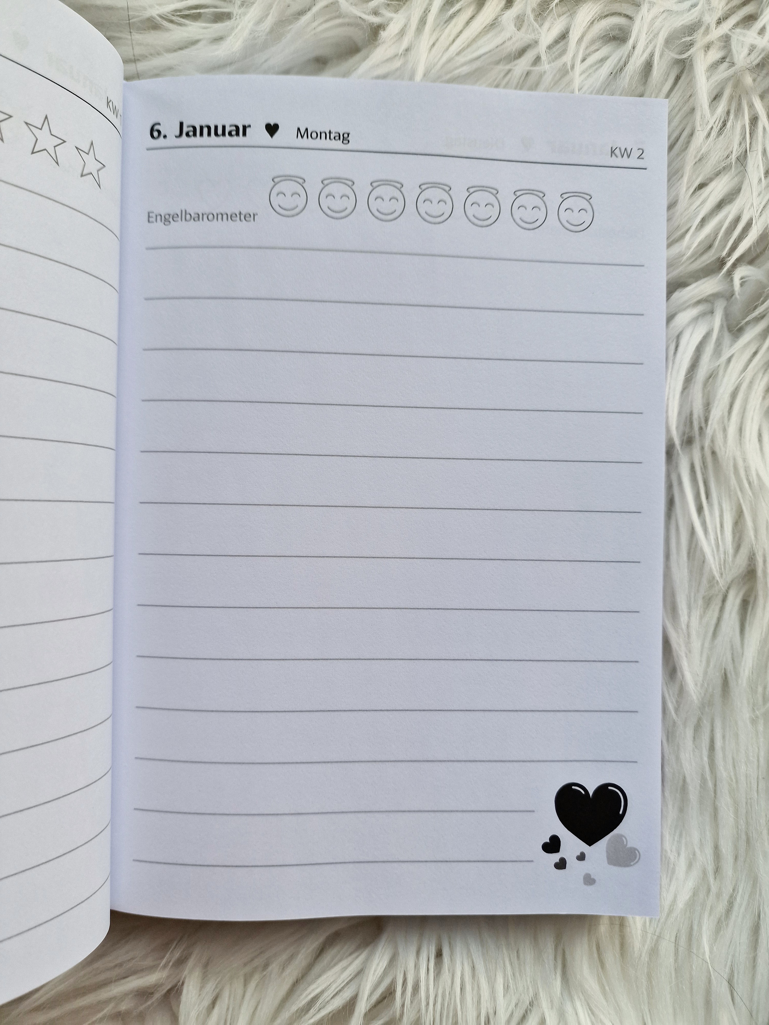 - Seiten mit Linien und jeden Tag mit einem von 7 verschiedenen Barometern: Glücksbarometer, Liebesbarometer, Füllebarometer, Engelbarometer, Herzensbarometer, Wunderbarometer, Freudebarometer zum Einkreisen oder anmalen