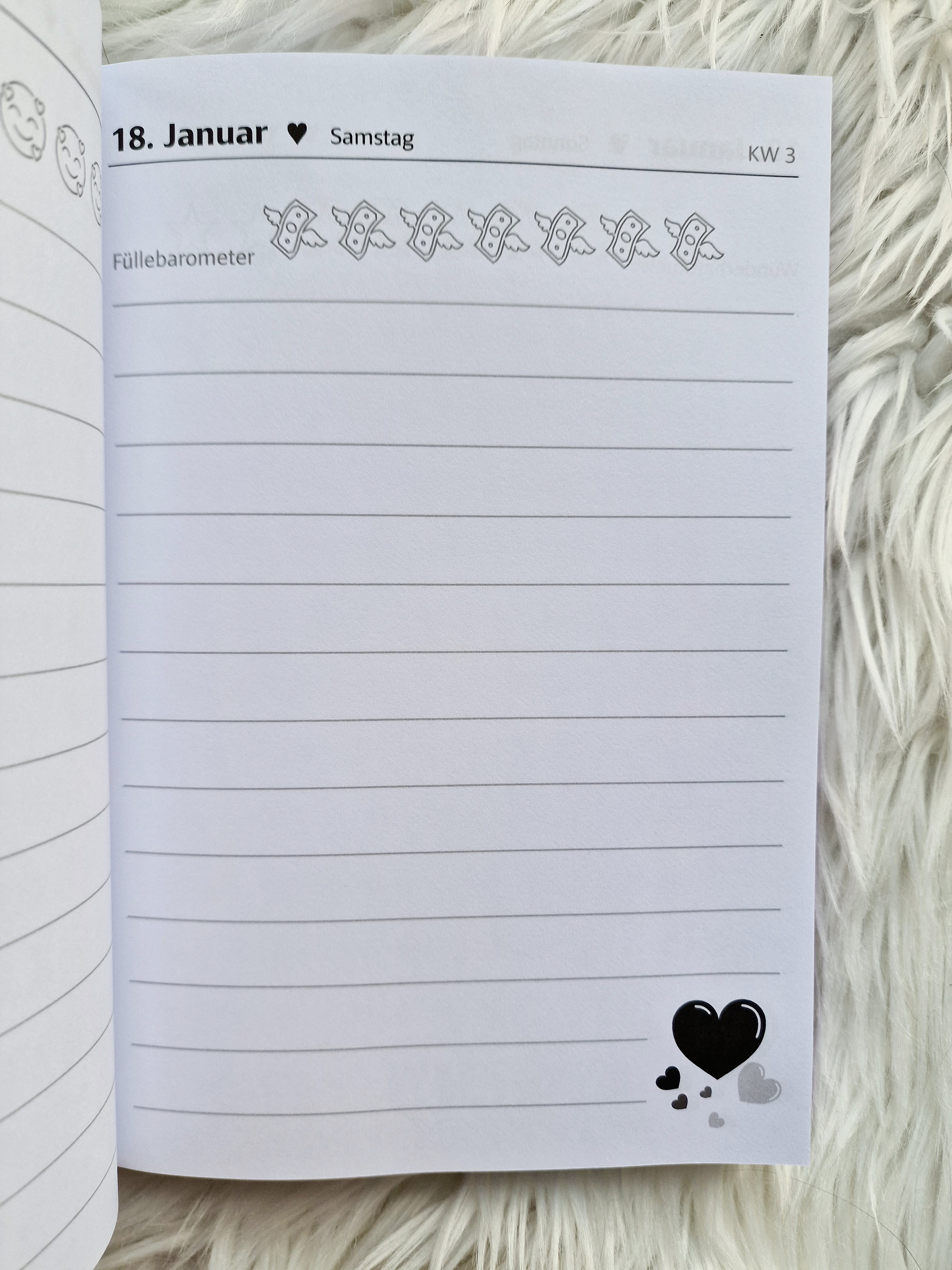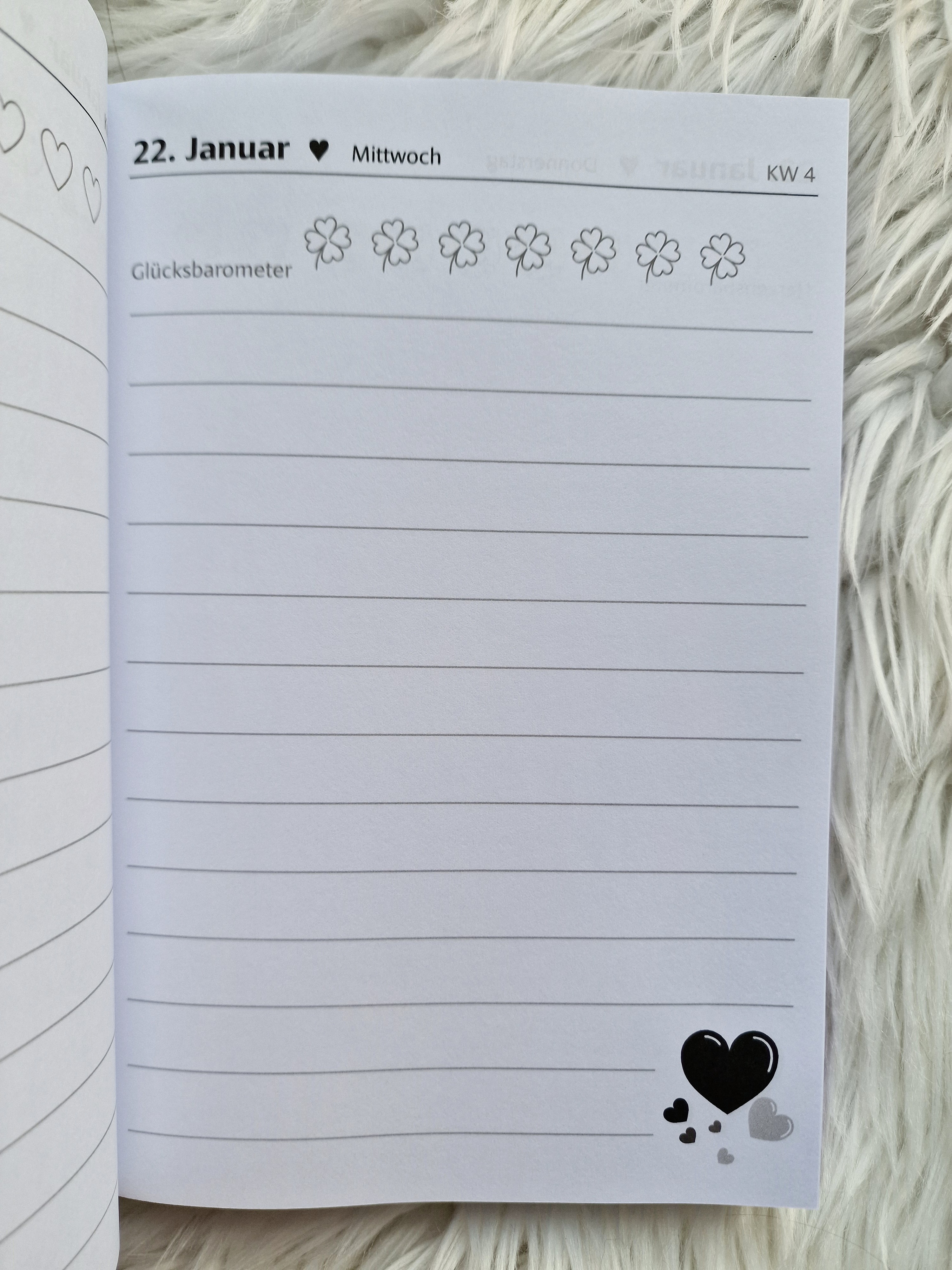 Für jeden Tag eine eigene Seite mit Zeilen und Glücks-/Liebes-/Fülle-/Wunder-/Herzens-/Freude/Wunderbarometer.