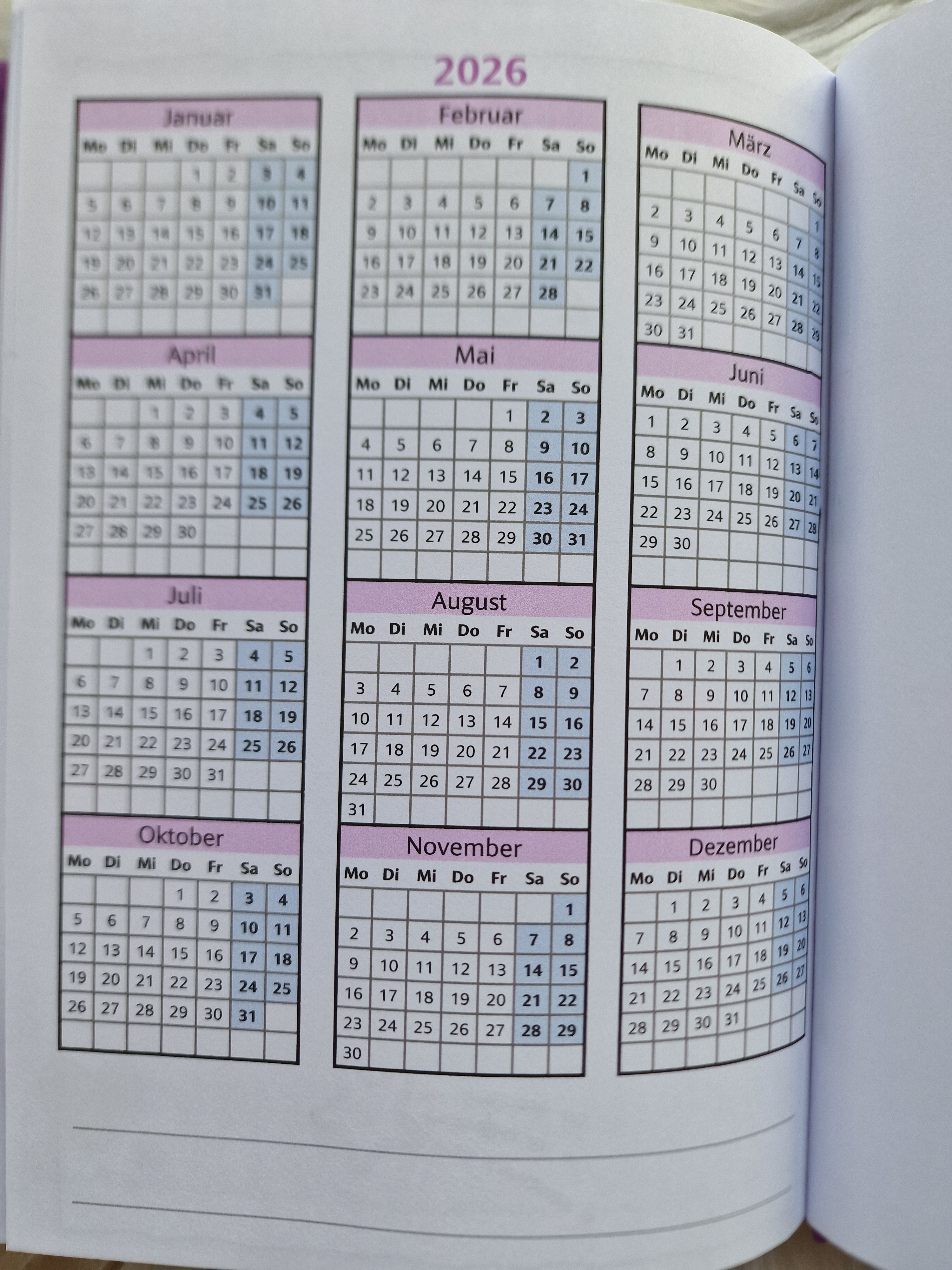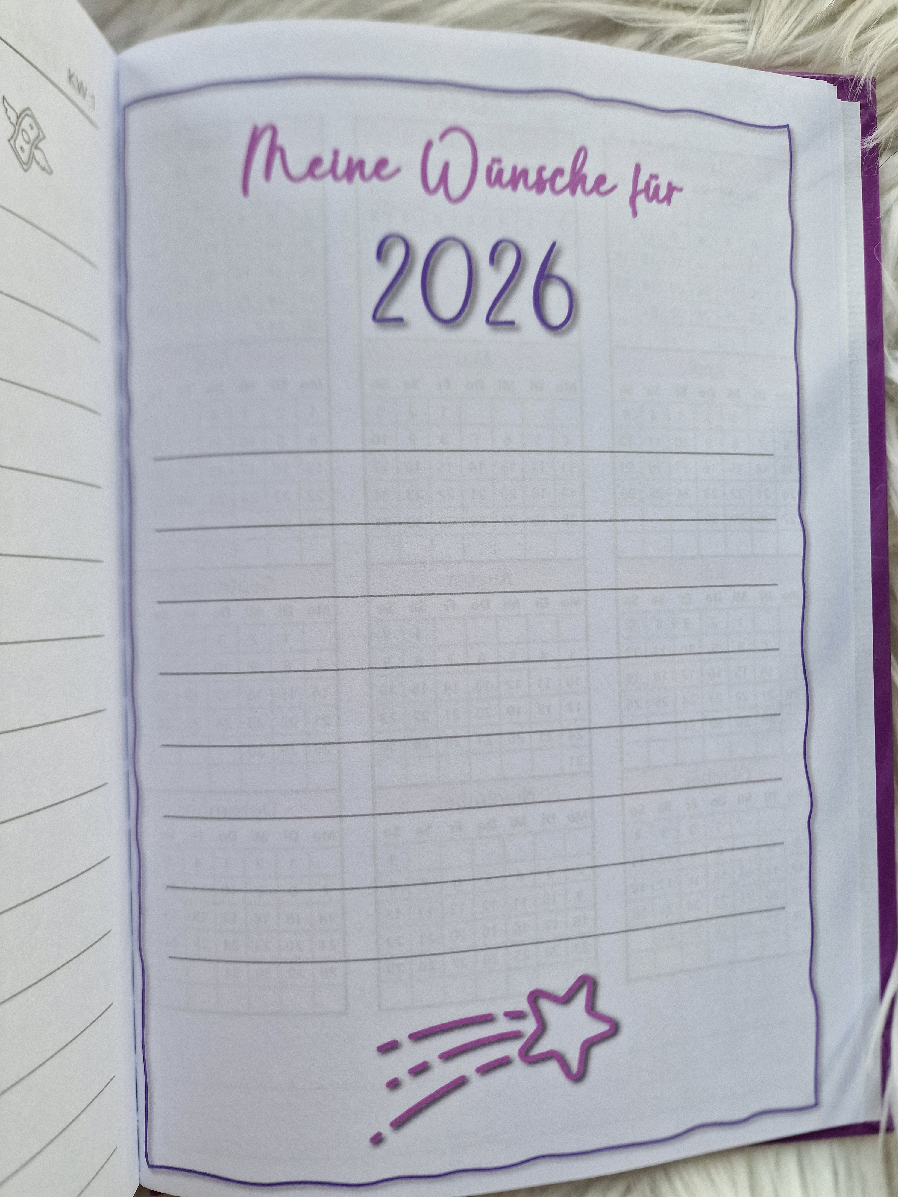 - Auf den letzten beideb Seiten: "Meine Wünsche für 2026" und Kalenderüberblick auf 2026