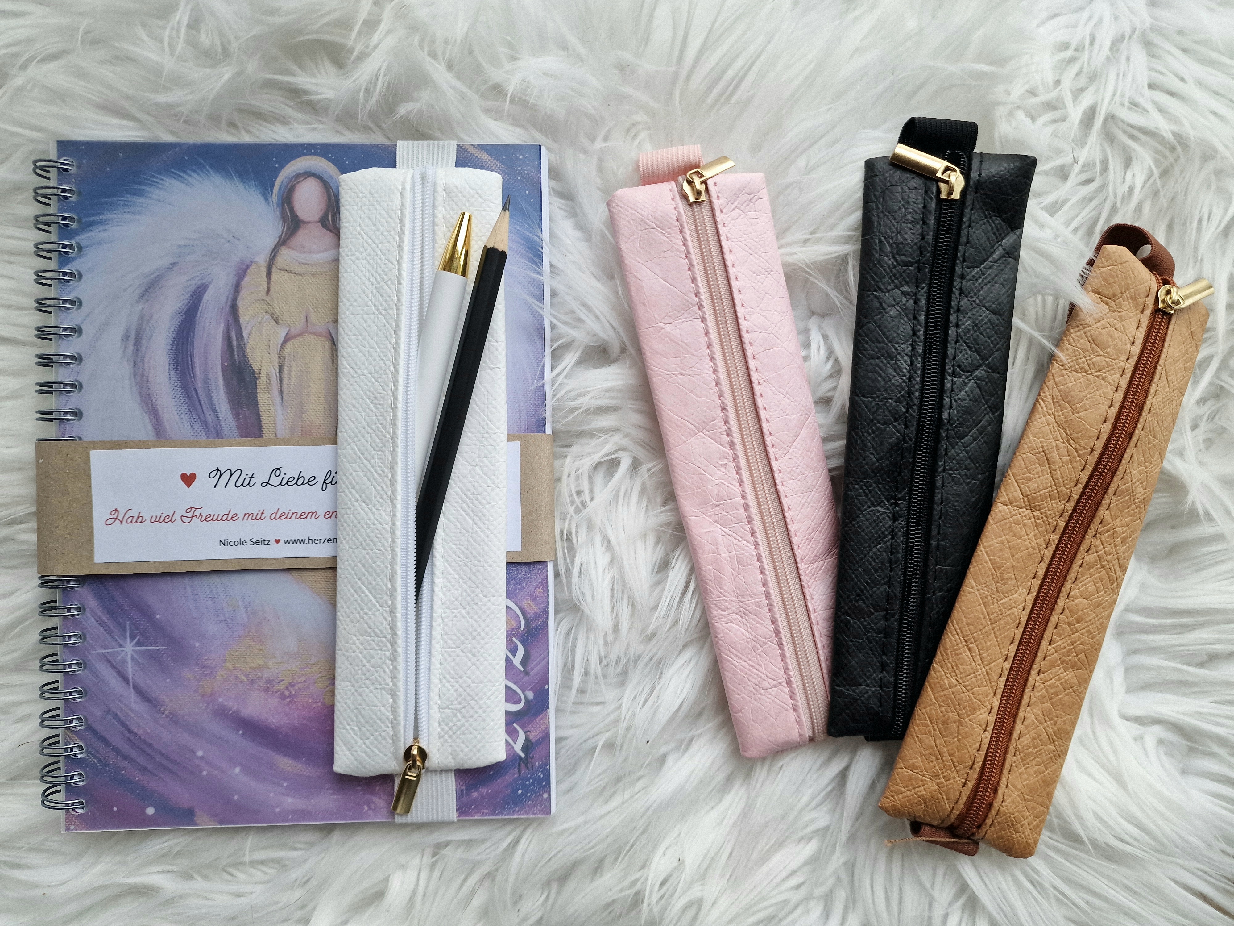 + Mäppchen, das am Buch befestigt werden kann - gefüllt mit Kugelschreiber (lila-rosegold oder weiß-gold) und Bleistift (Faber Castell)