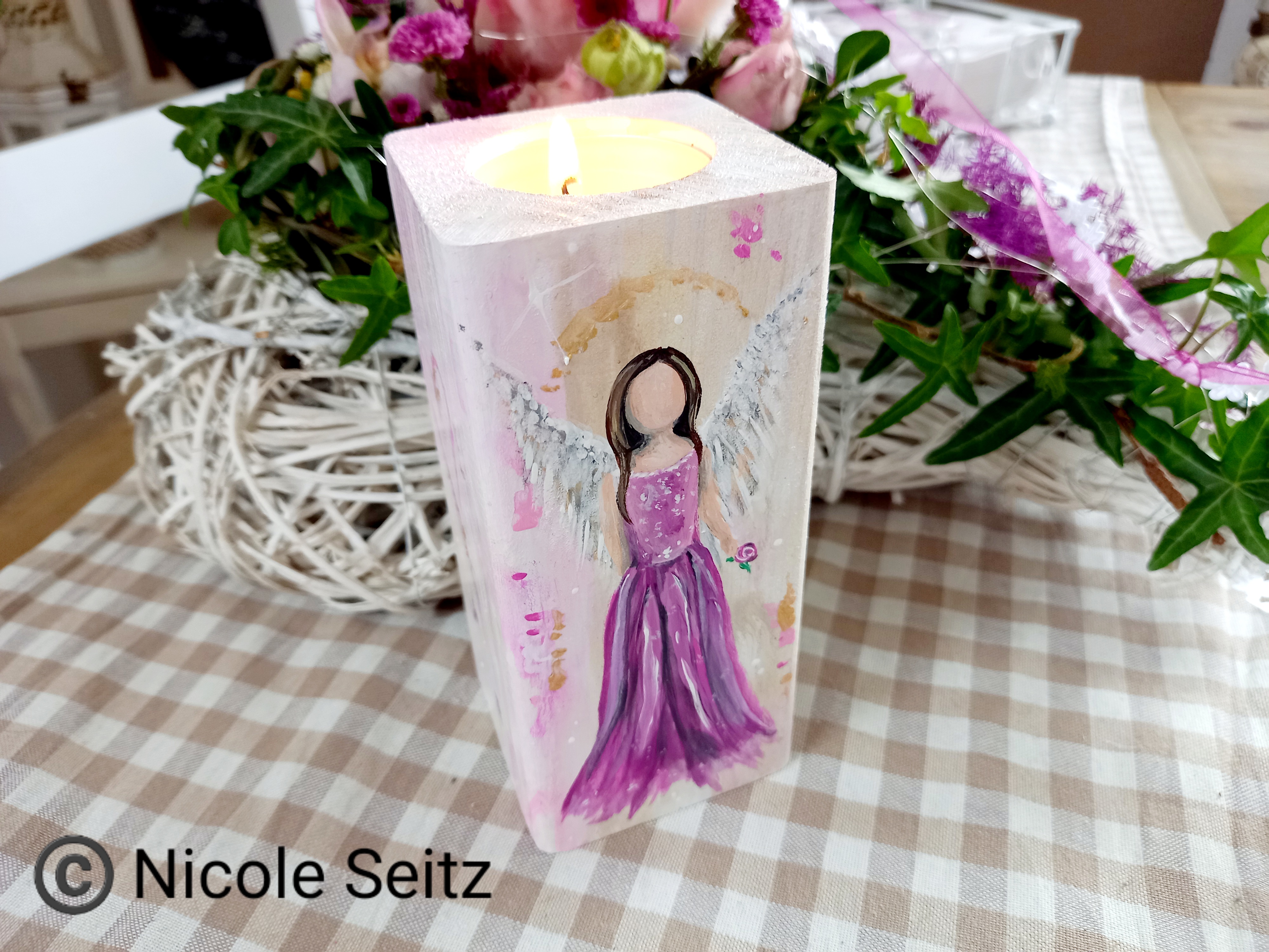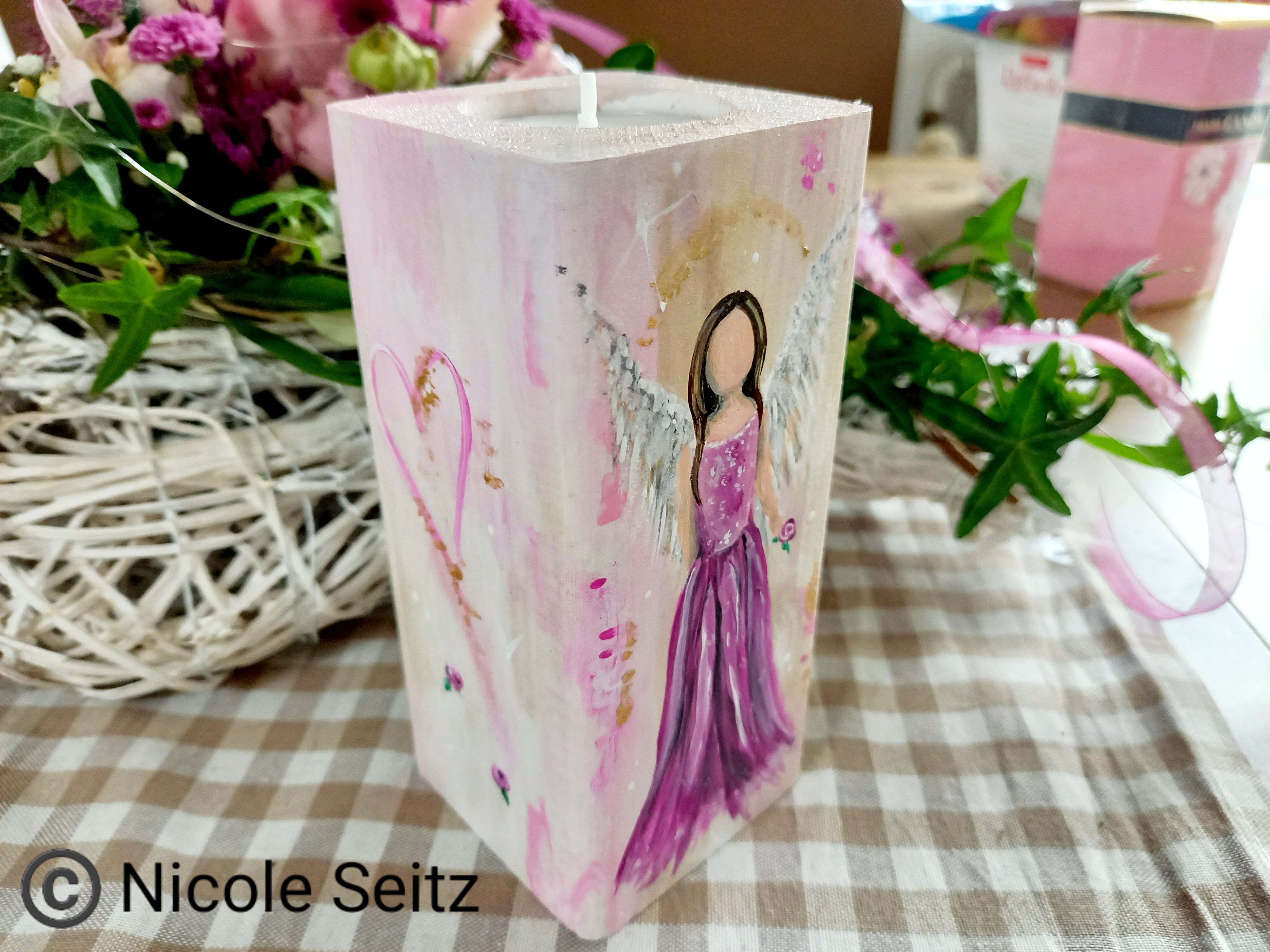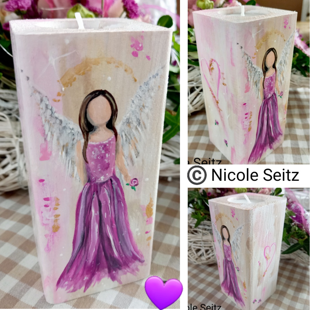Engellicht aus Holz * Herz * Rosen * Lila-Pink * handbemalt