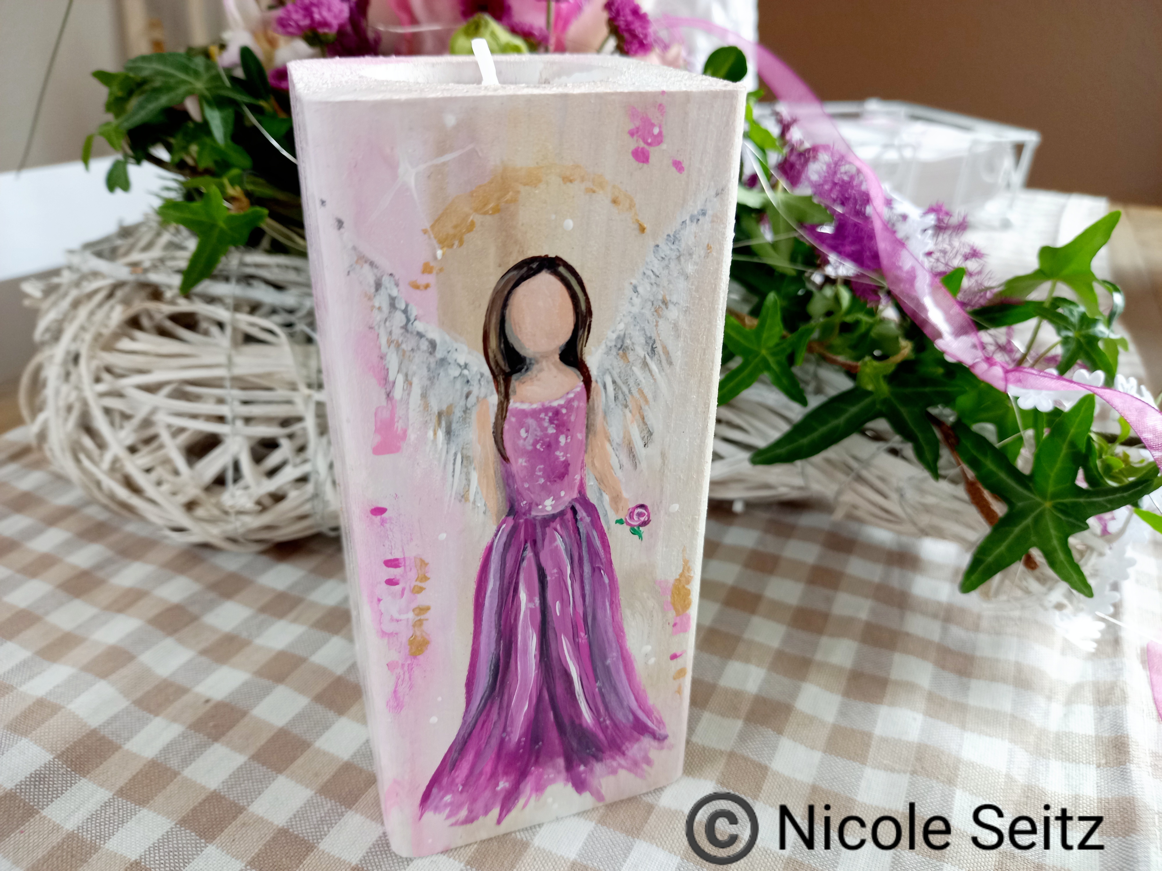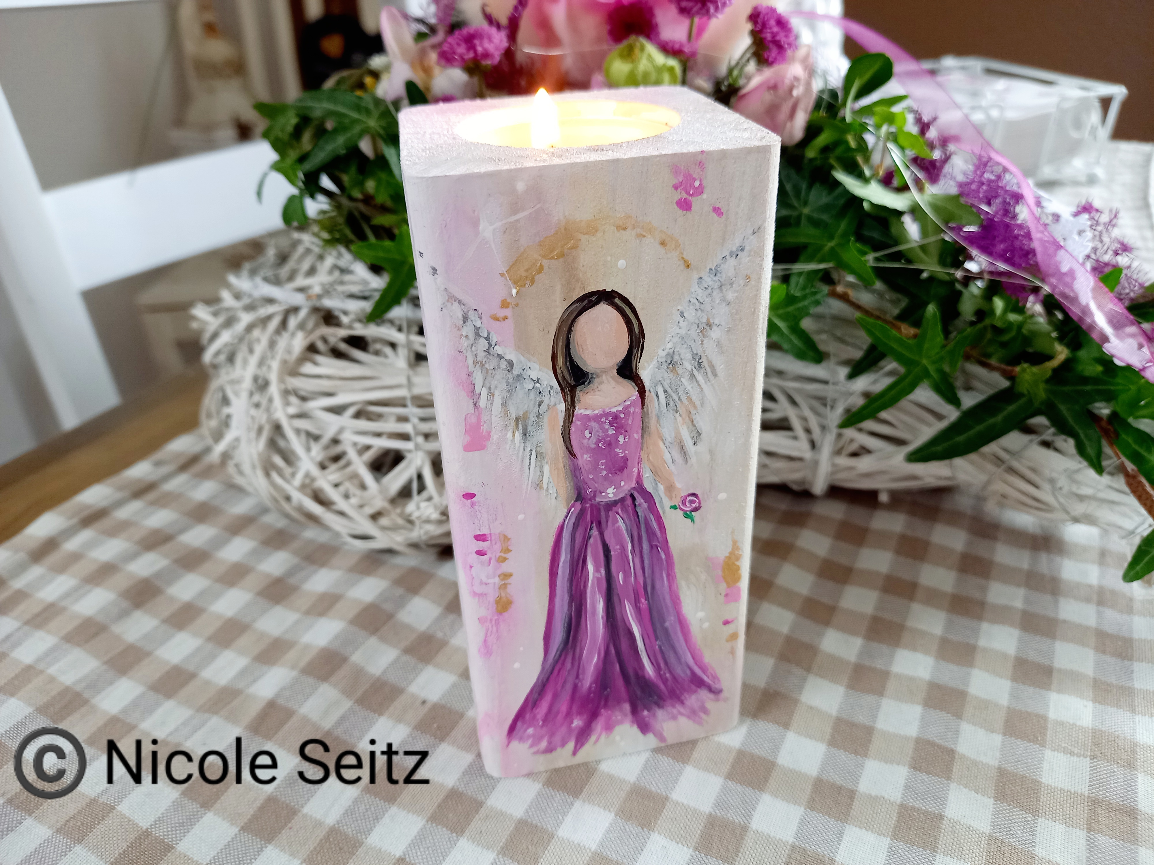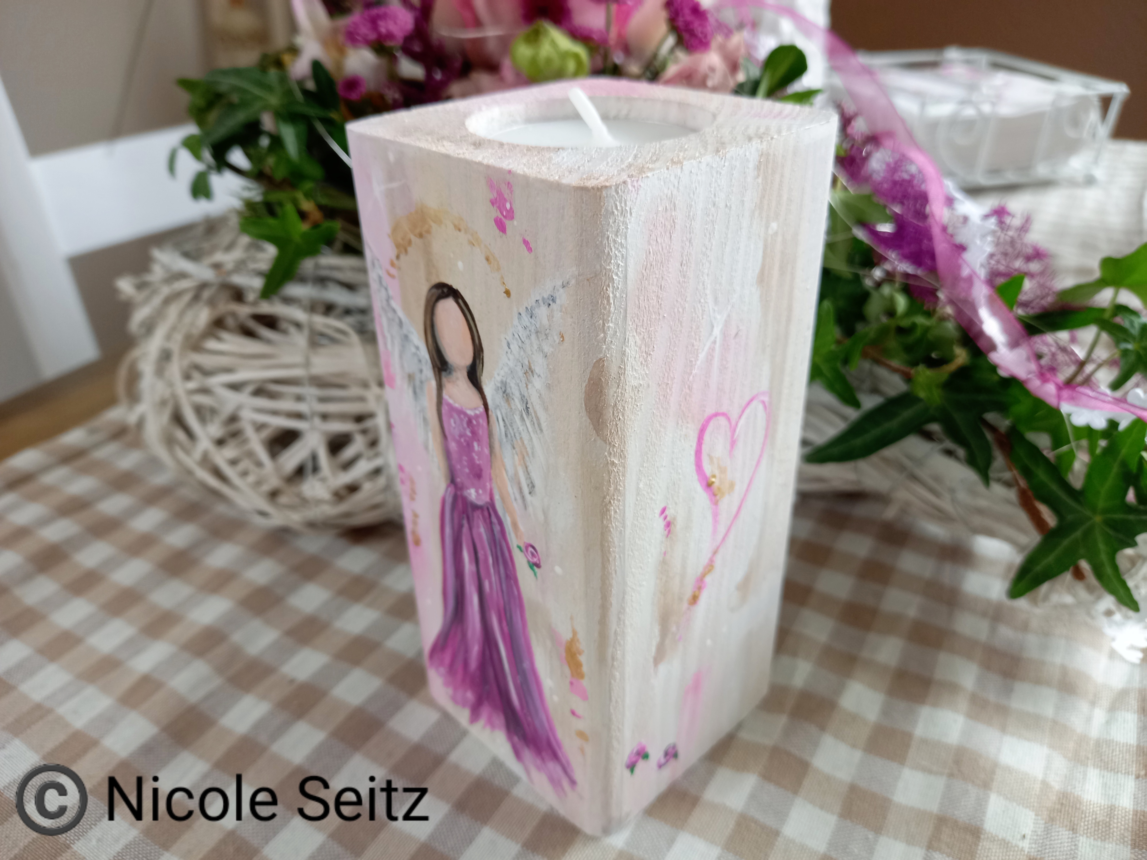 Engellicht aus Holz * Herz * Rosen * Lila-Pink * handbemalt