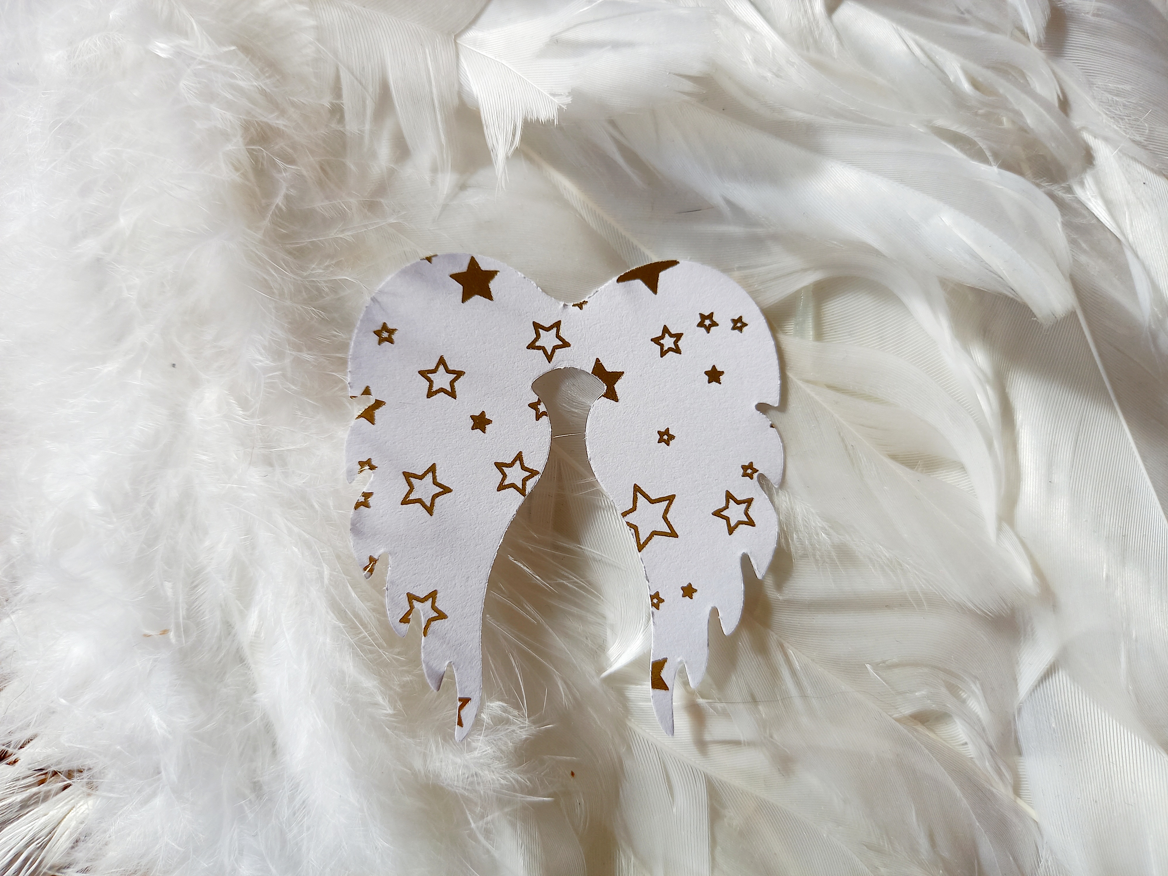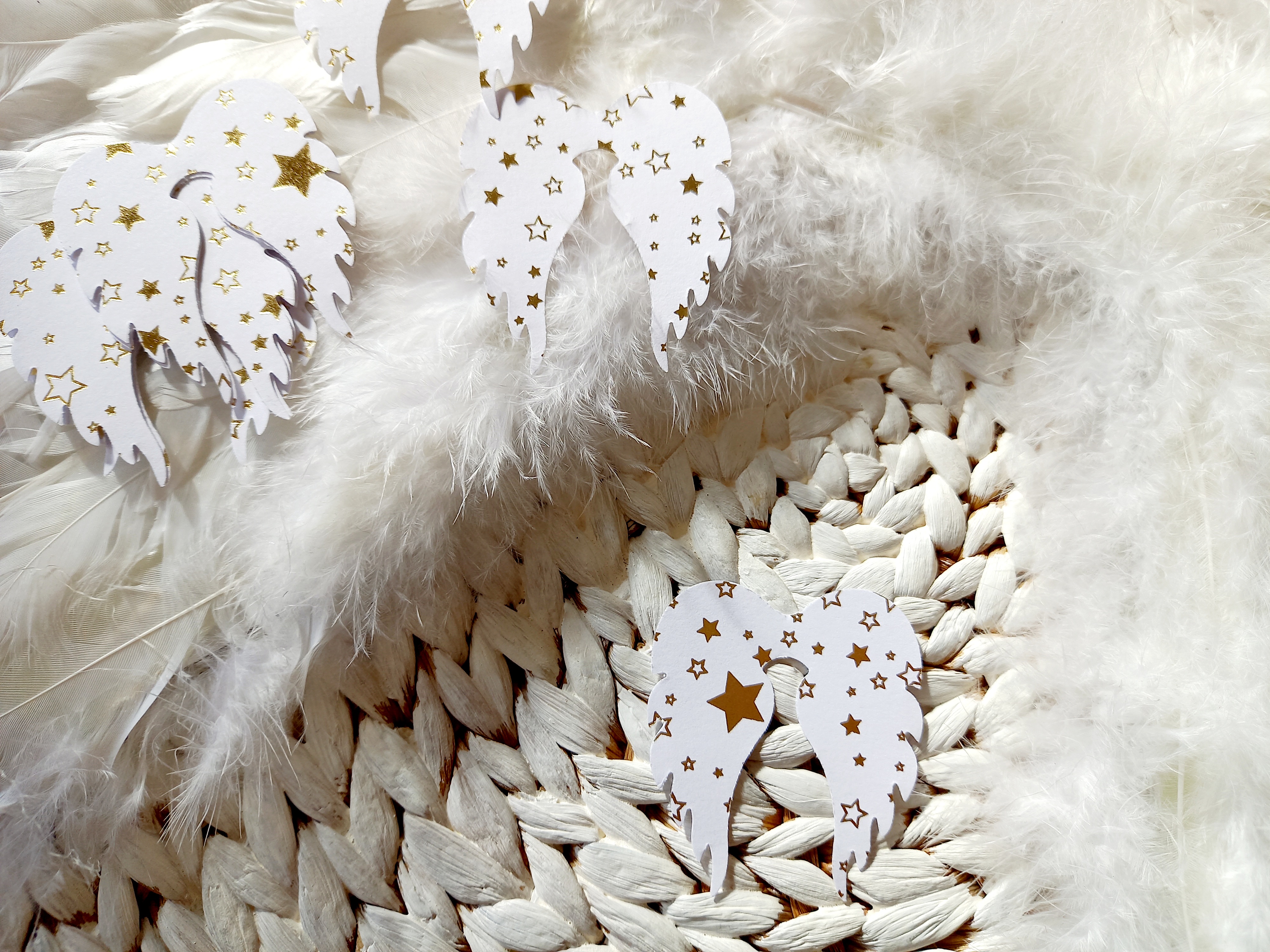 Engelsflügel * 10 Stück * 5 x 5,5 cm * Weiß mit Goldsternen