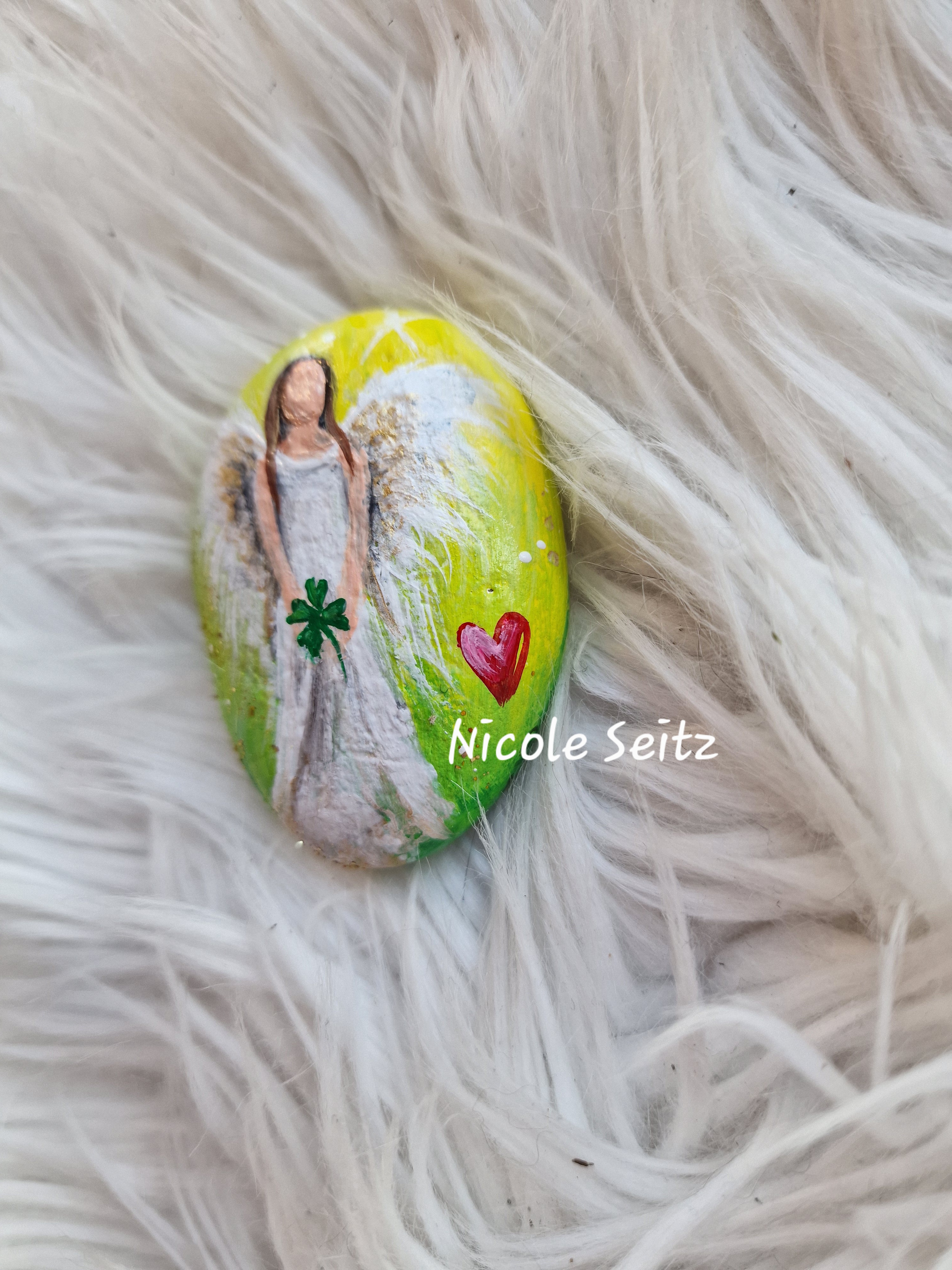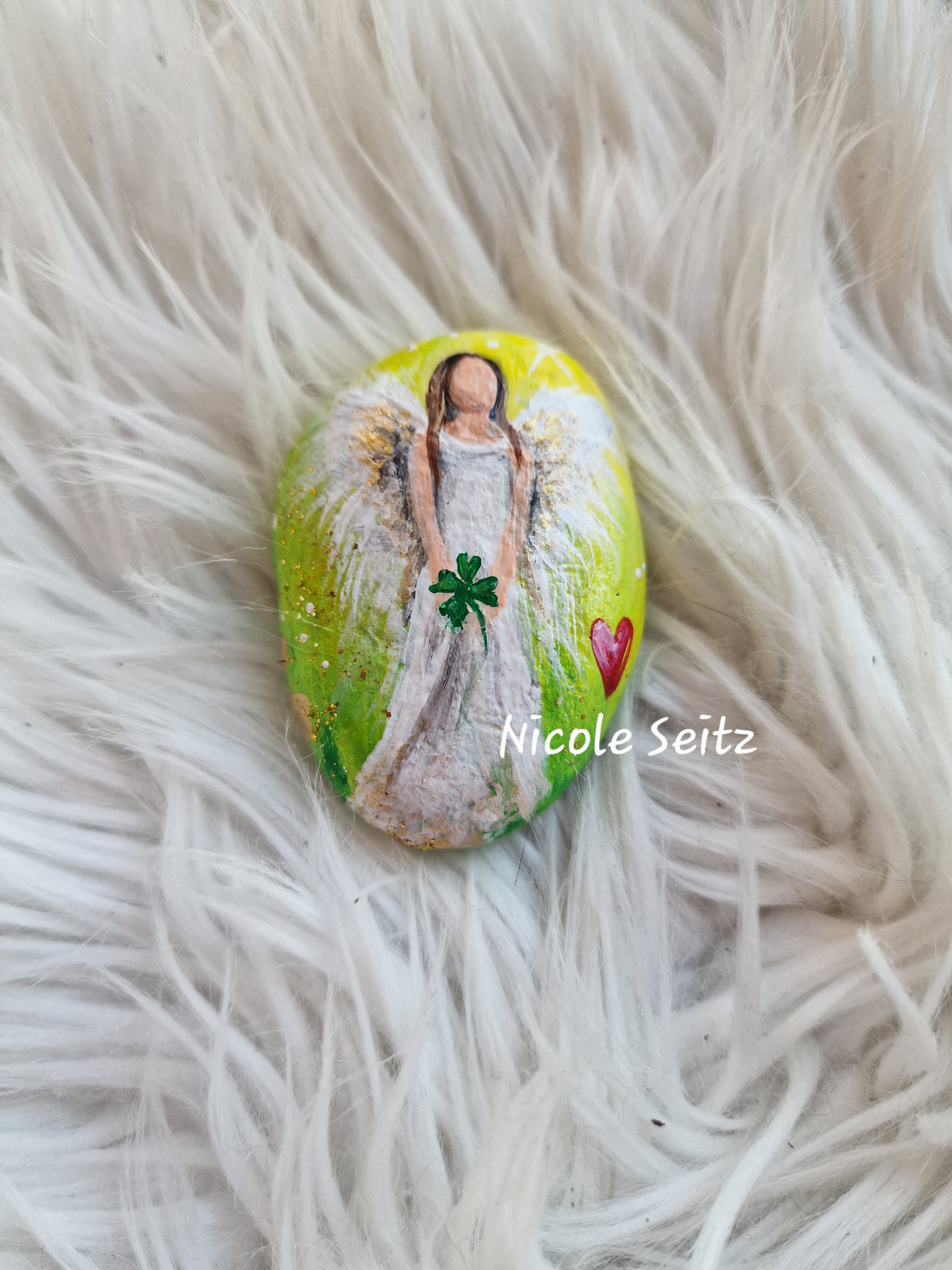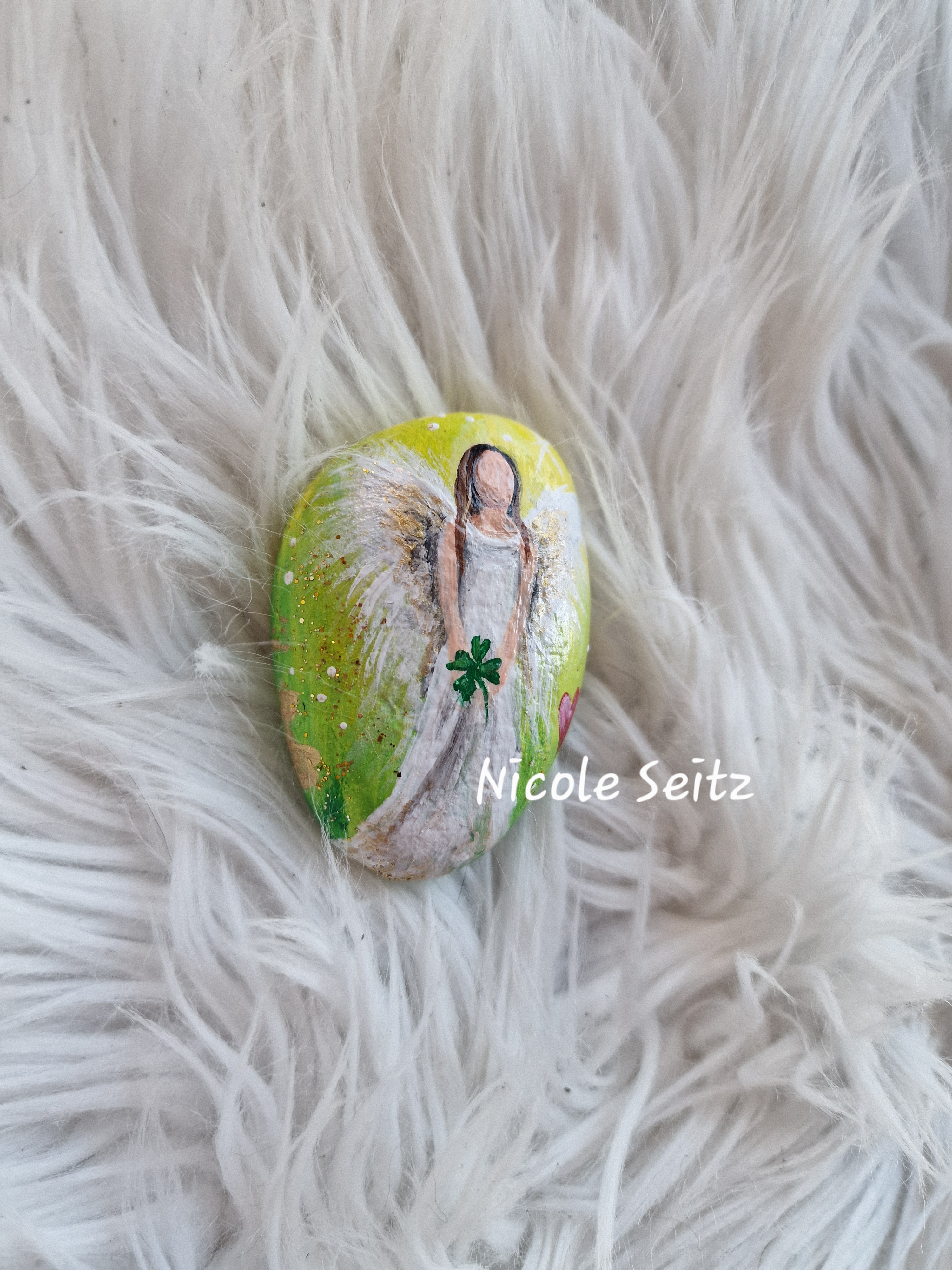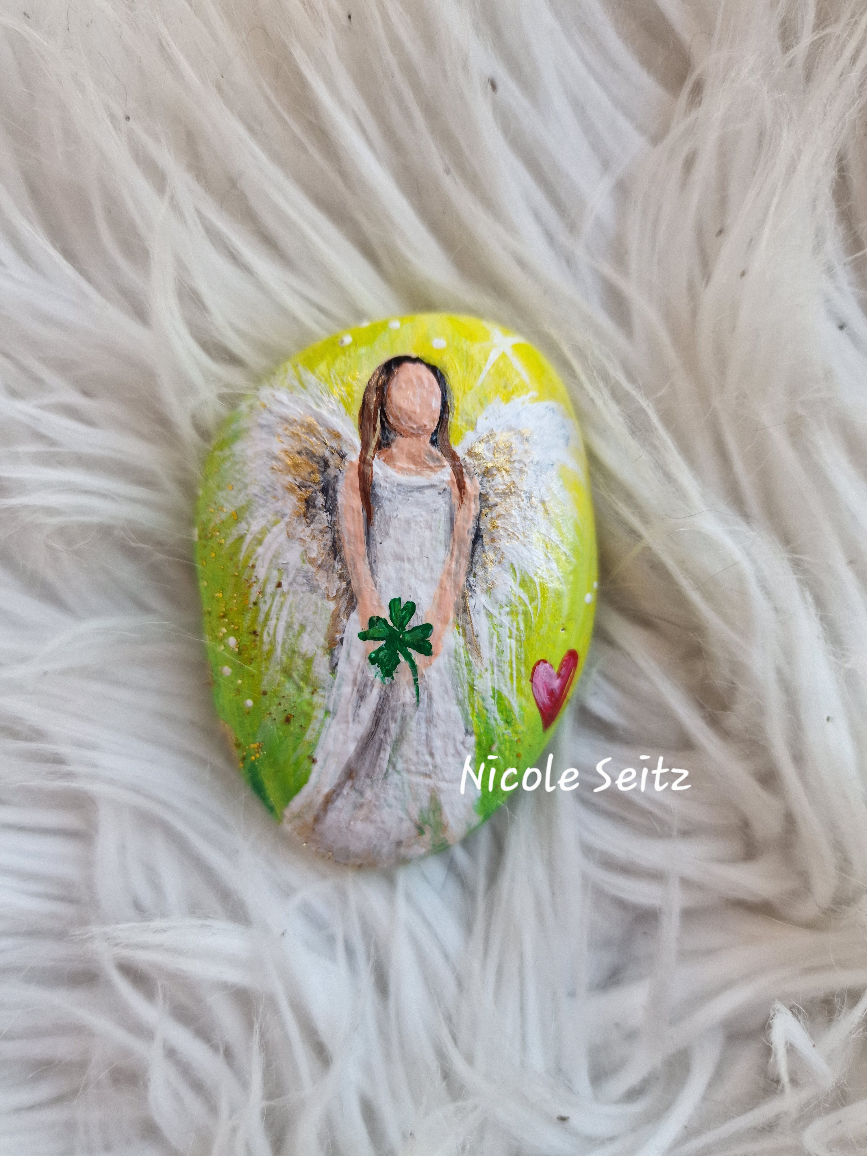 Glücksengel auf Stein gemalt * 6 x 4,5 x 2 cm * Grün-Weiß * Herz Kleeblatt