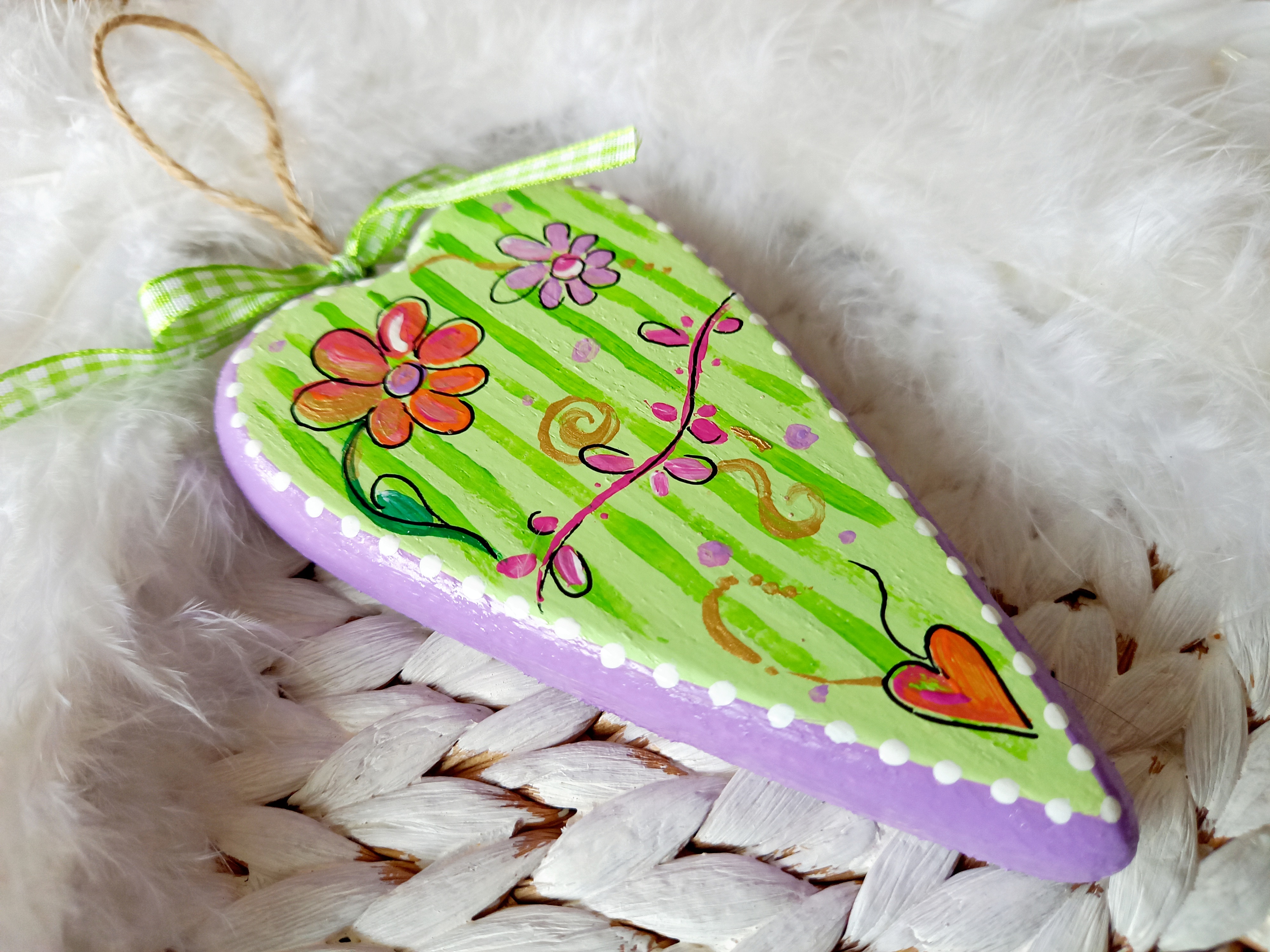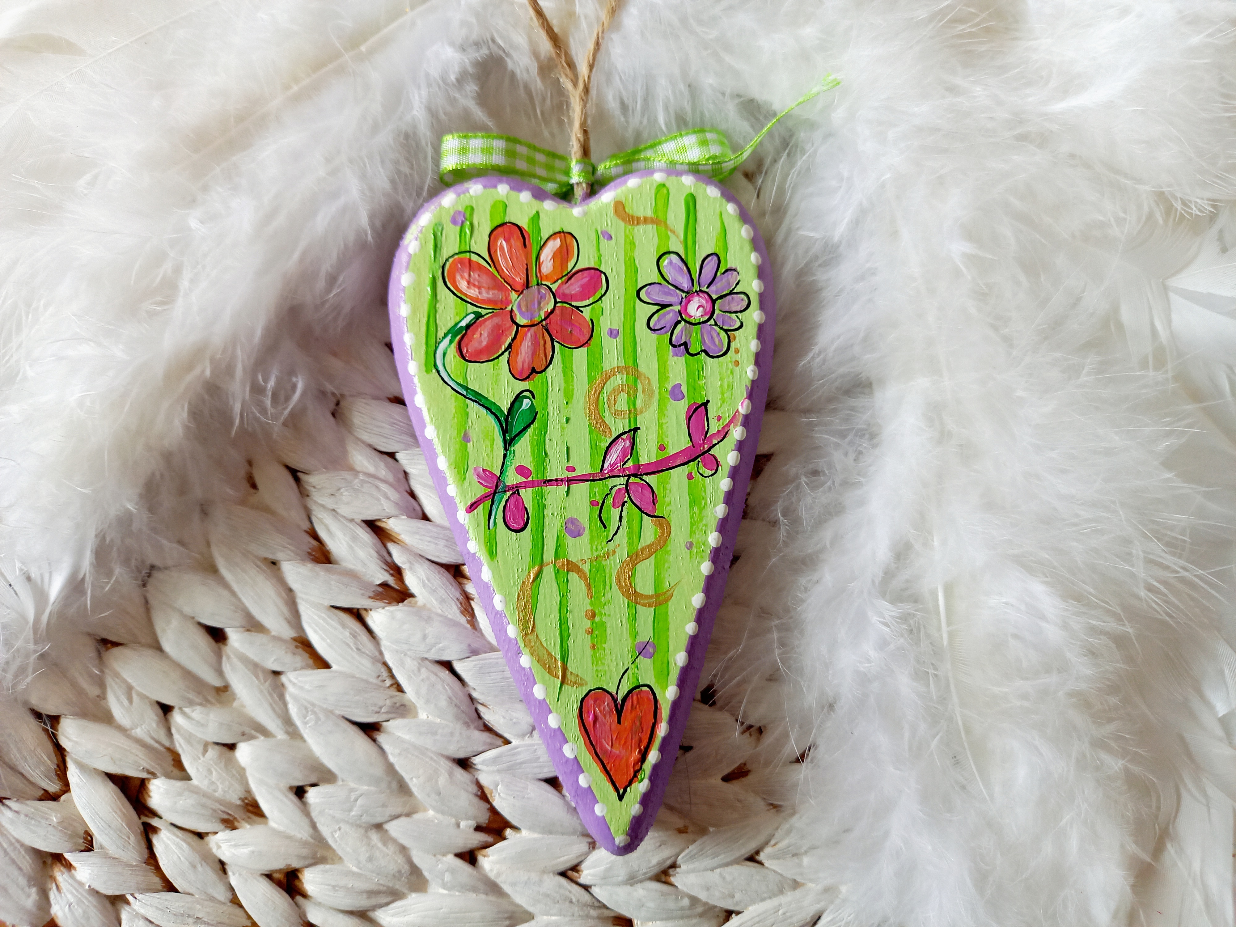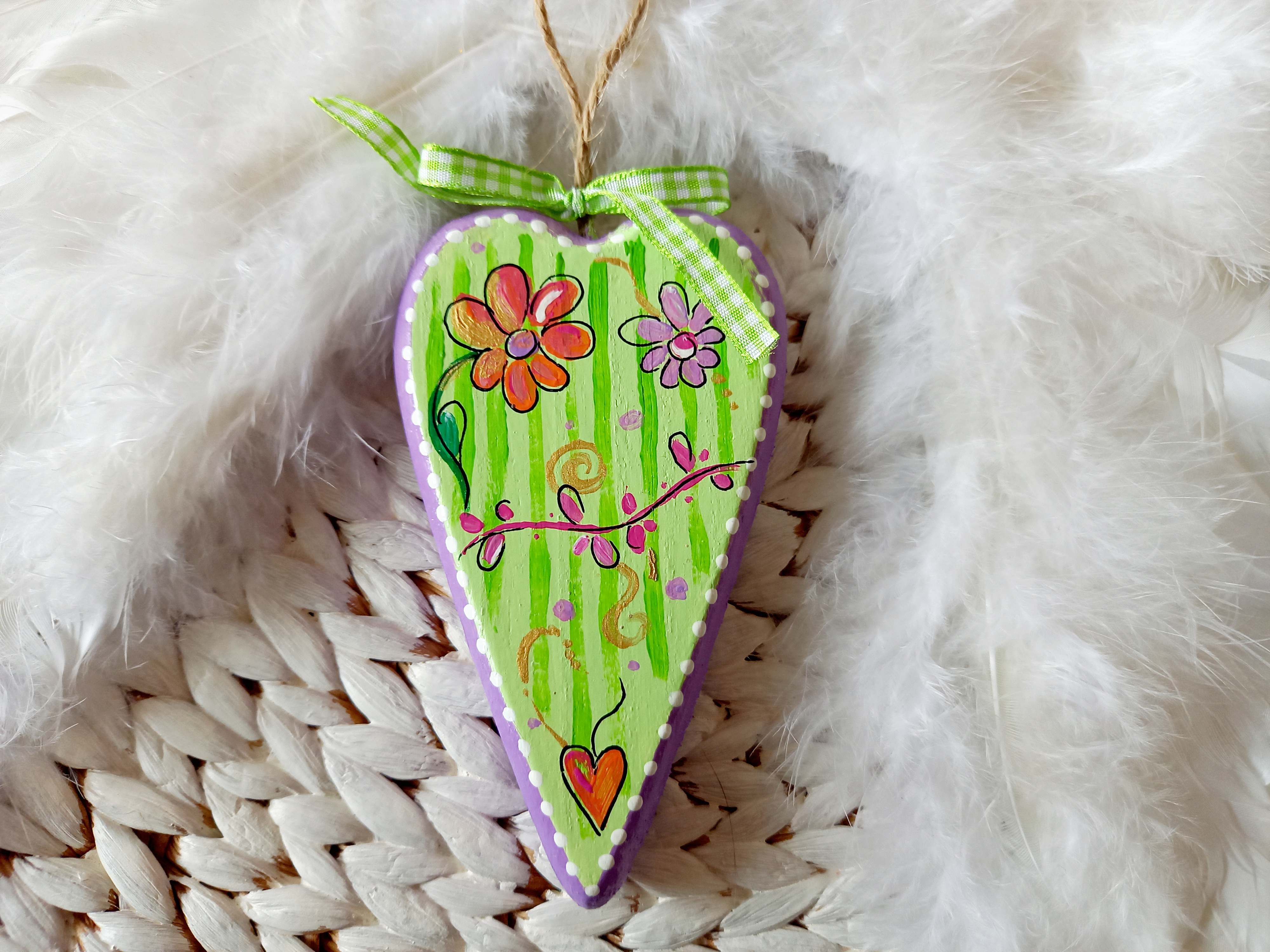 Material: Holzherz, Acrylfarben, Acryllack, Schleifenband