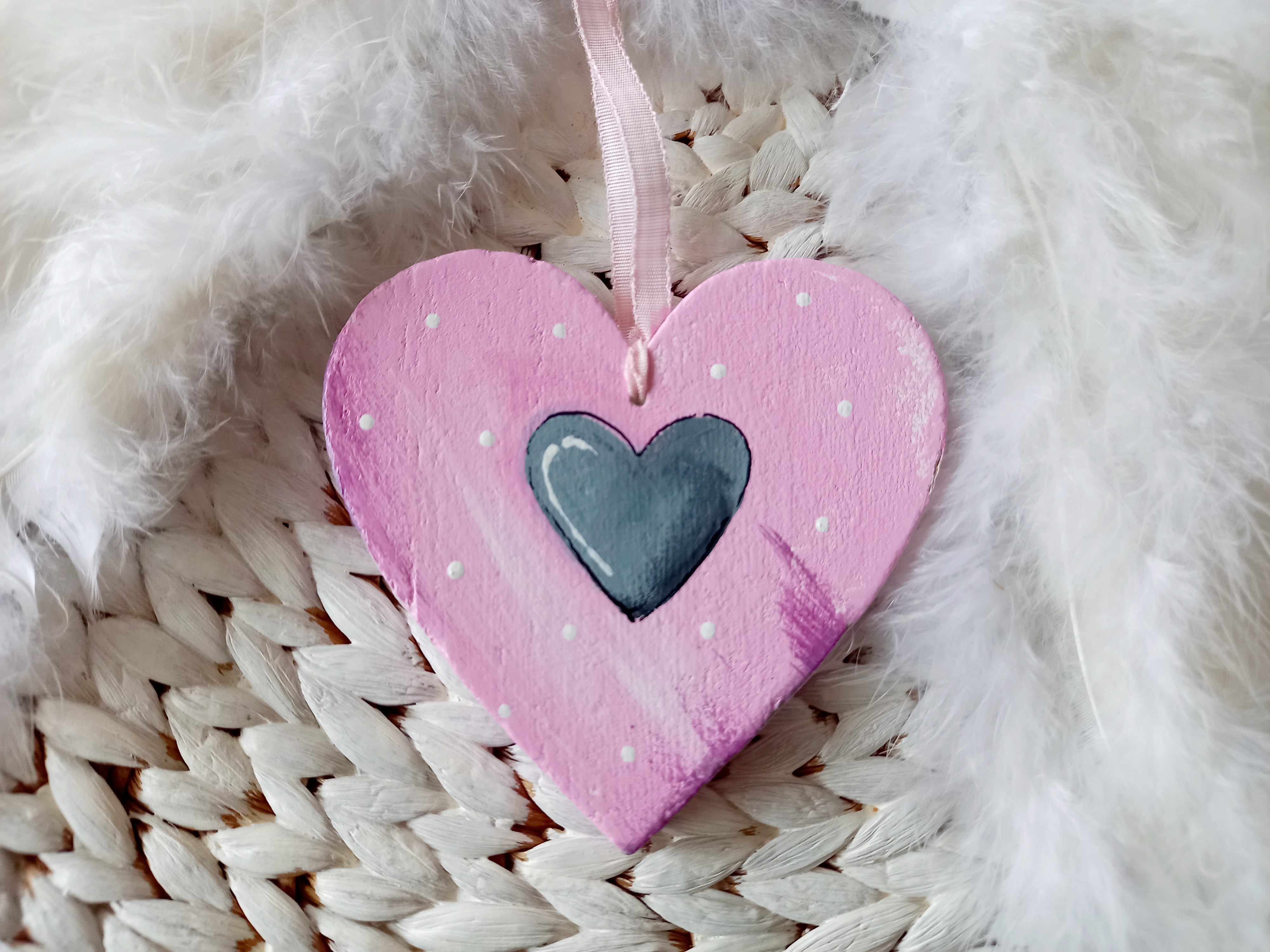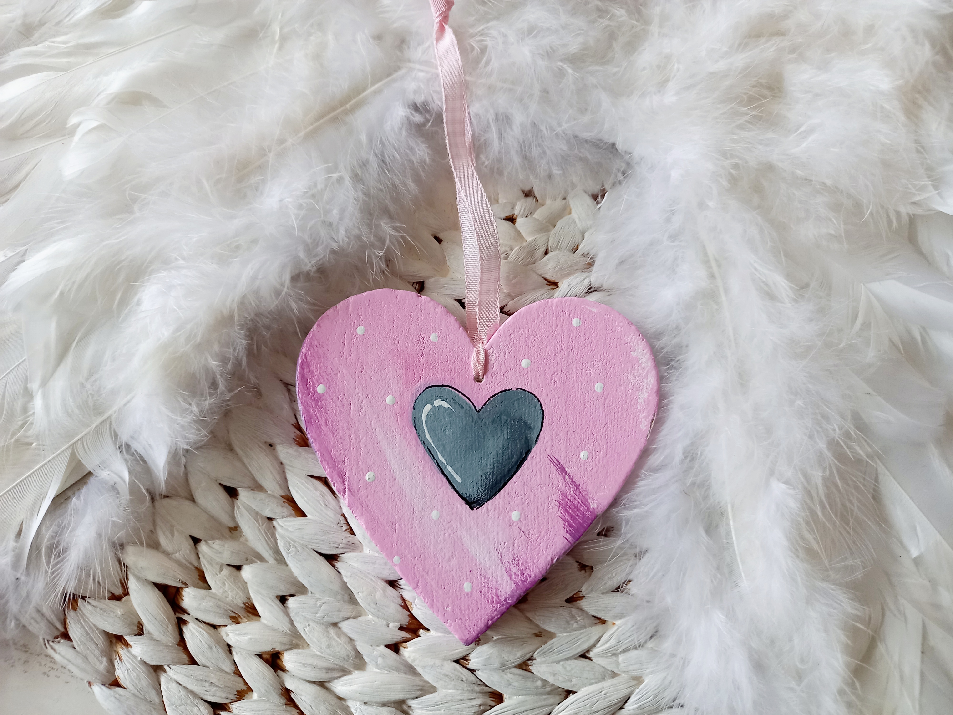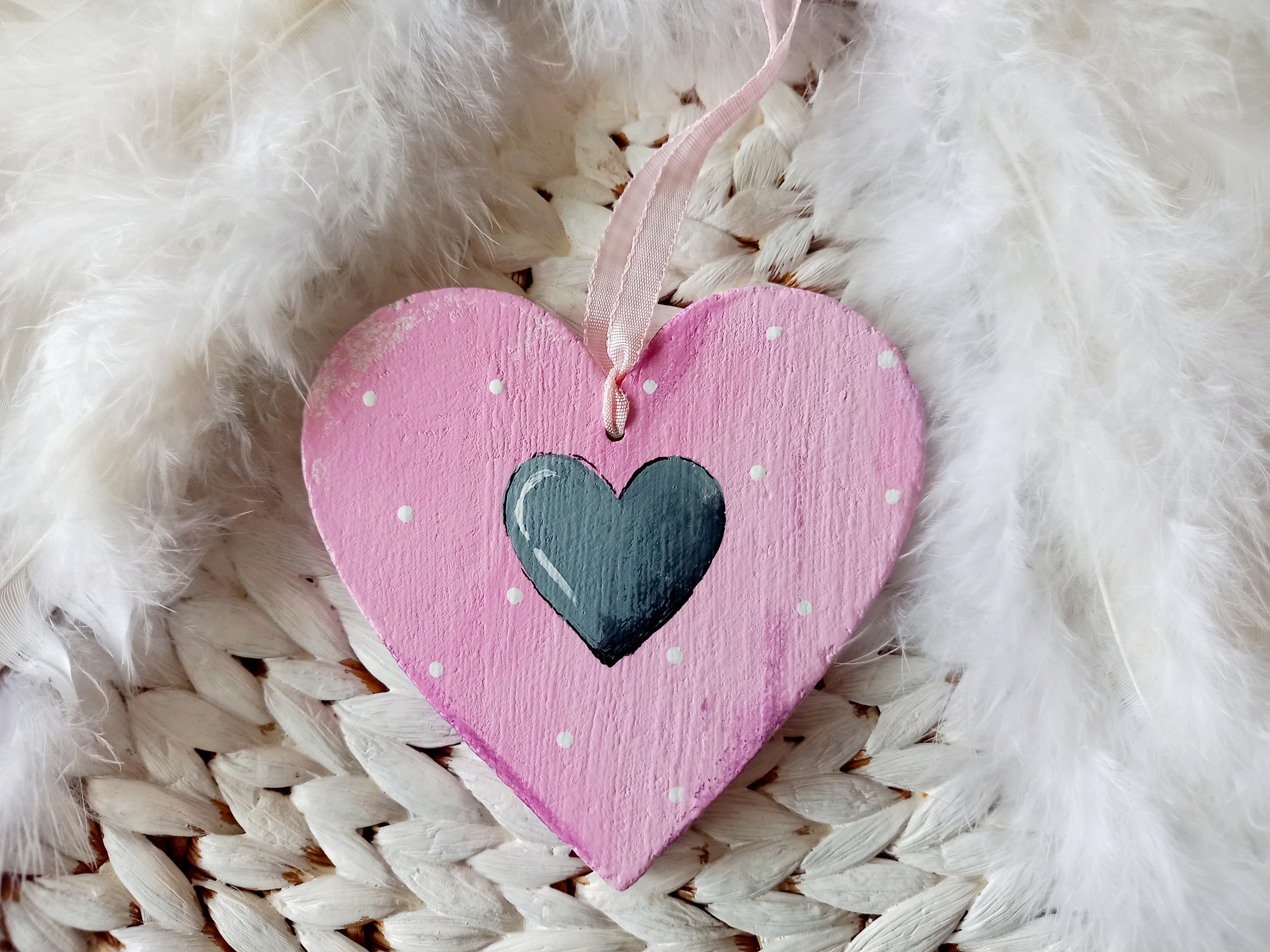 - Material: Holzherz, Acrylfarben, Acryllack, Schleifenband