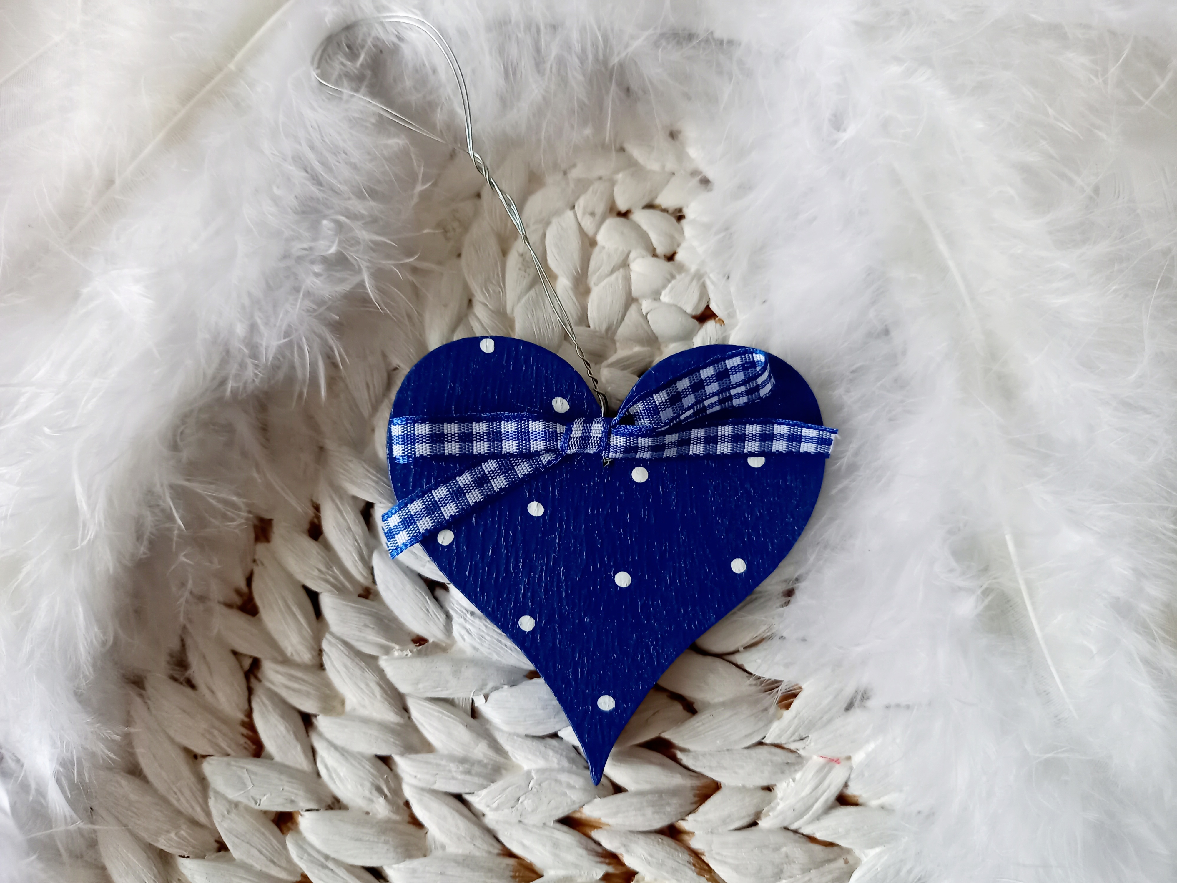 - Material: Holzherz, Acrylfarben, Acryllack, Schleifenband
