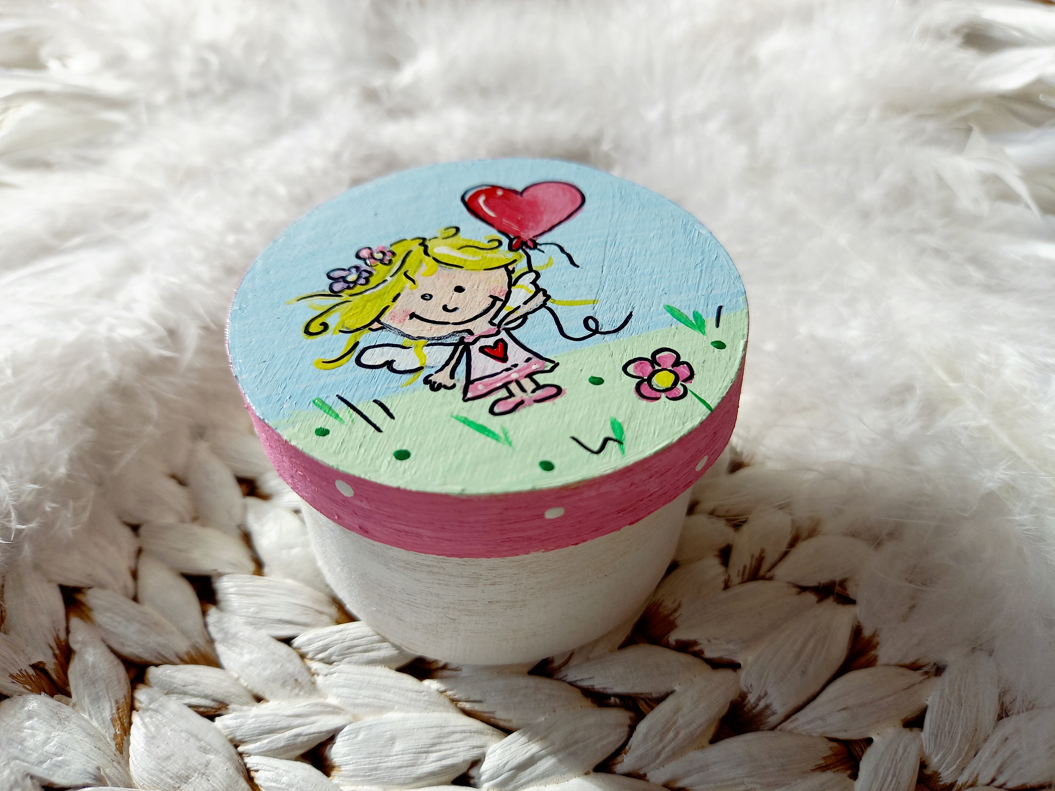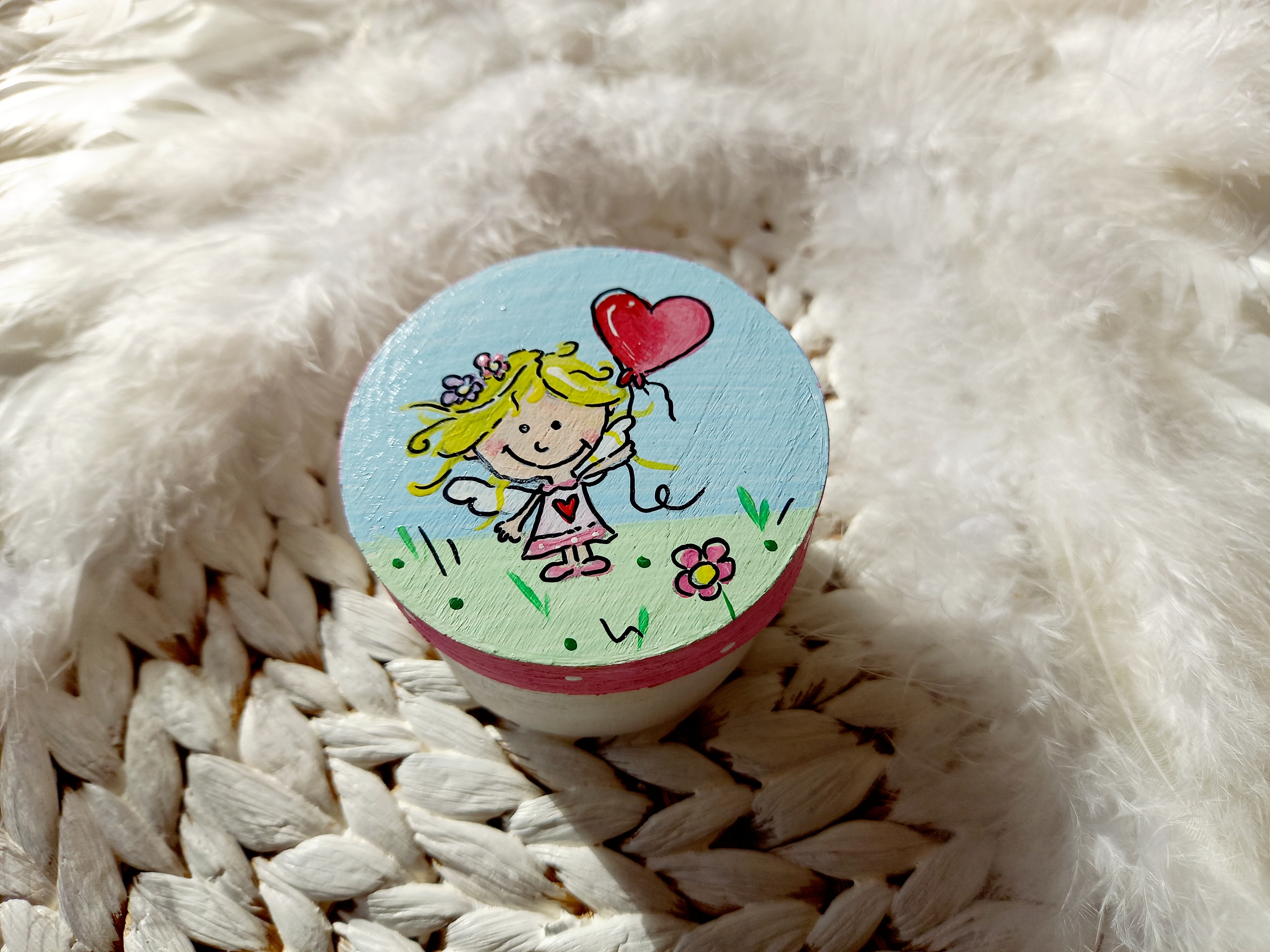 Süße Holzdose mit meinem Engelchen bemalt z.B. für kleine Geschenke, als Zahndose… Farben: Pink, Hellblau, Hellgrün, Bunt Motiv: Engel, Sonne, Blumen, Herz, Pünktchen Größe: 6,1 x 3,7 cm