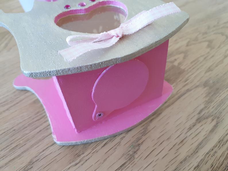 Material: Sparkasse aus Holz, Glitzersteinchen, Schleifenband, Acrylfarben