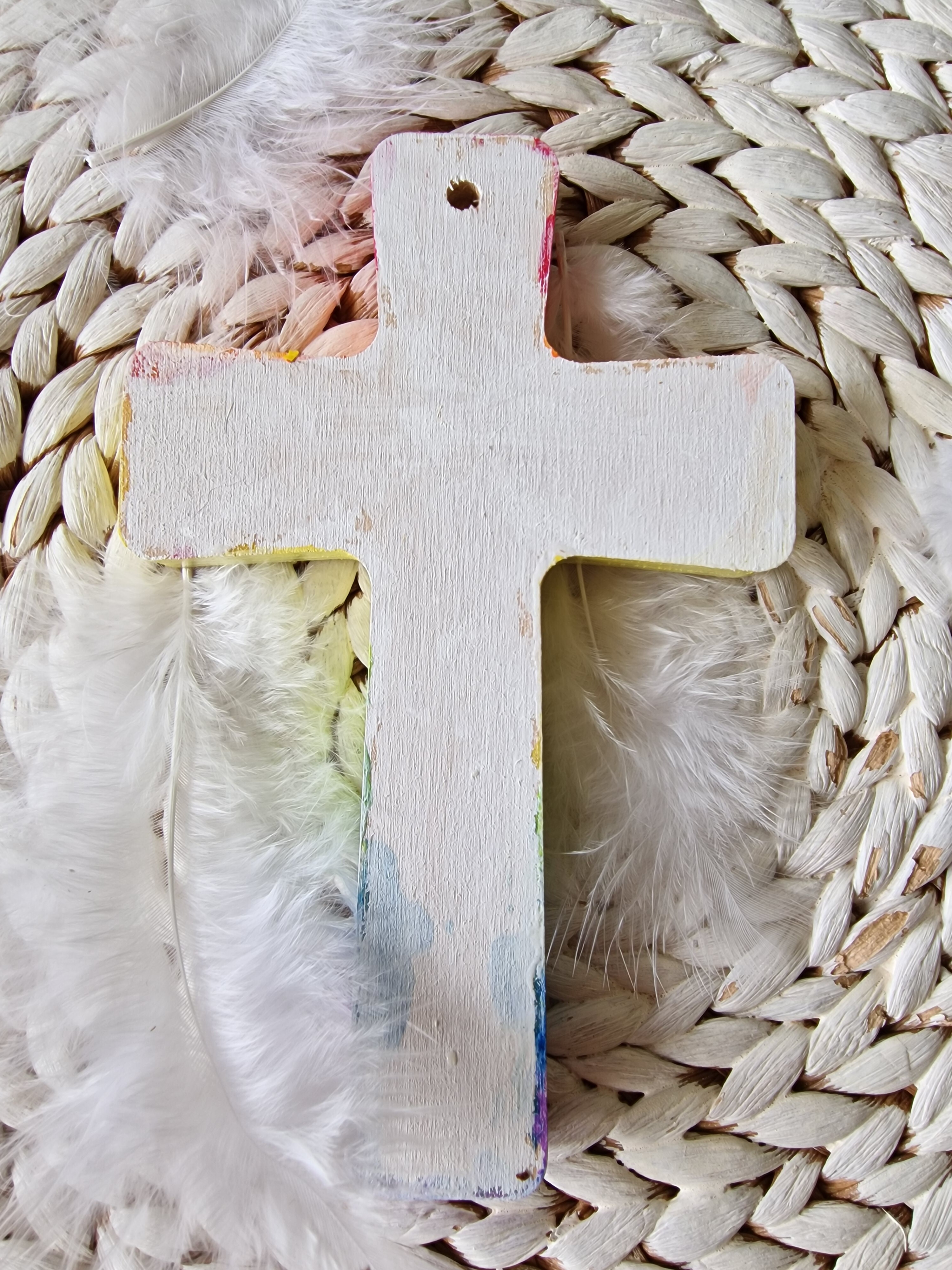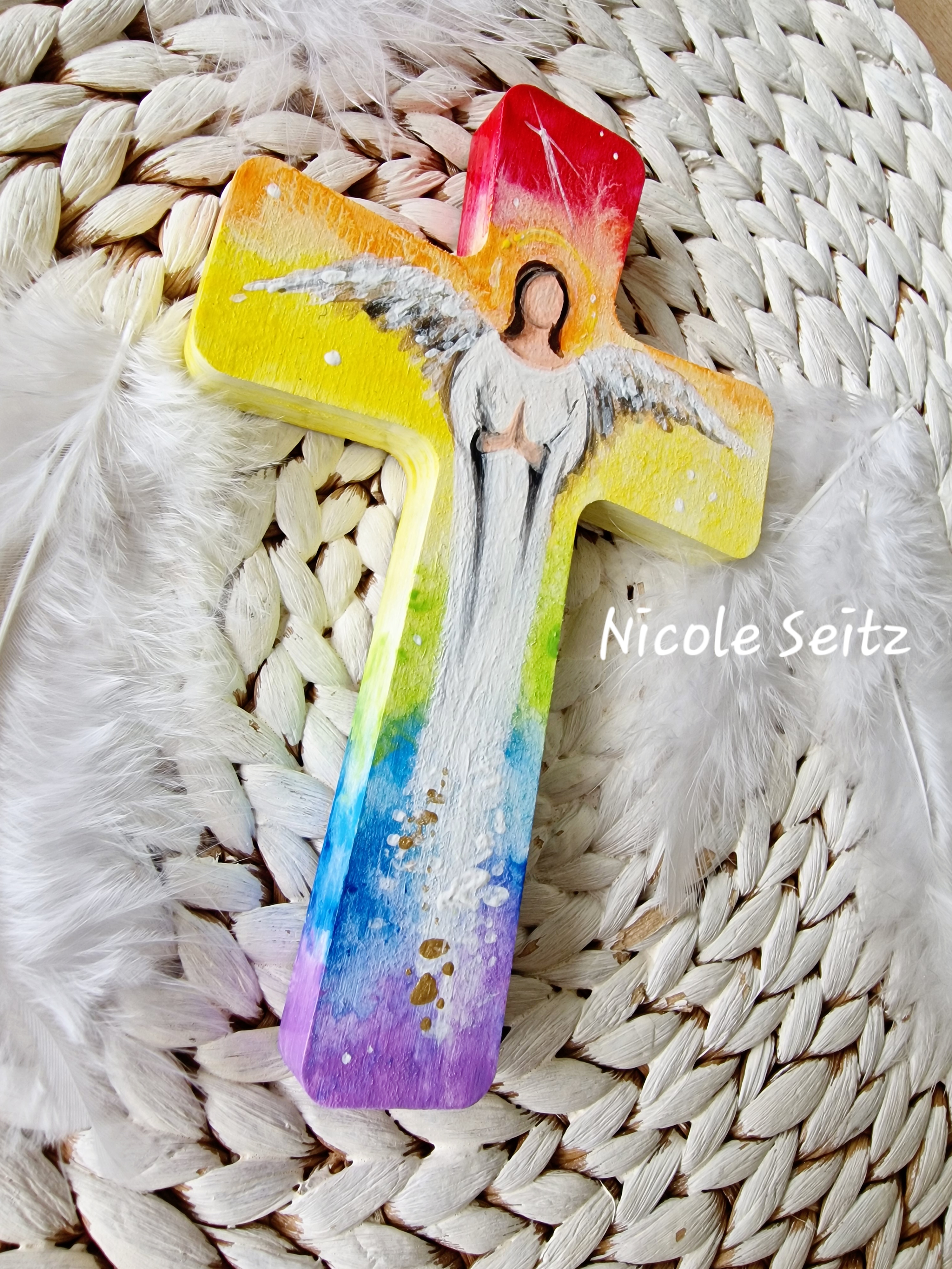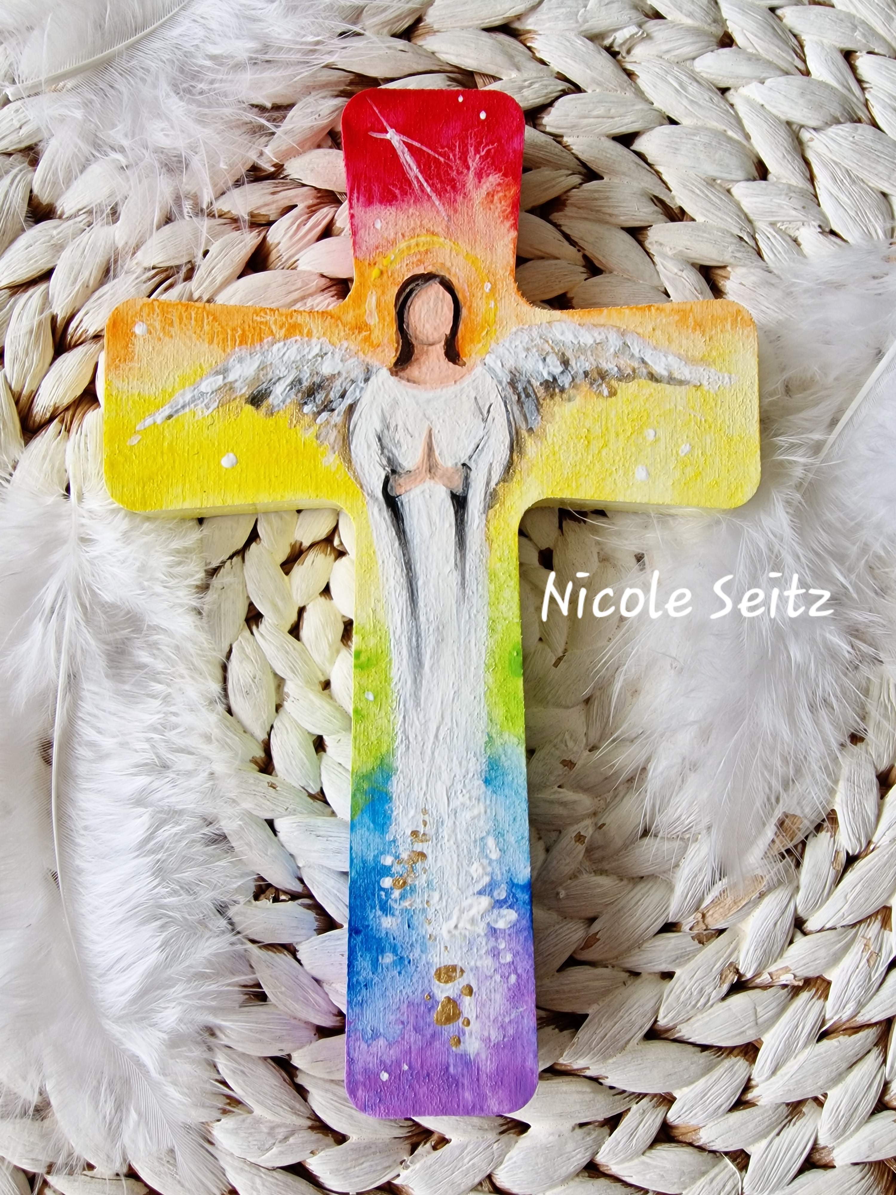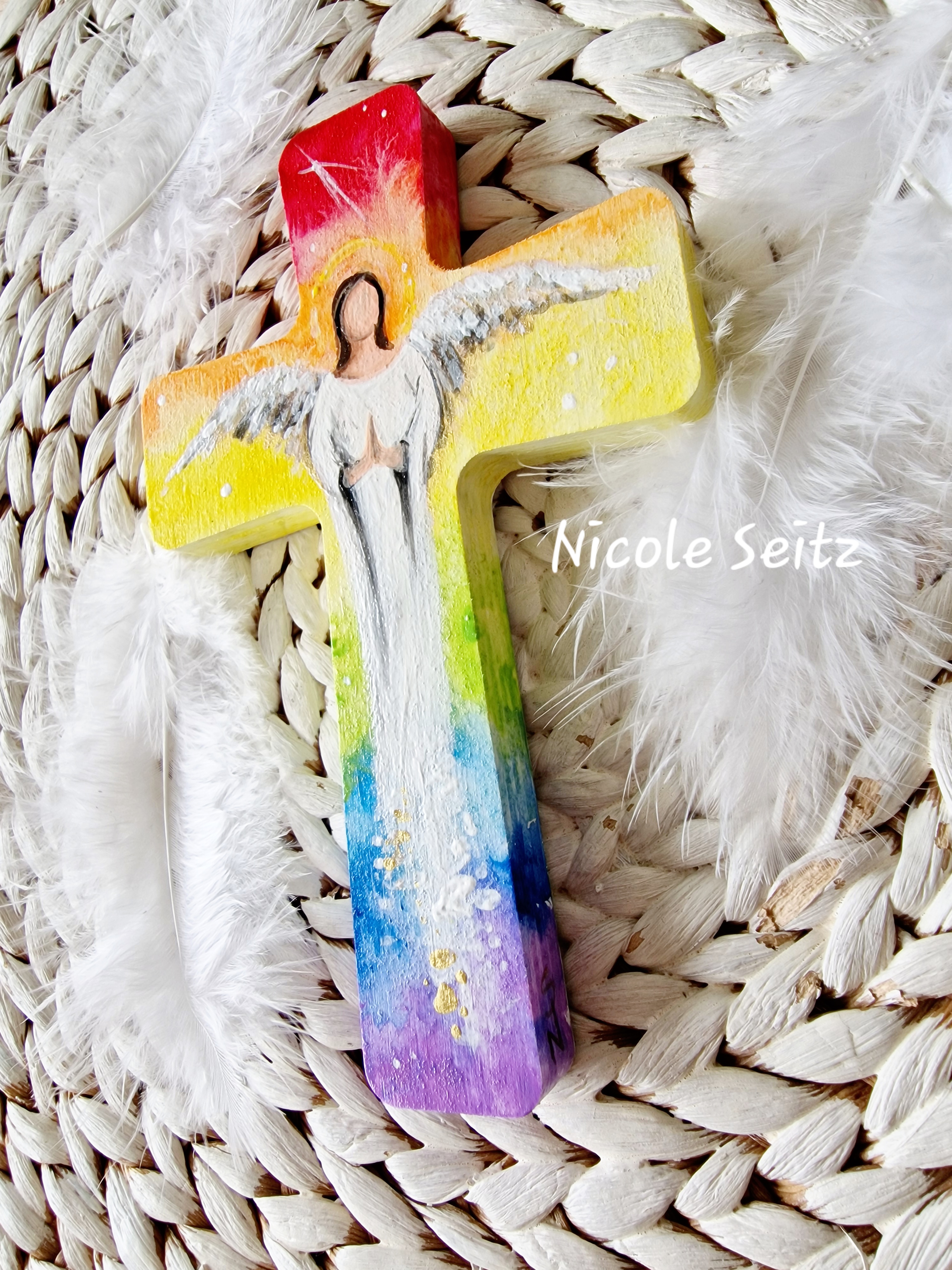 Holzkreuz * Regenbogen-Engel * bemalt * 15,5 x 10 cm