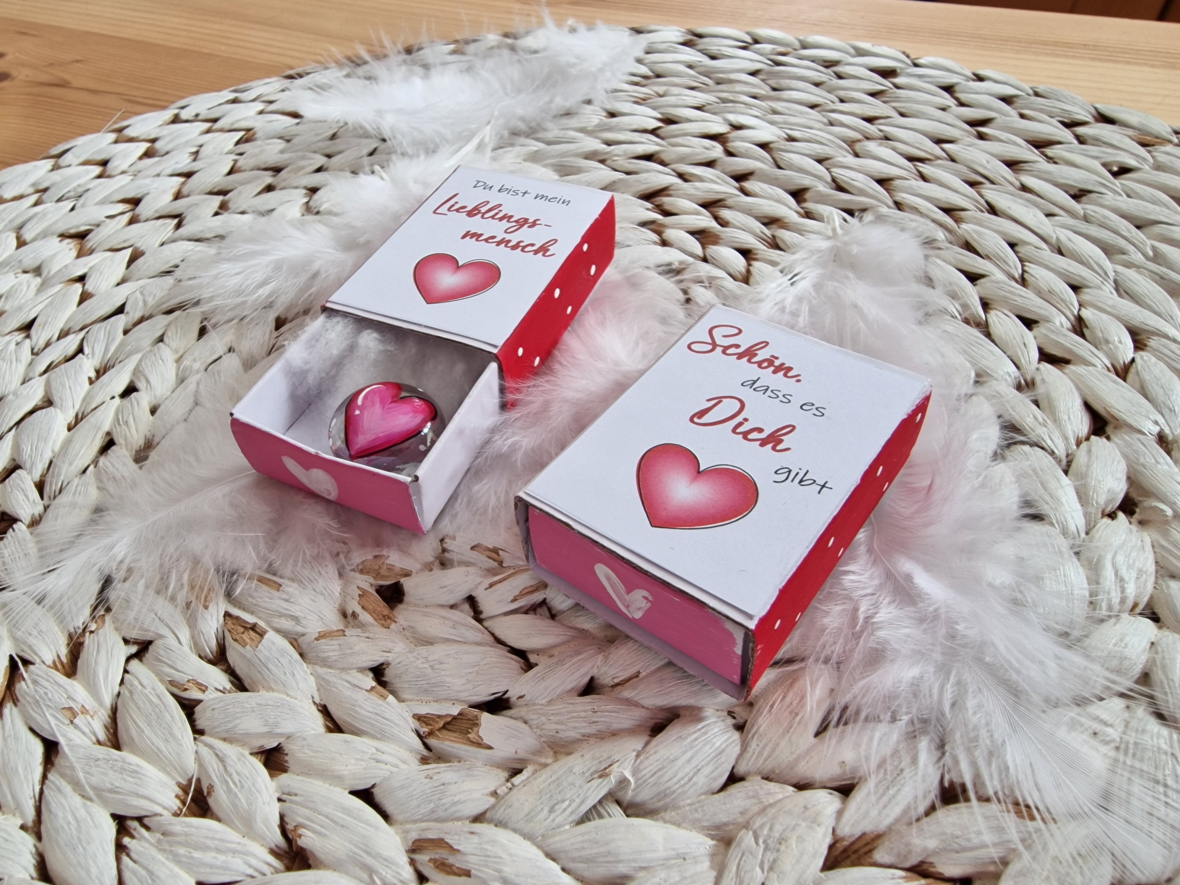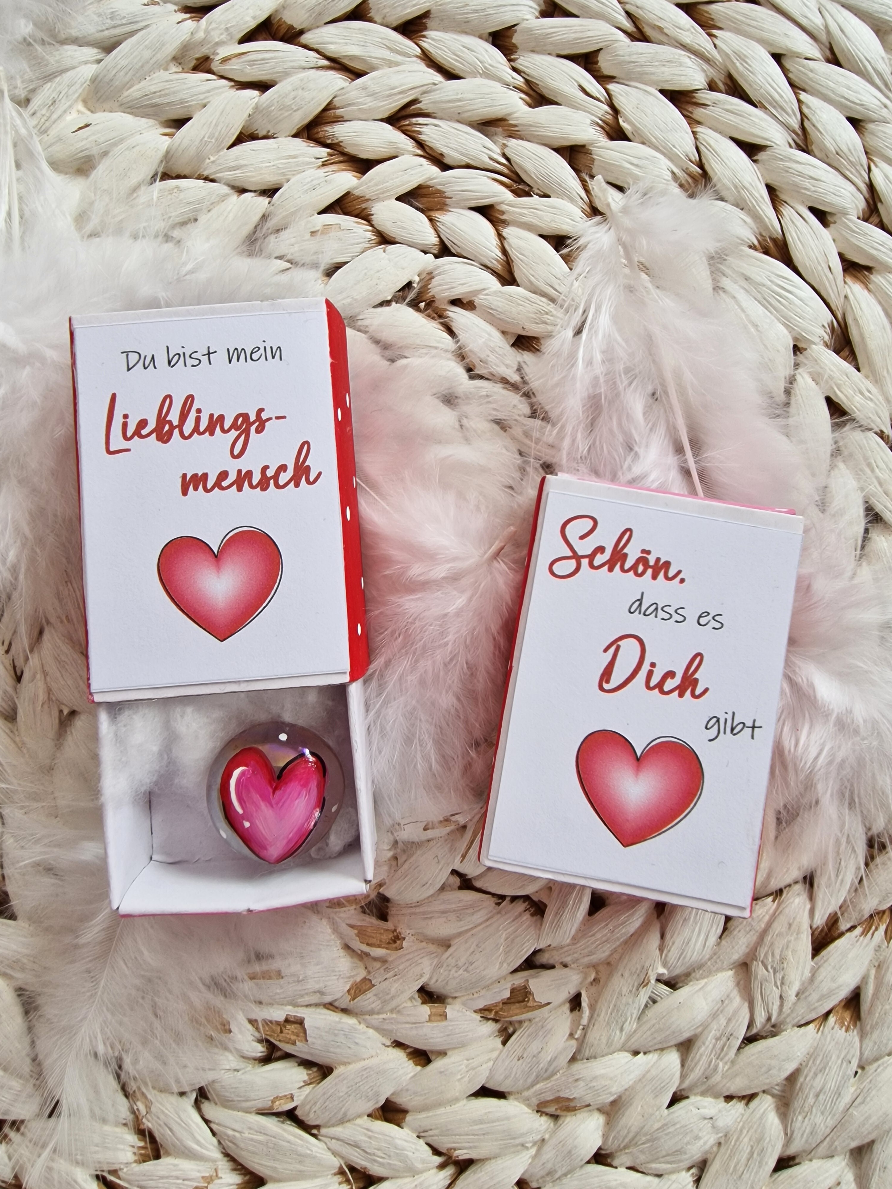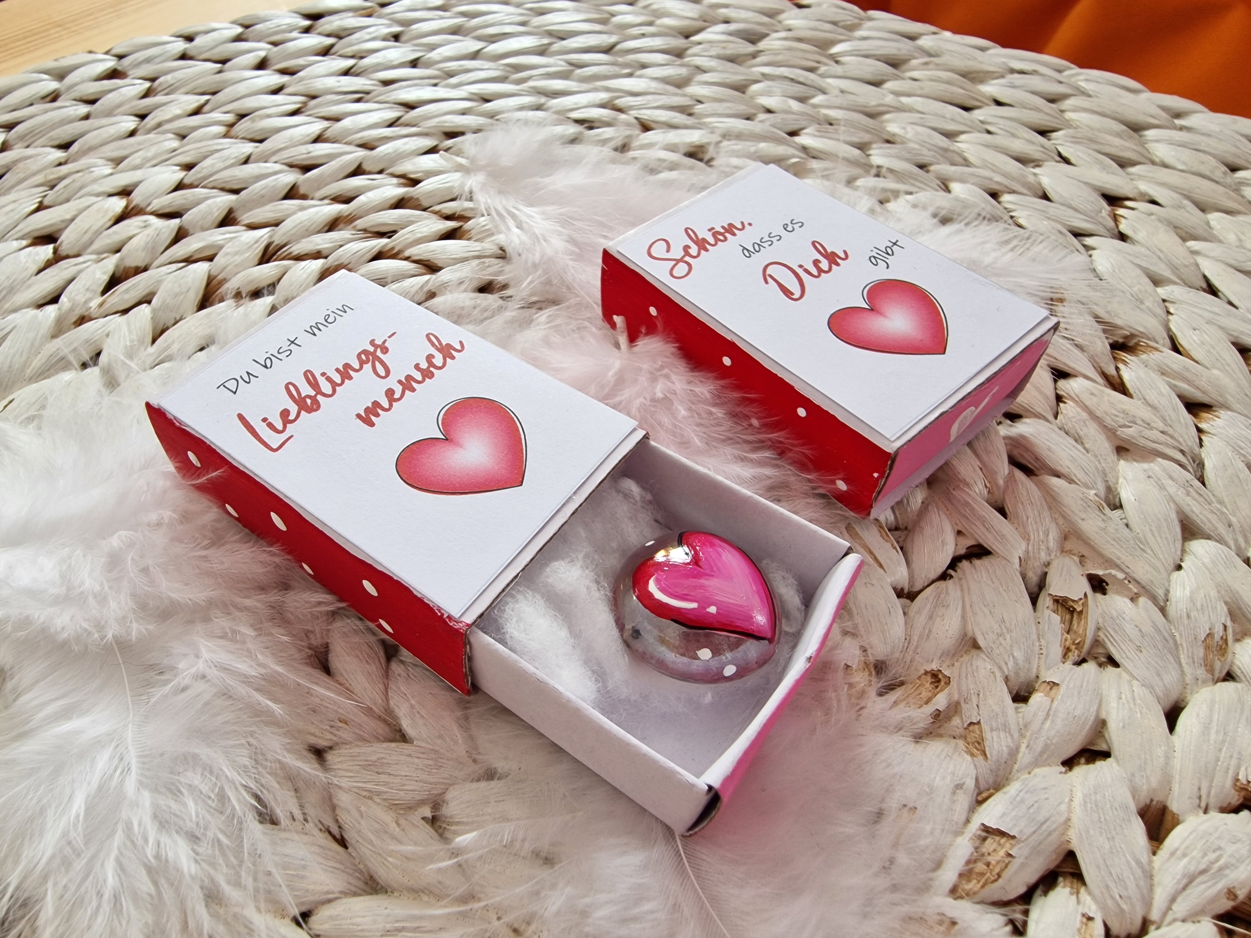 Glasstein * 1,8 cm * Du bist mein Lieblingsmensch / Schön, dass es Dich gibt * Herz * bemalt * in einer kleinen Streichholzschachtel