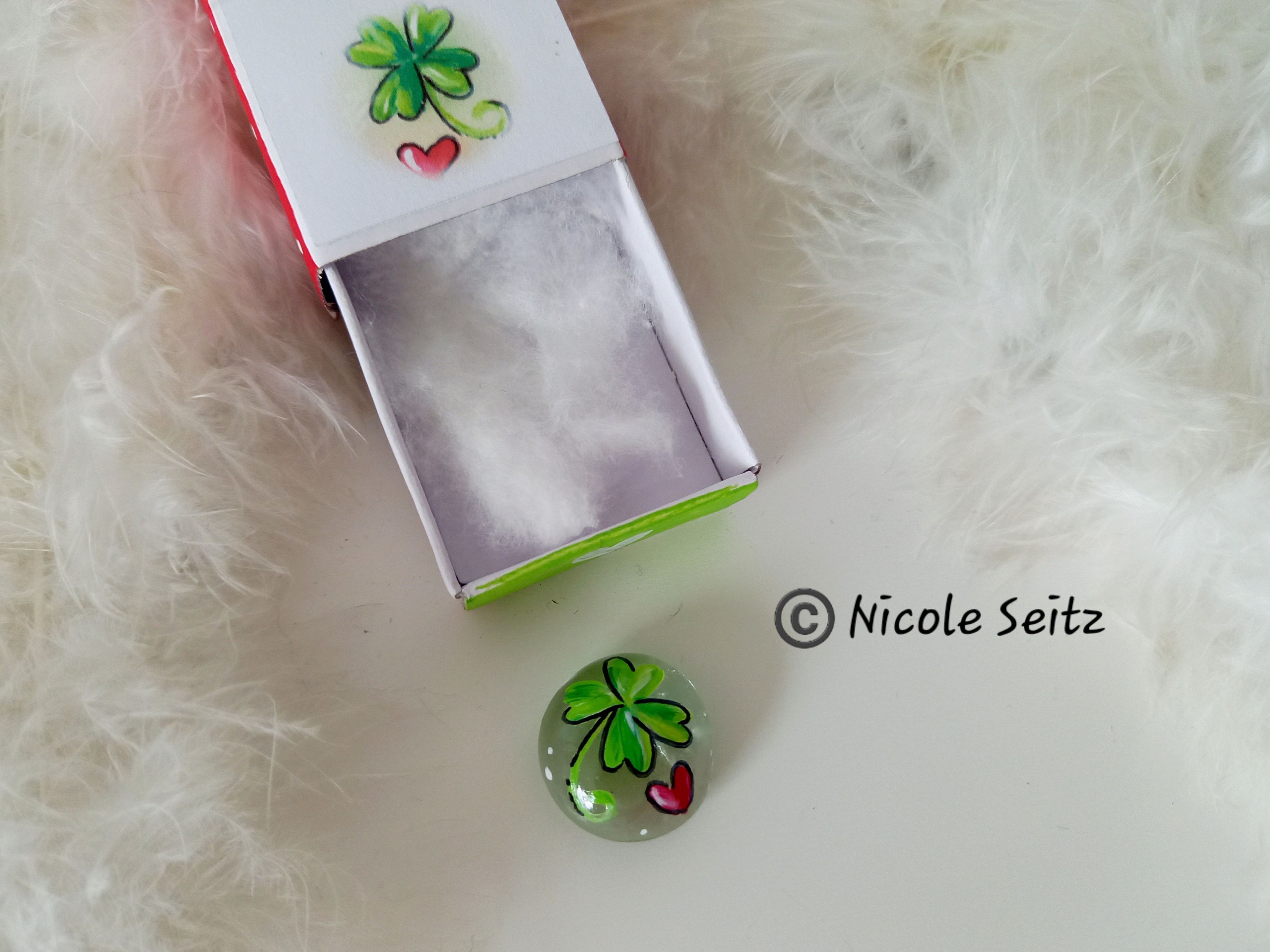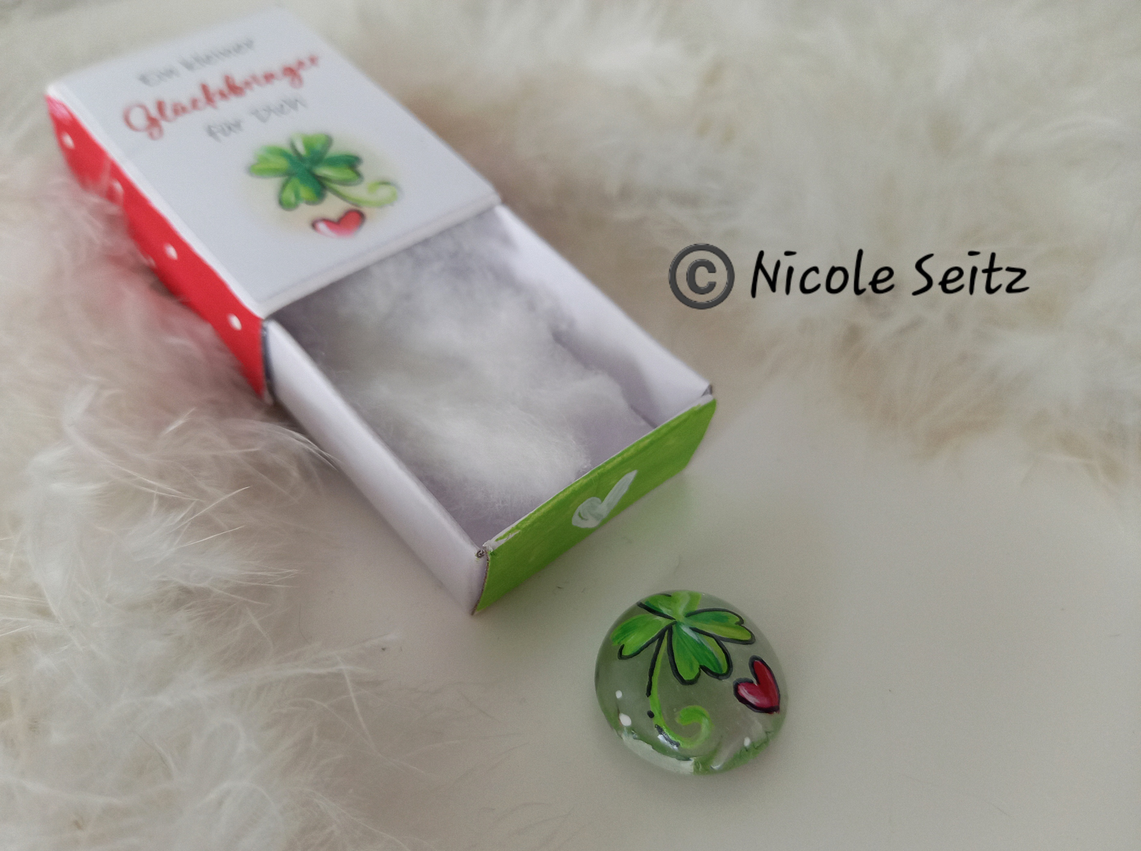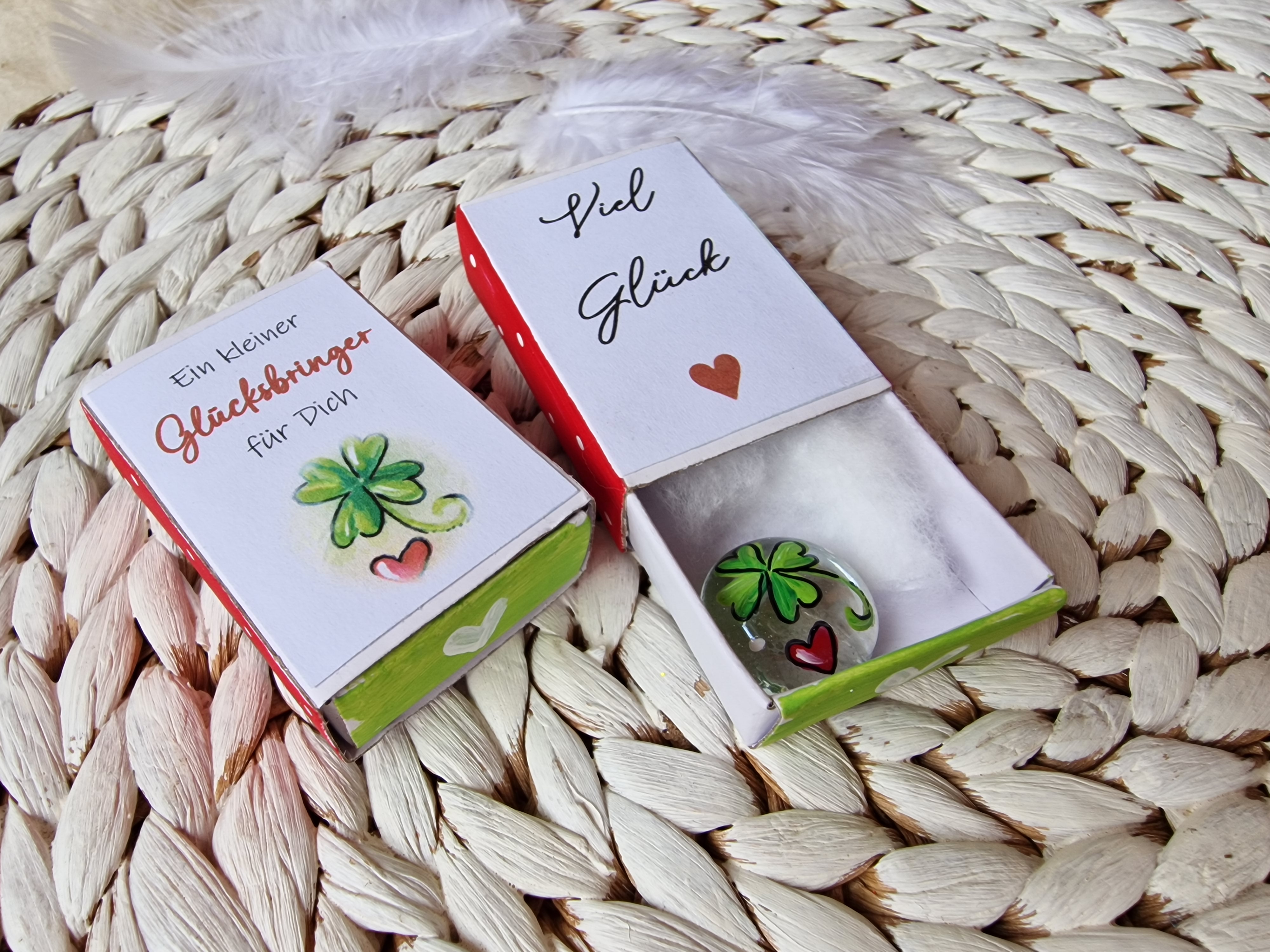 Glasstein * Glücksbringer * bemalt * in einer kleinen Streichholzschachtel * Kleeblatt