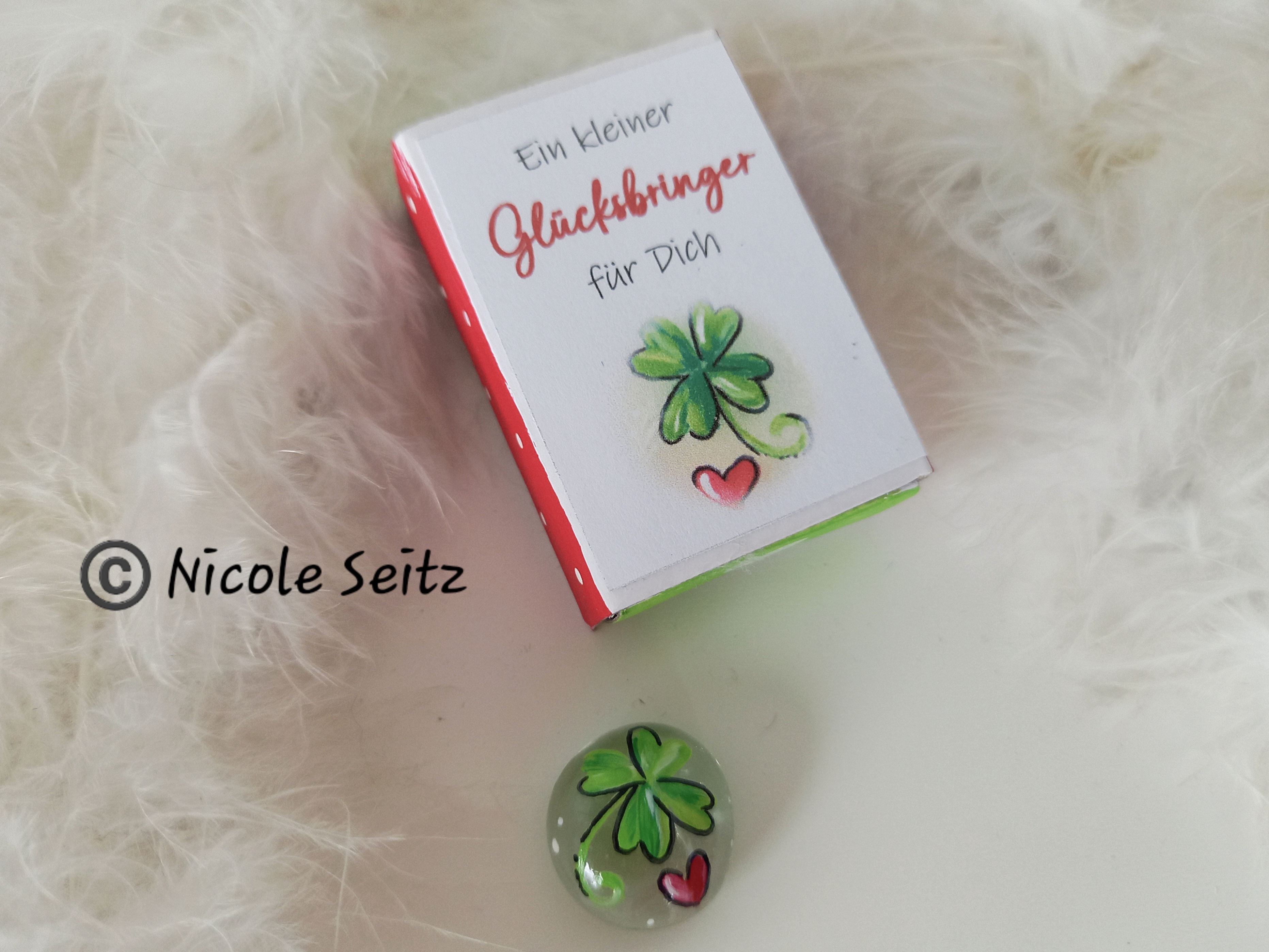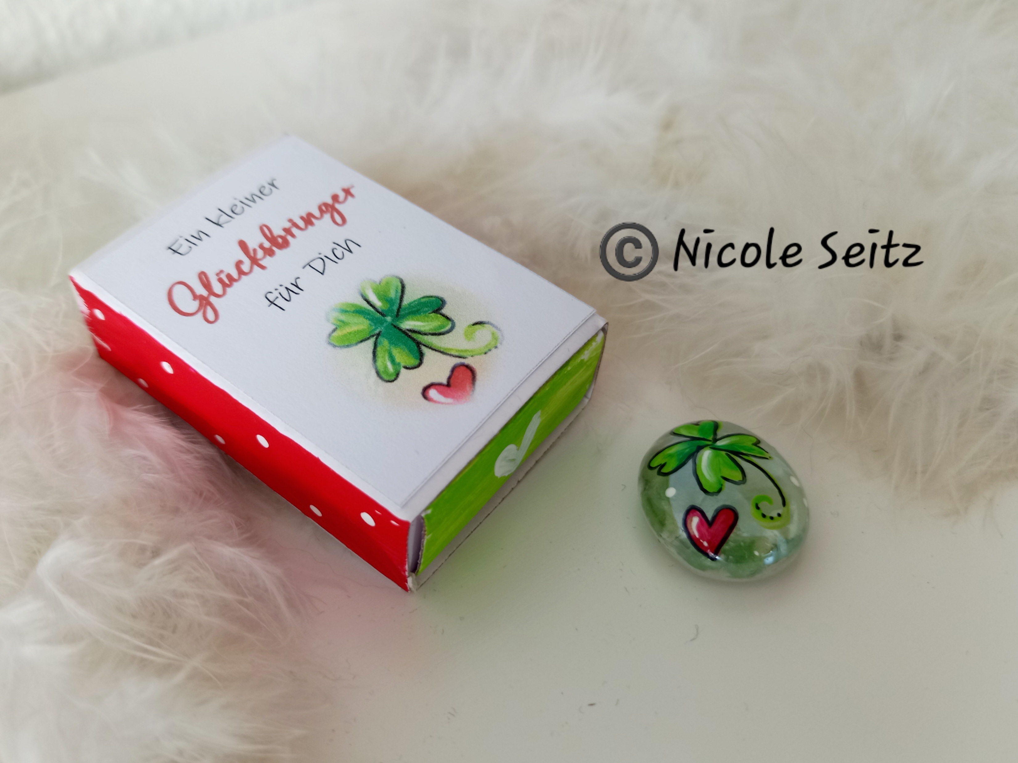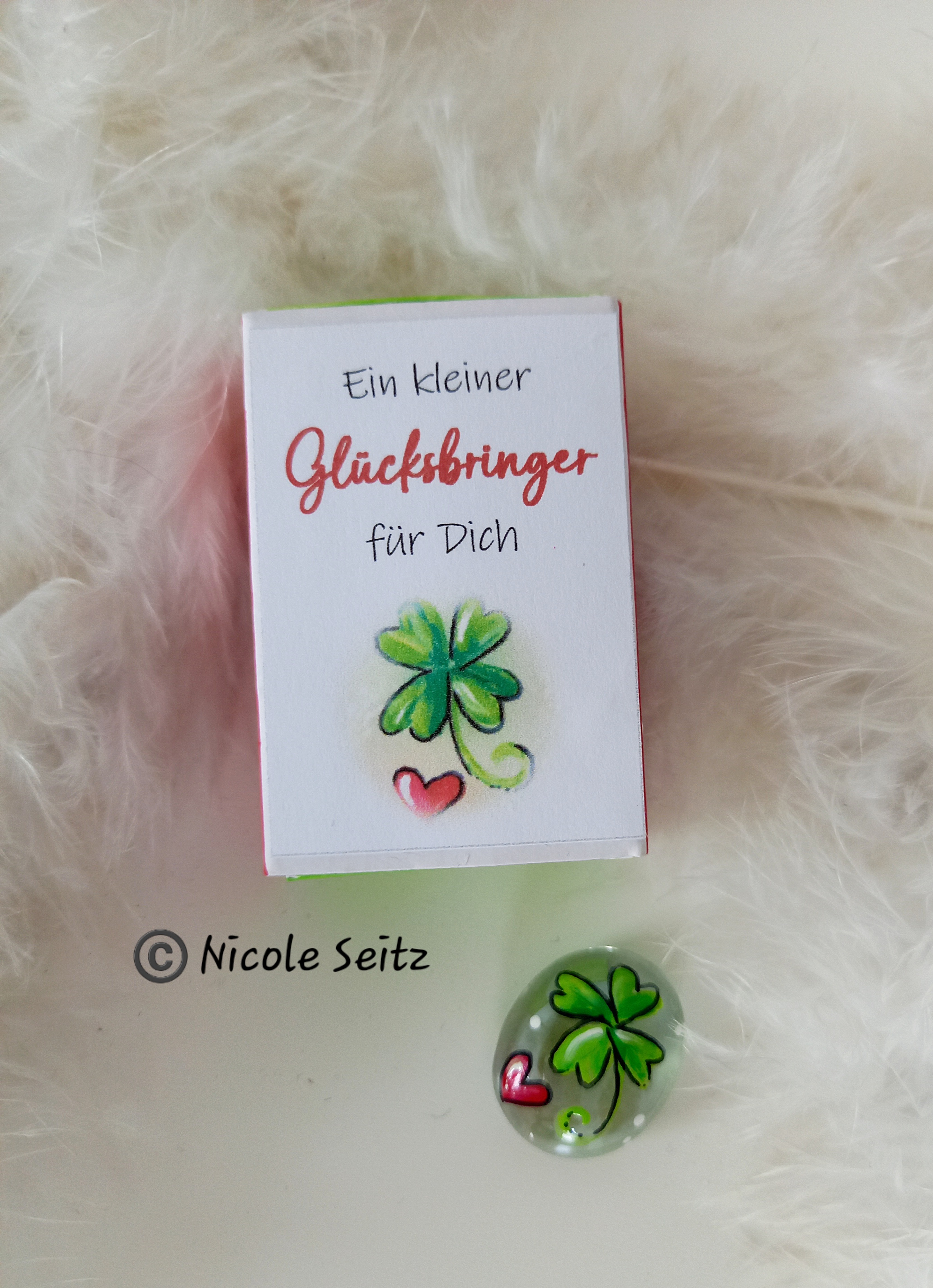 Glasstein * Glücksbringer * bemalt * in einer kleinen Streichholzschachtel * Kleeblatt
