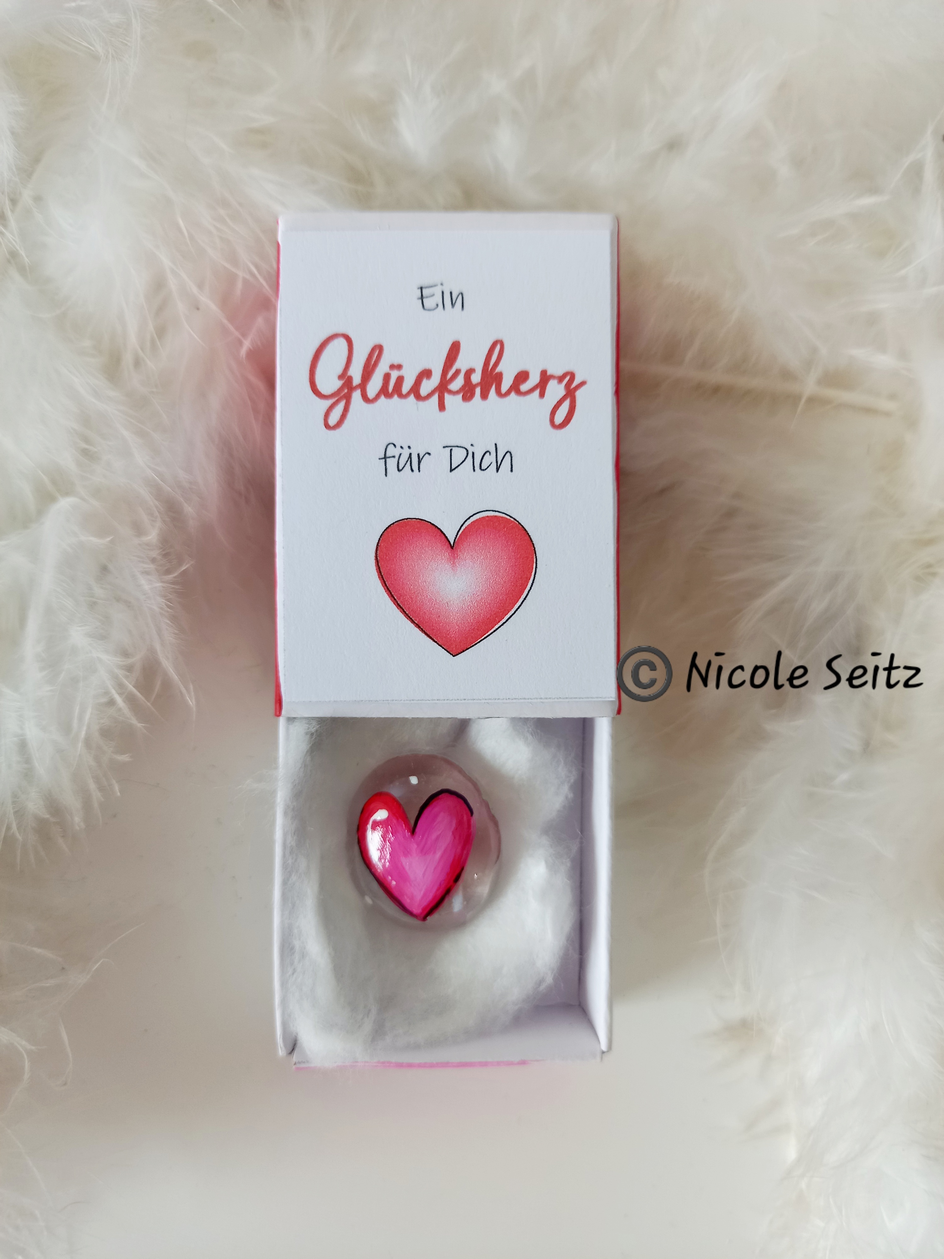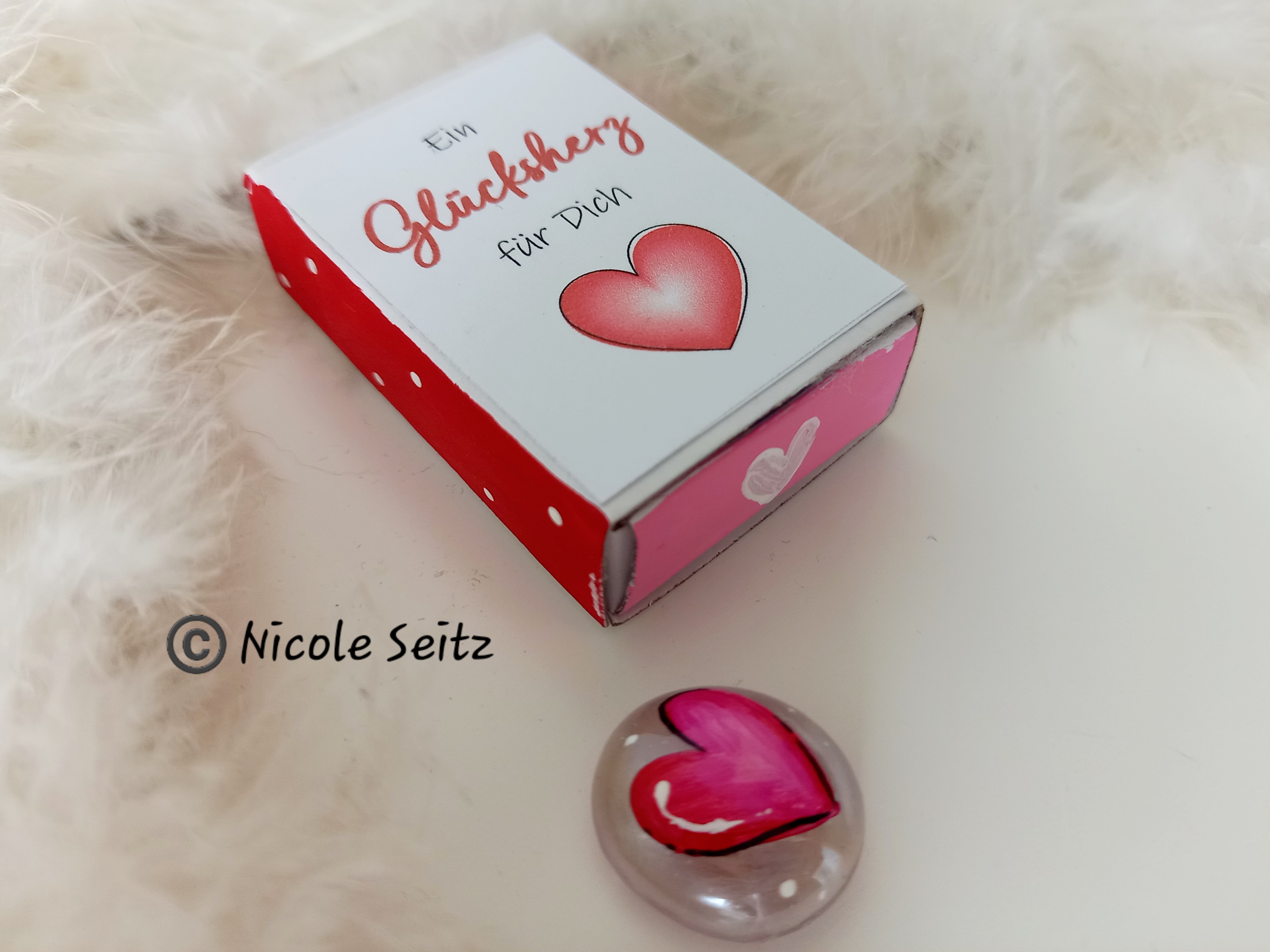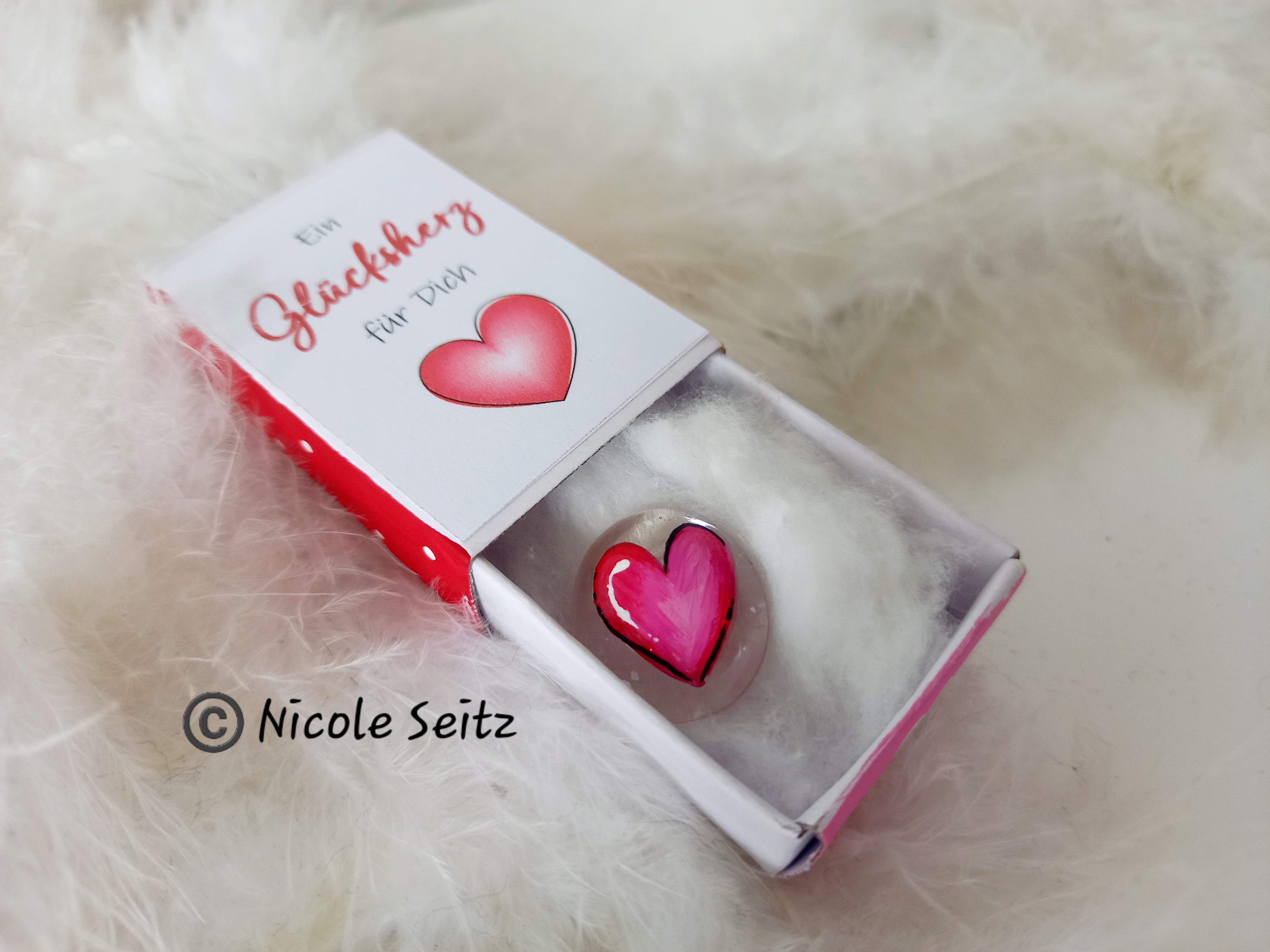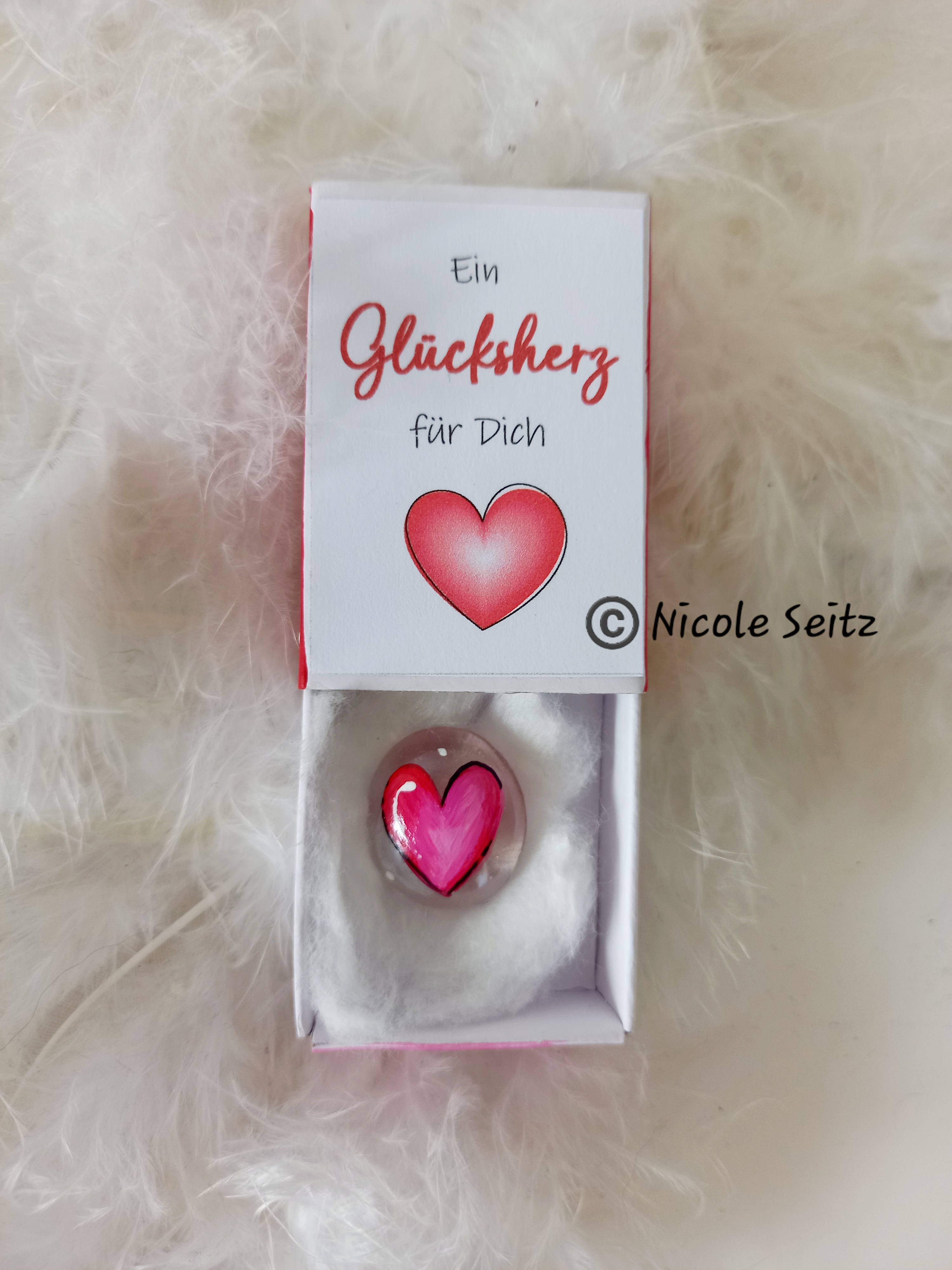 Glasstein * Glücksherz * bemalt * in einer kleinen Streichholzschachtel * Rot-Rosa