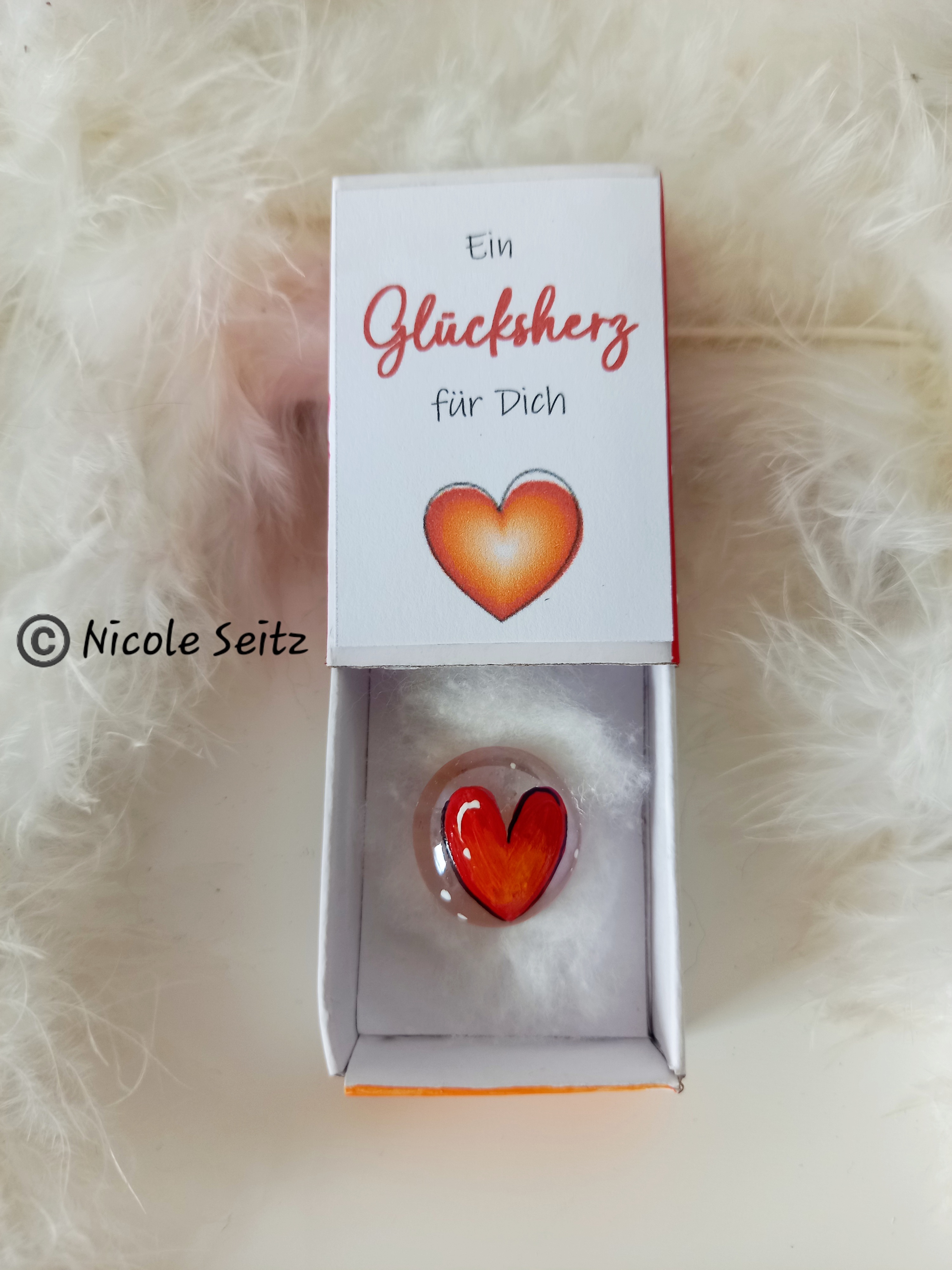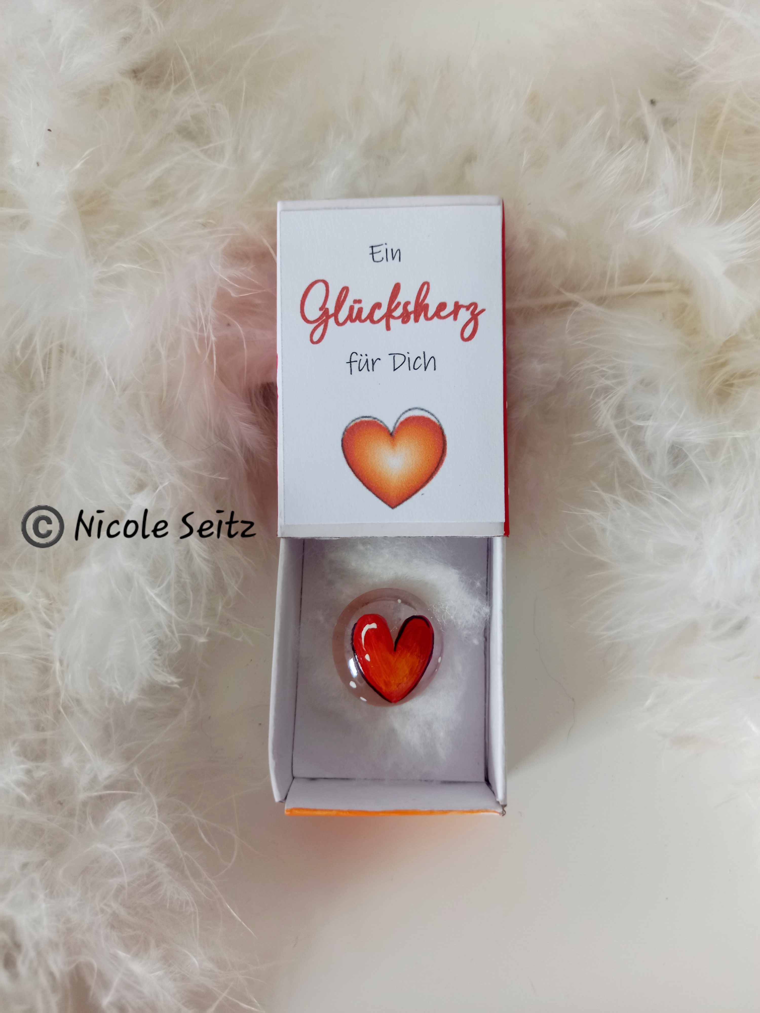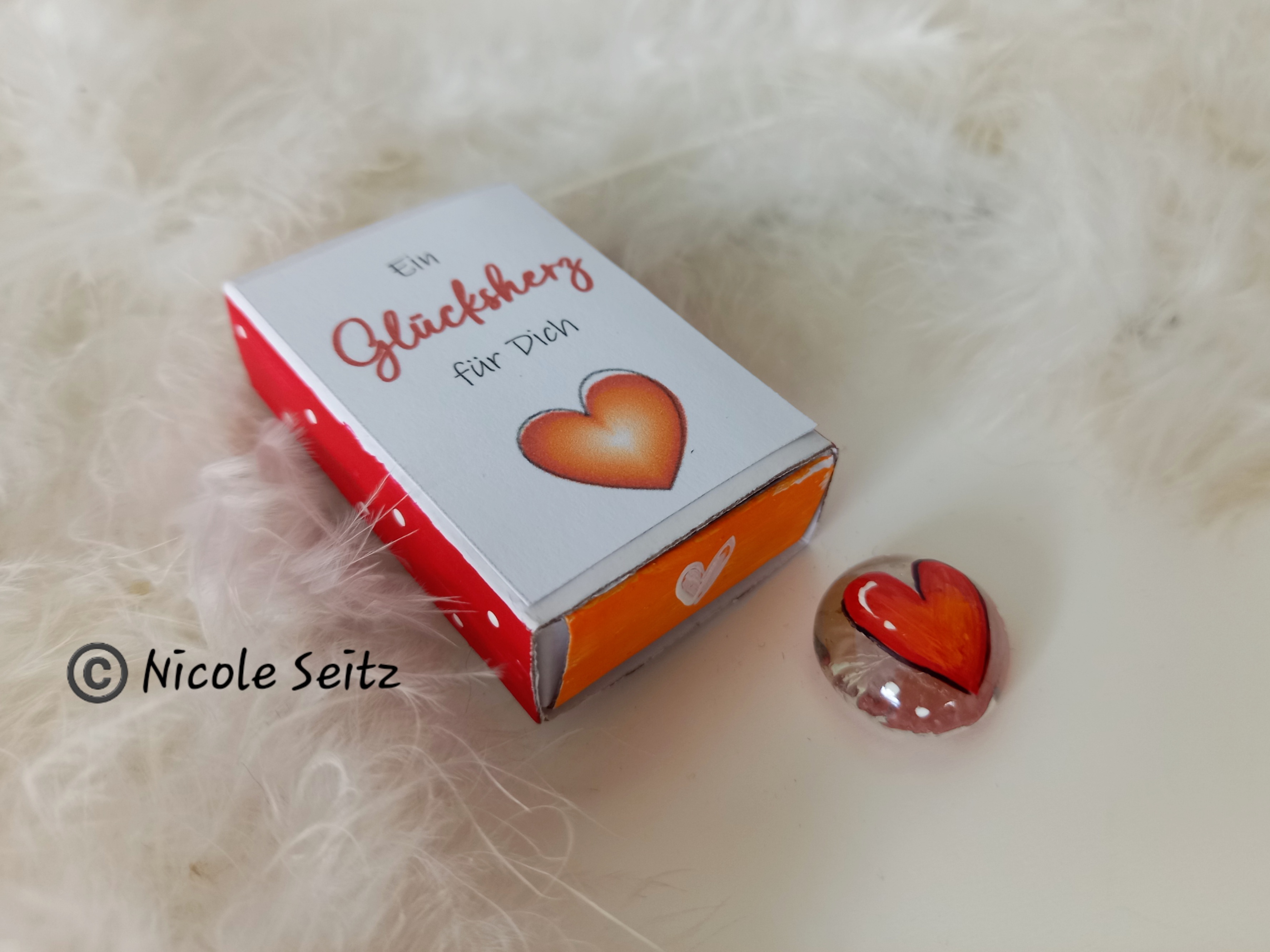 Glasstein * Glücksherz * bemalt * in einer kleinen Streichholzschachtel * Rot-Orange