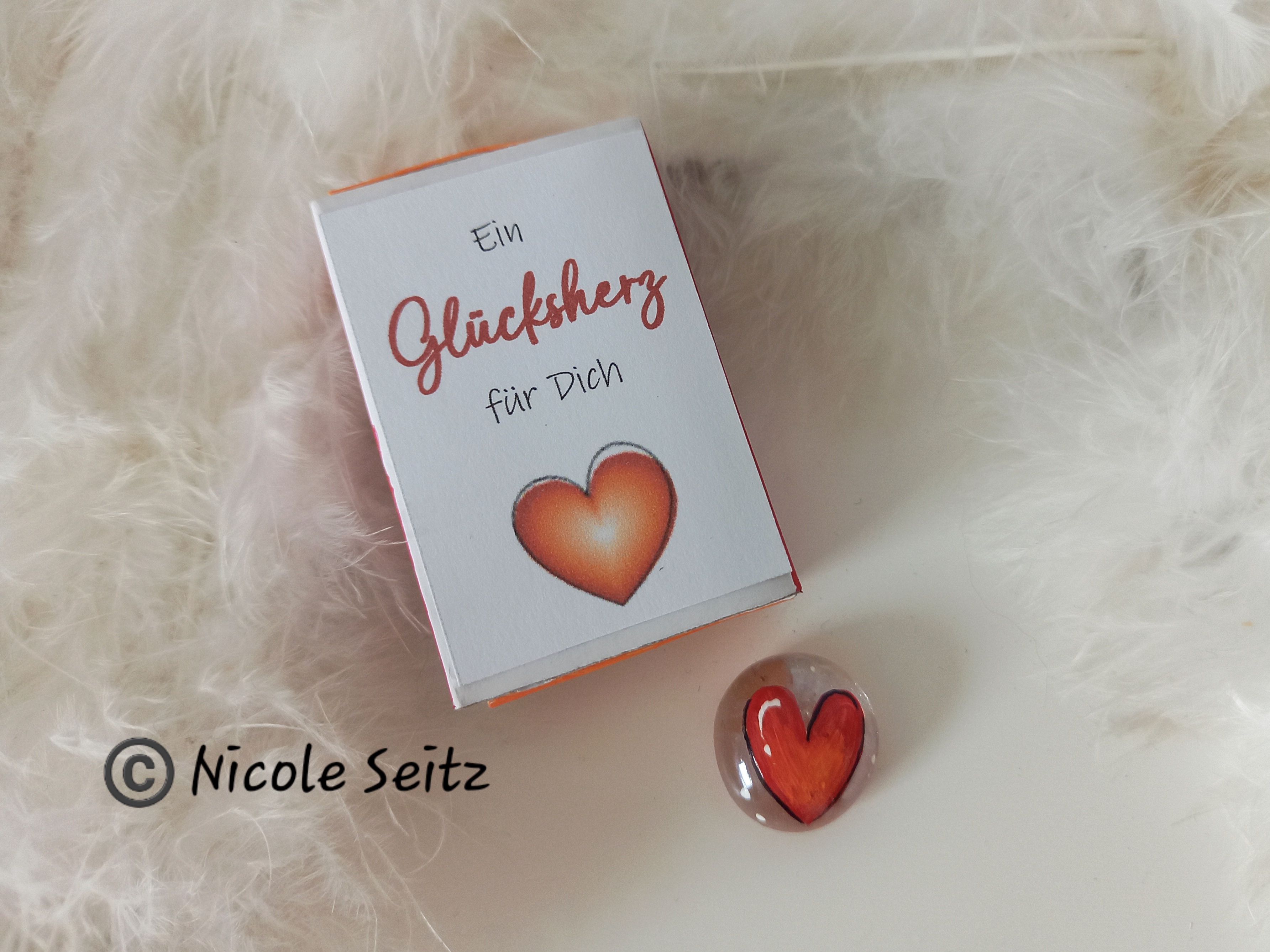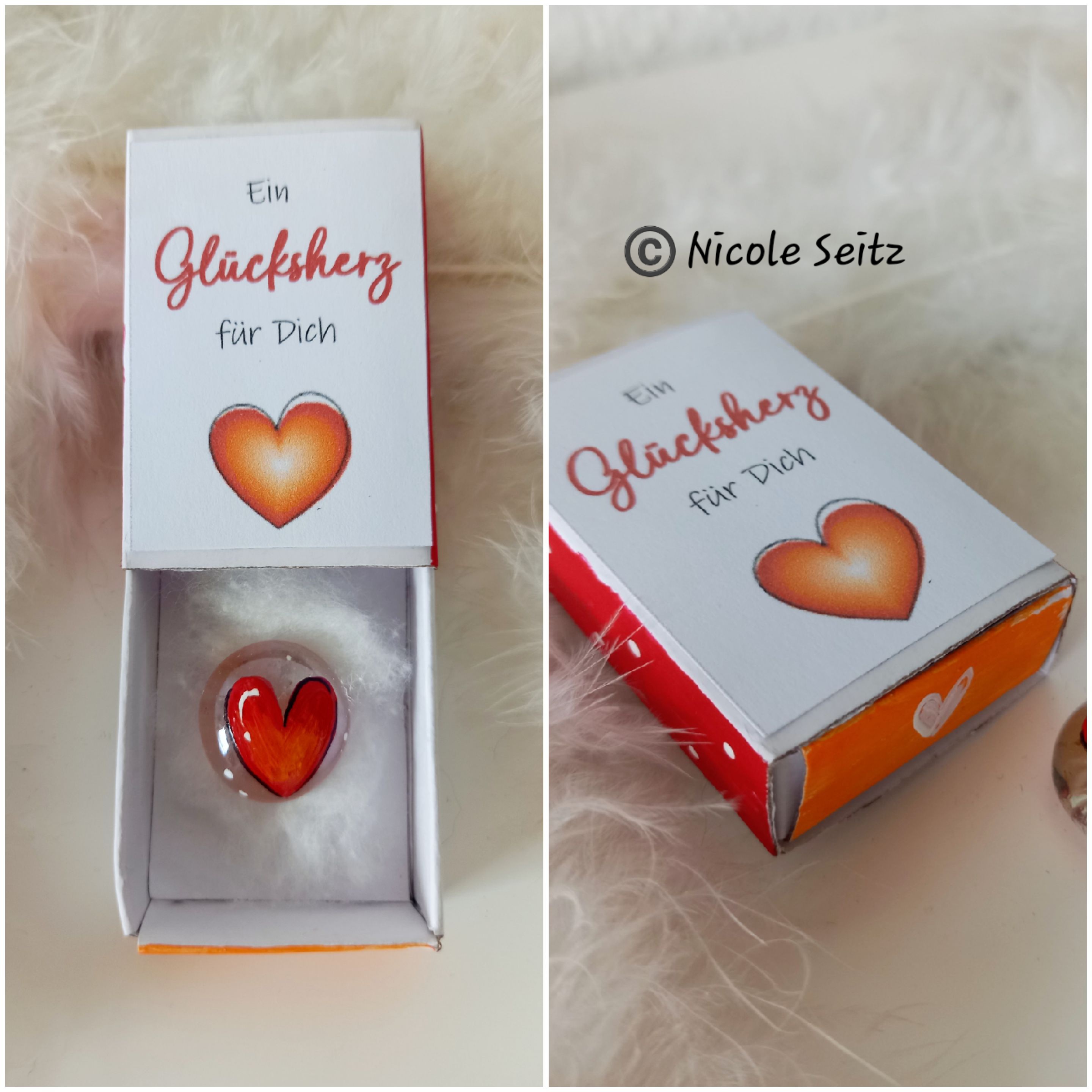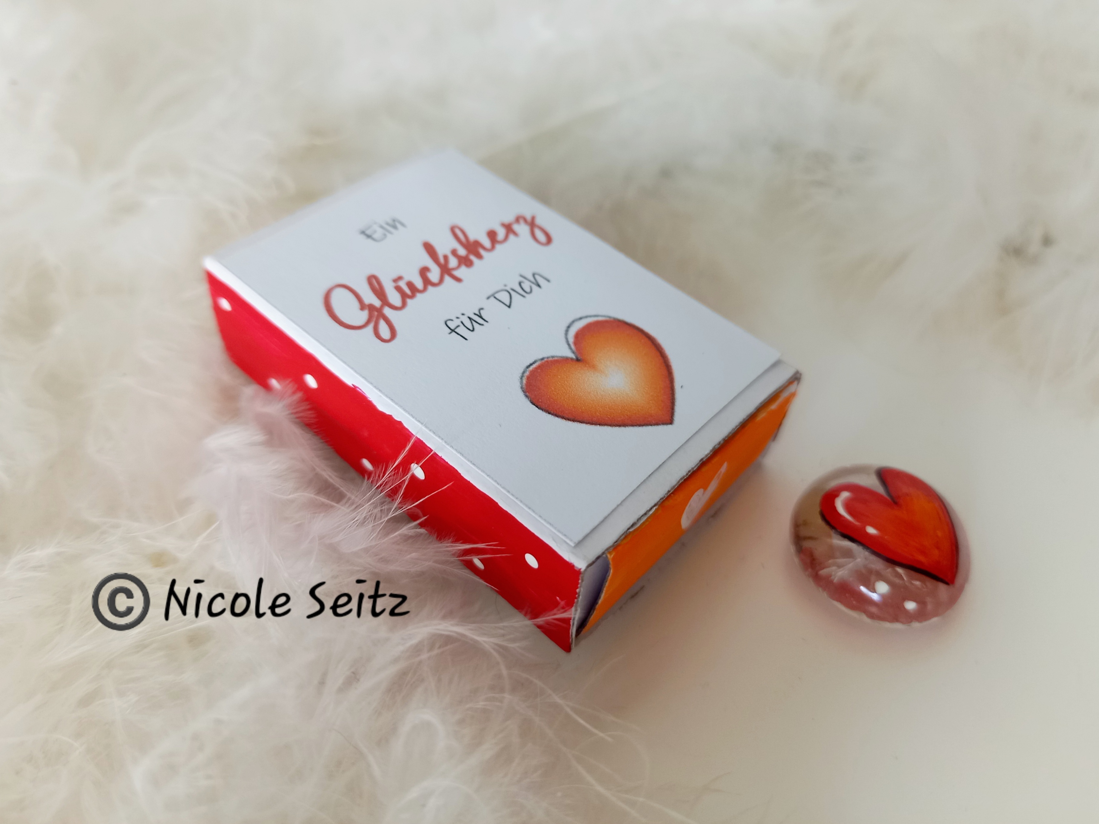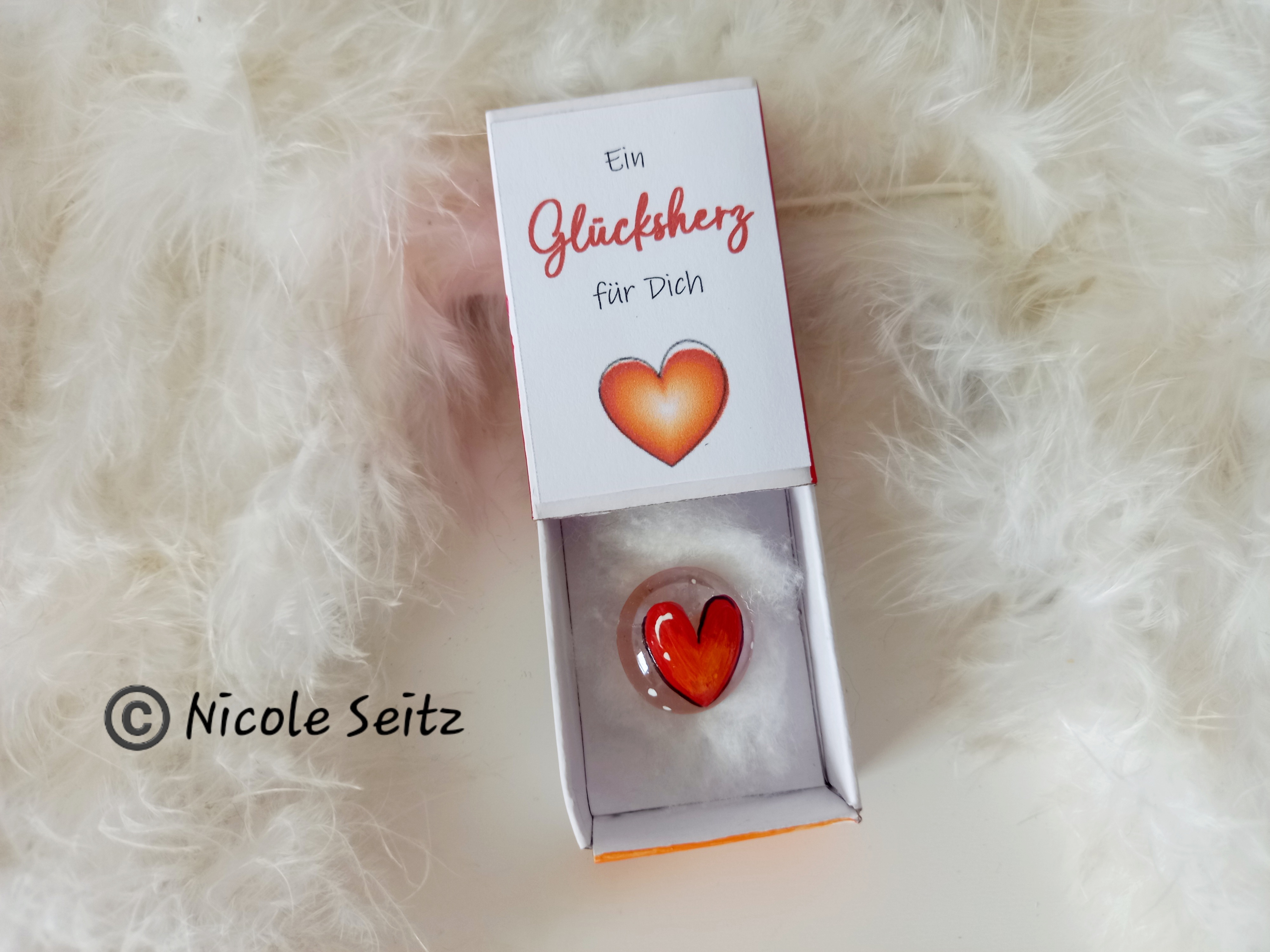 Glasstein * Glücksherz * bemalt * in einer kleinen Streichholzschachtel * Rot-Orange