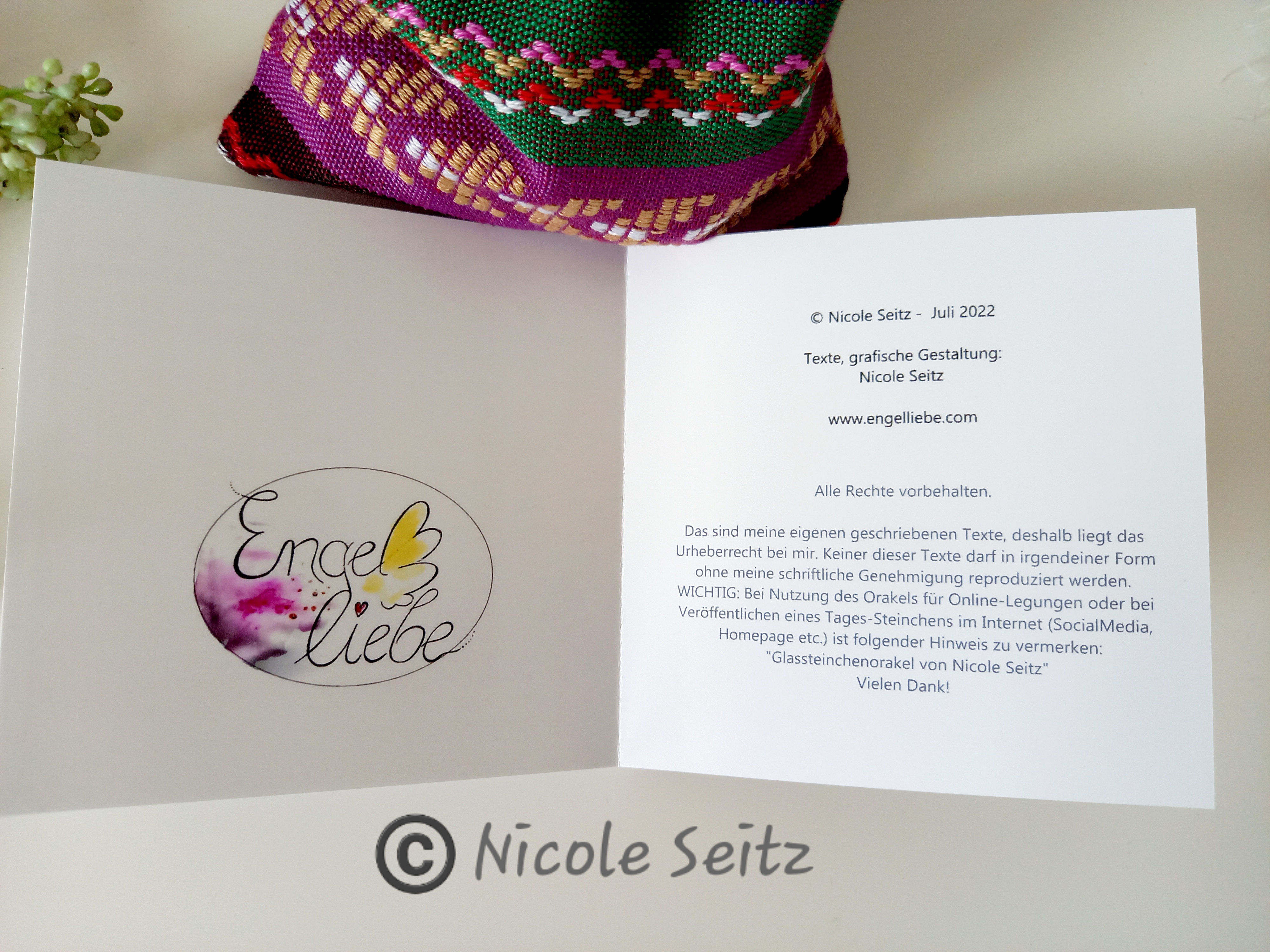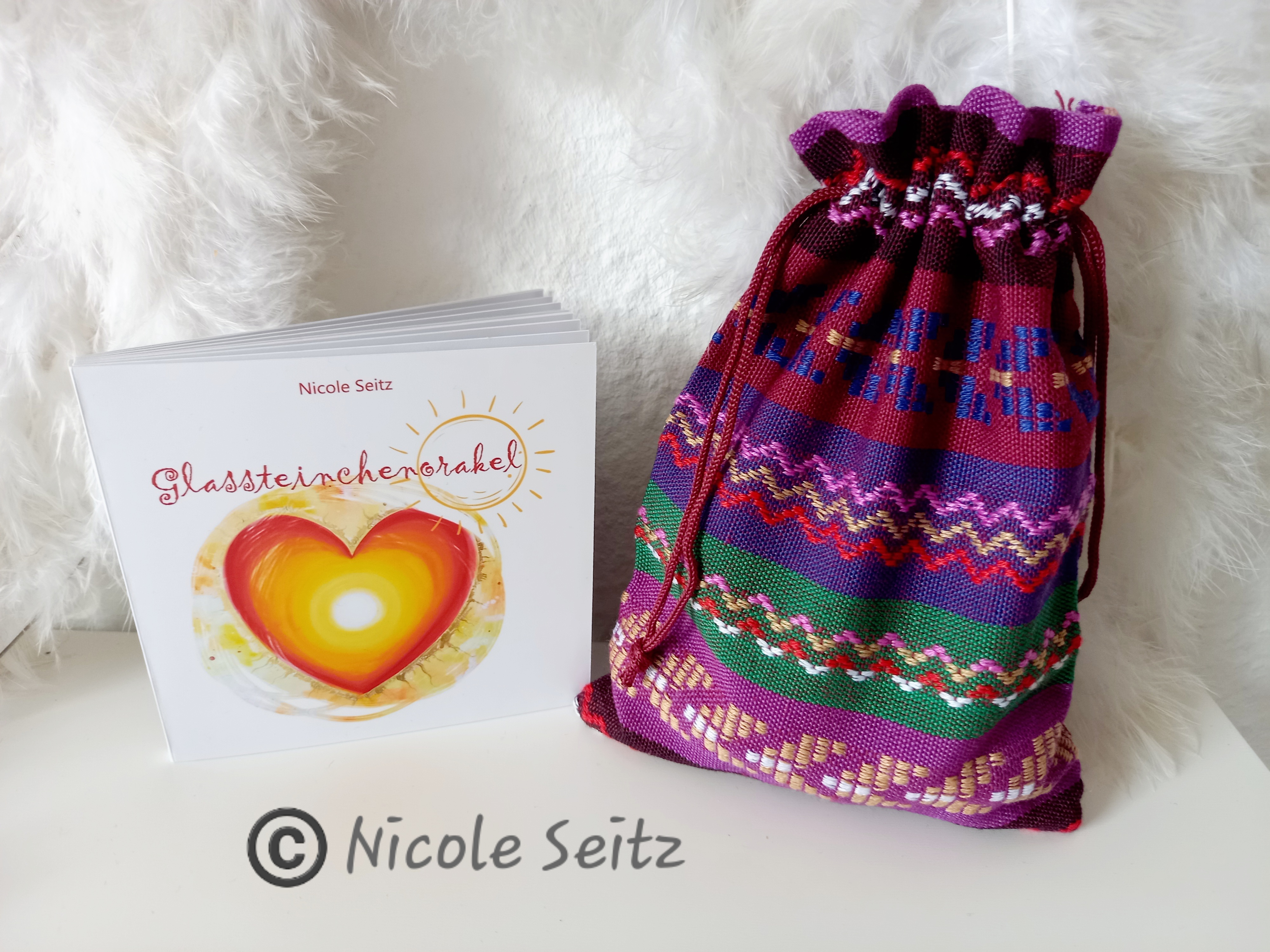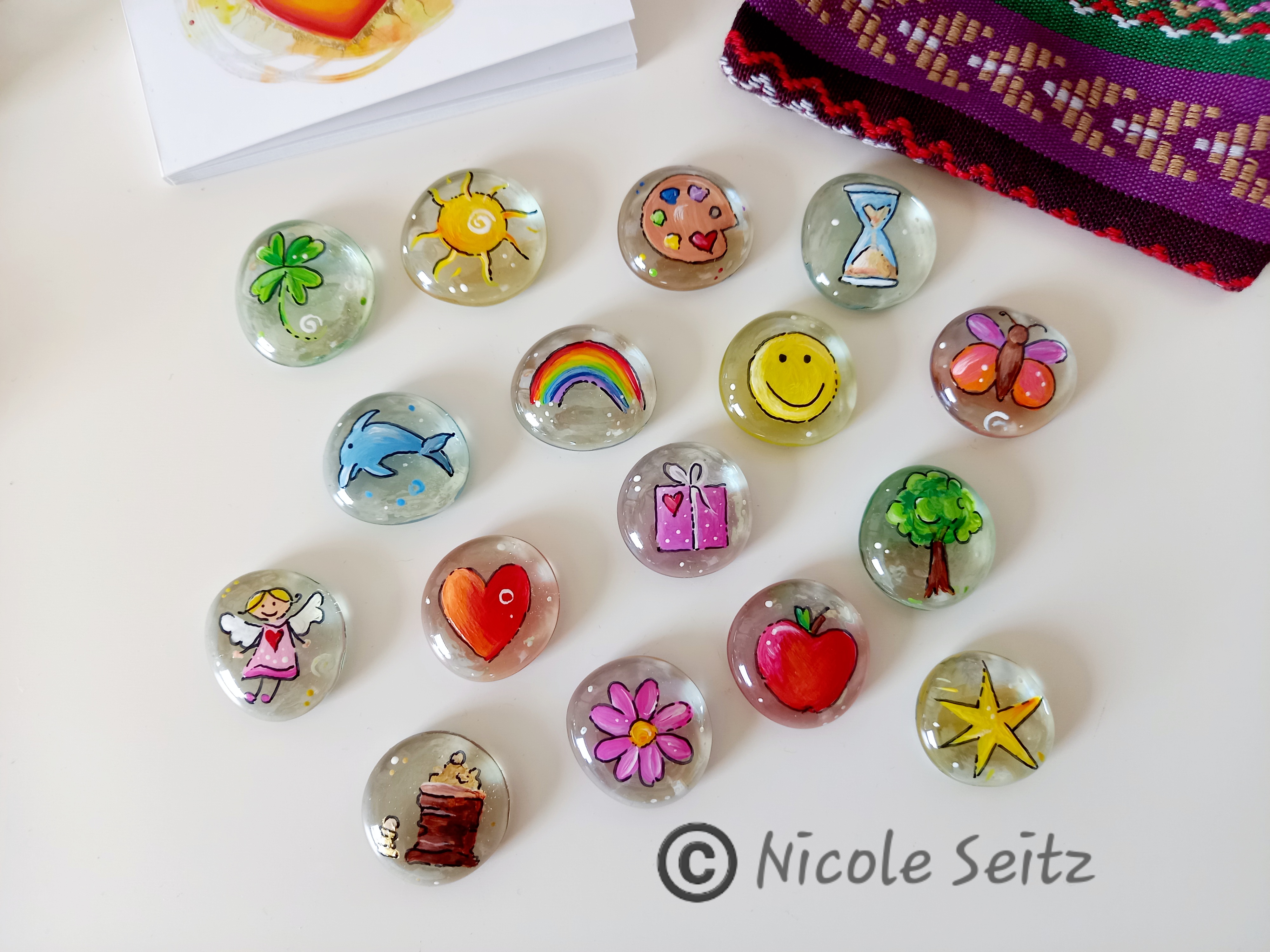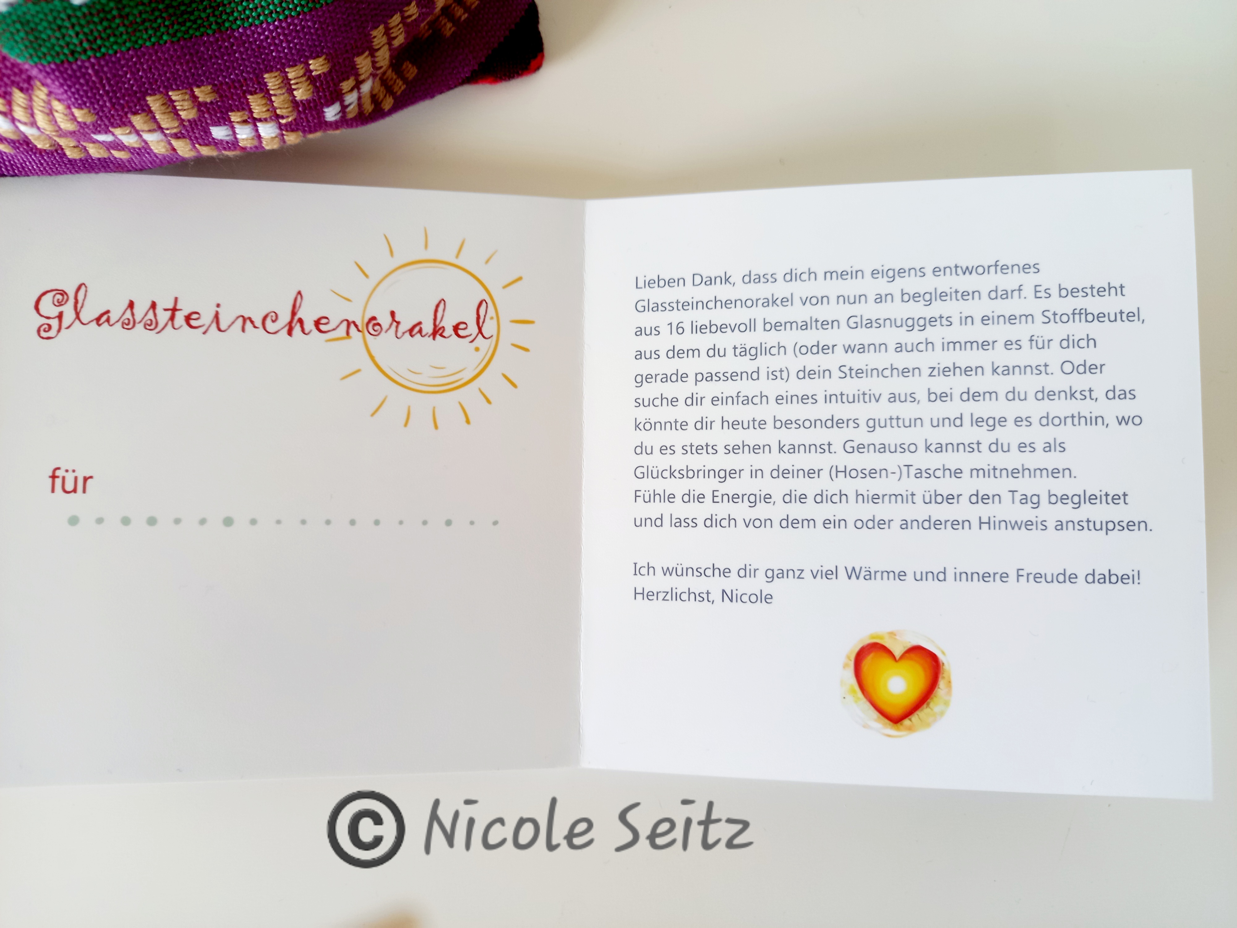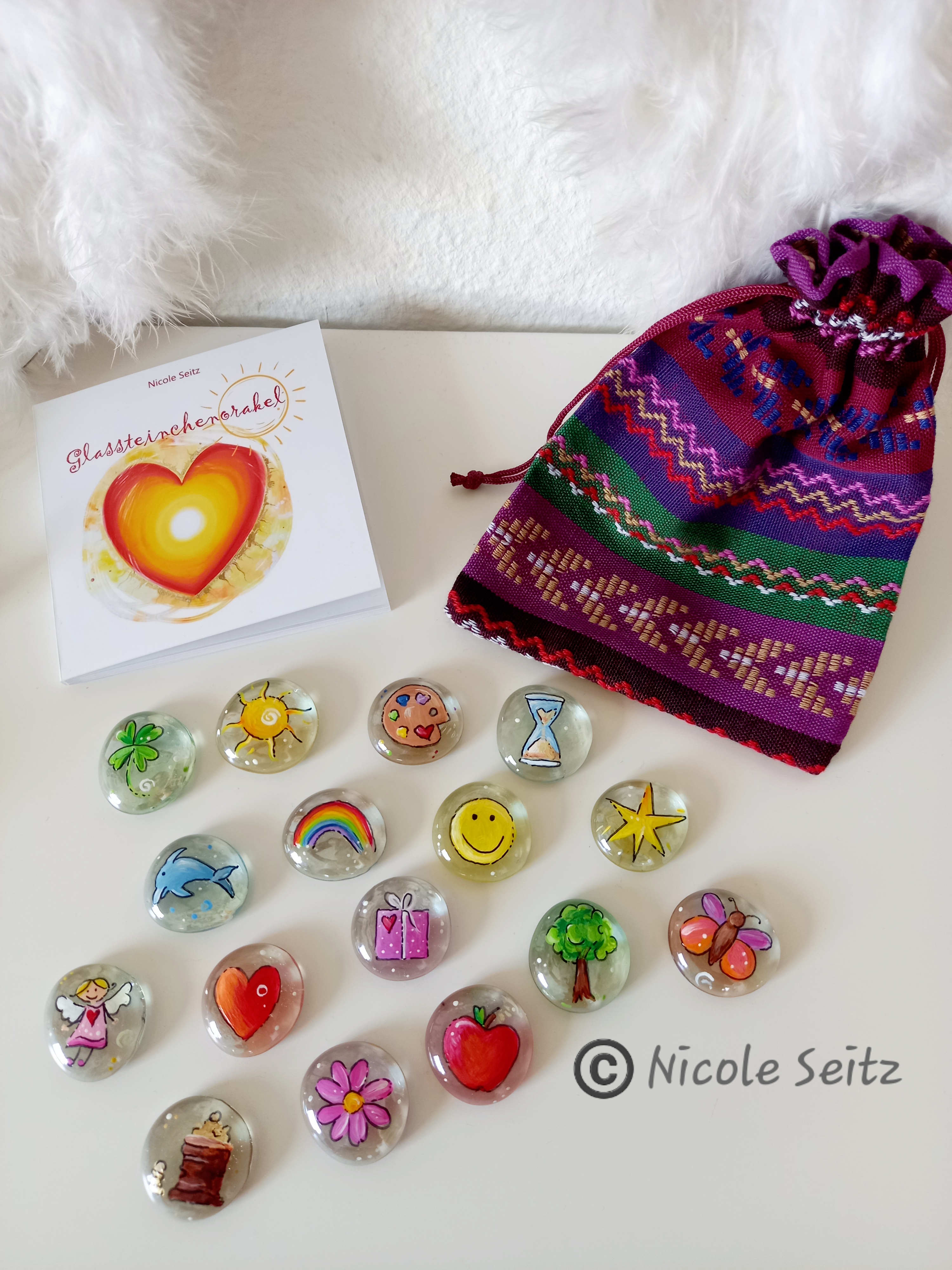 Lieben Dank, dass dich mein eigens entworfenes Glassteinchenorakel von nun an begleiten darf. Es besteht aus 16 liebevoll bemalten Glasnuggets in einem Stoffbeutel, aus dem du täglich (oder wann auch immer es für dich gerade passend ist) dein Steinchen ziehen kannst. Oder suche dir einfach eines intuitiv aus, bei dem du denkst, das könnte dir heute besonders guttun und lege es dorthin, wo du es stets sehen kannst. Genauso kannst du es als Glücksbringer in deiner (Hosen-)Tasche mitnehmen.