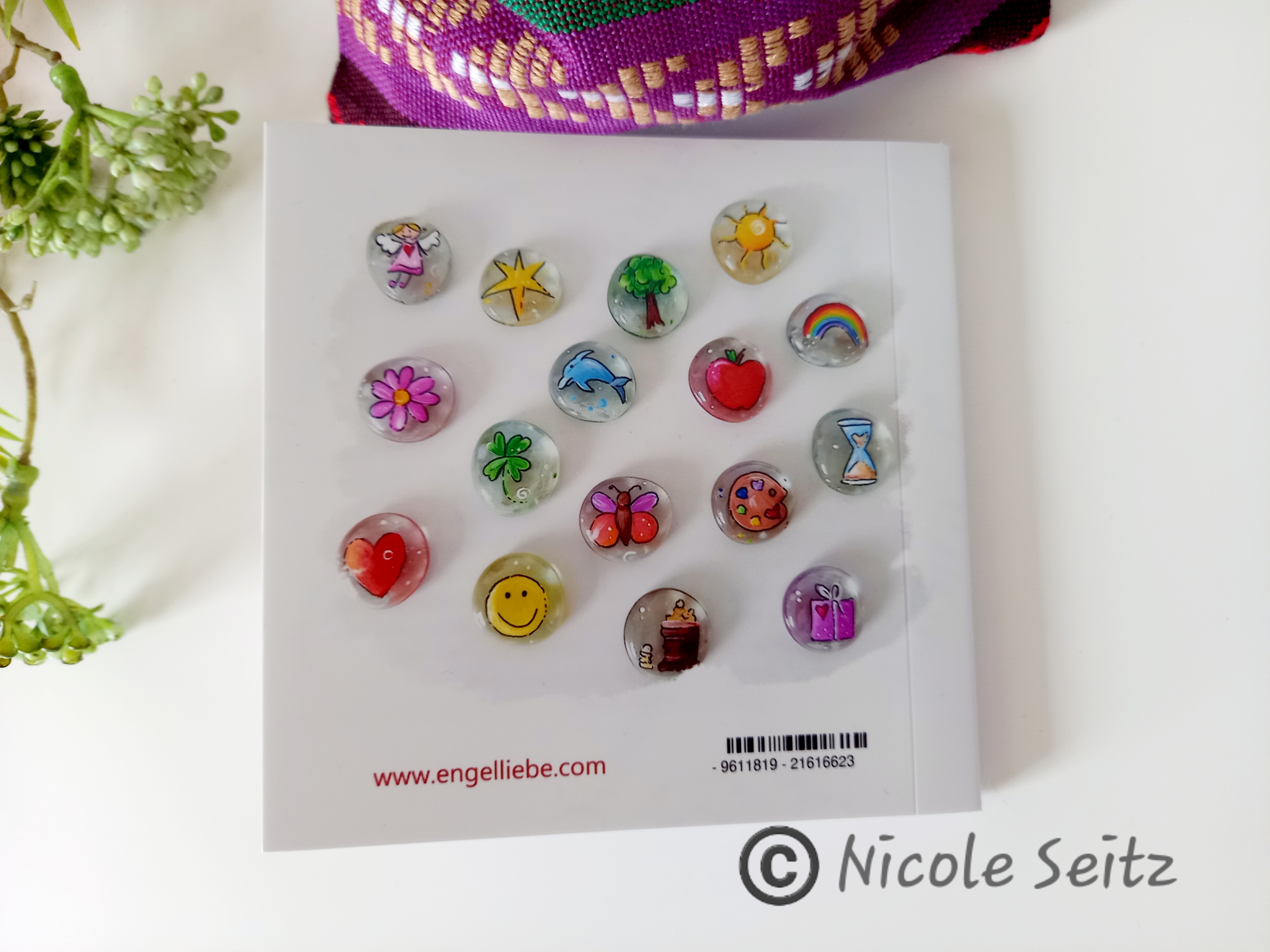 Größe: Glassteine ca. 2,8 cm, Buch 10 x 10 cm (Farb-Glanzdruck)