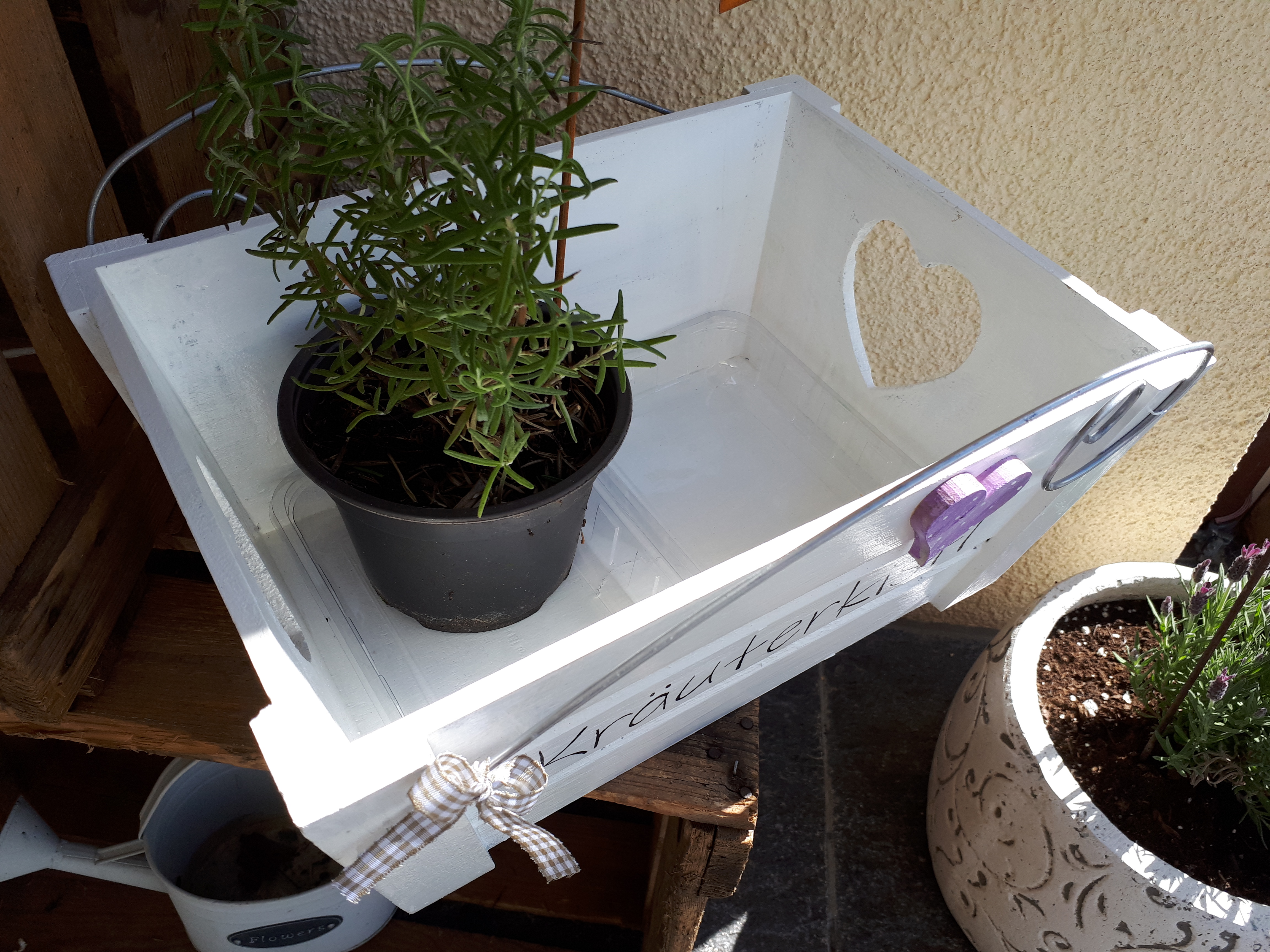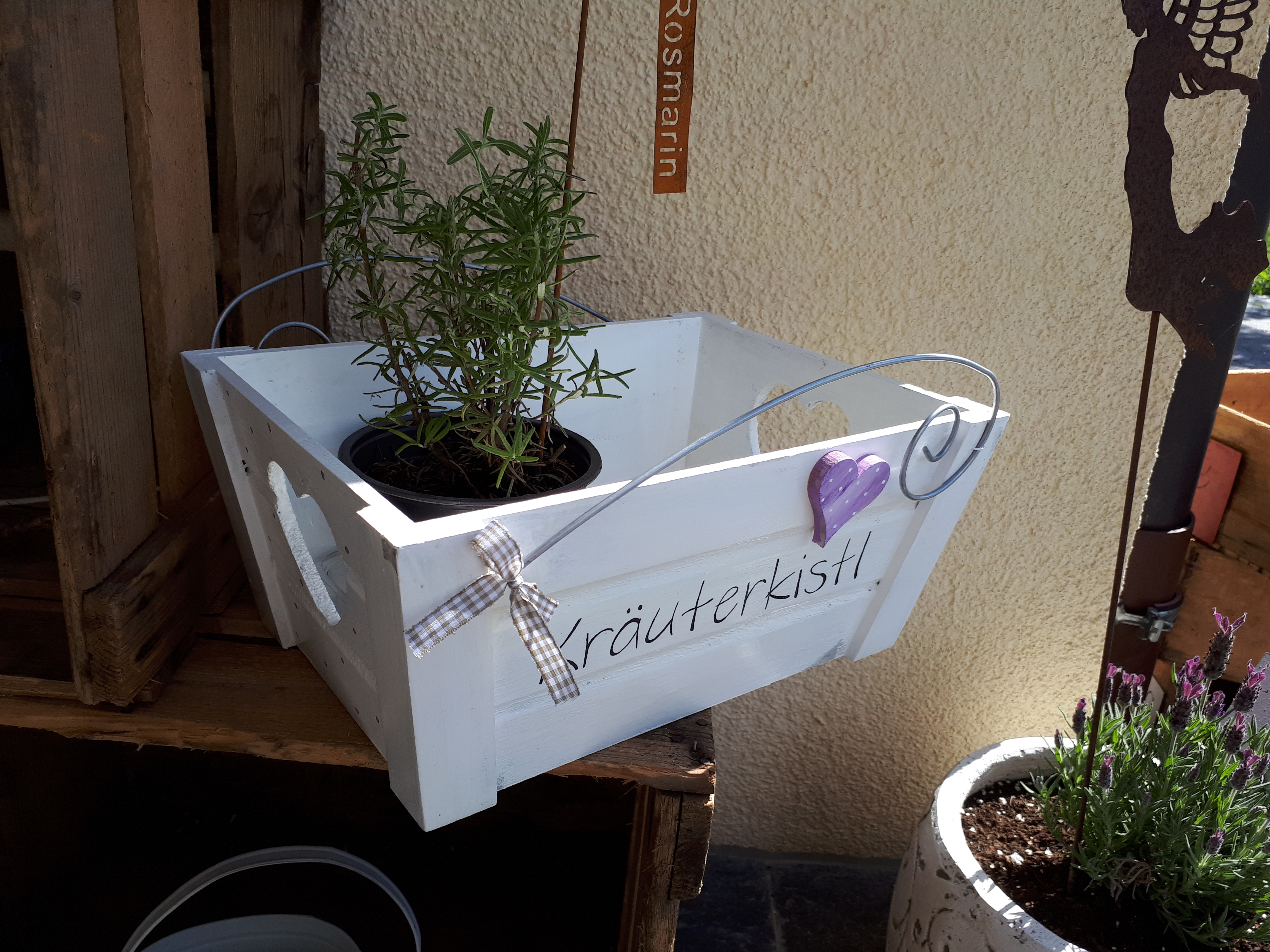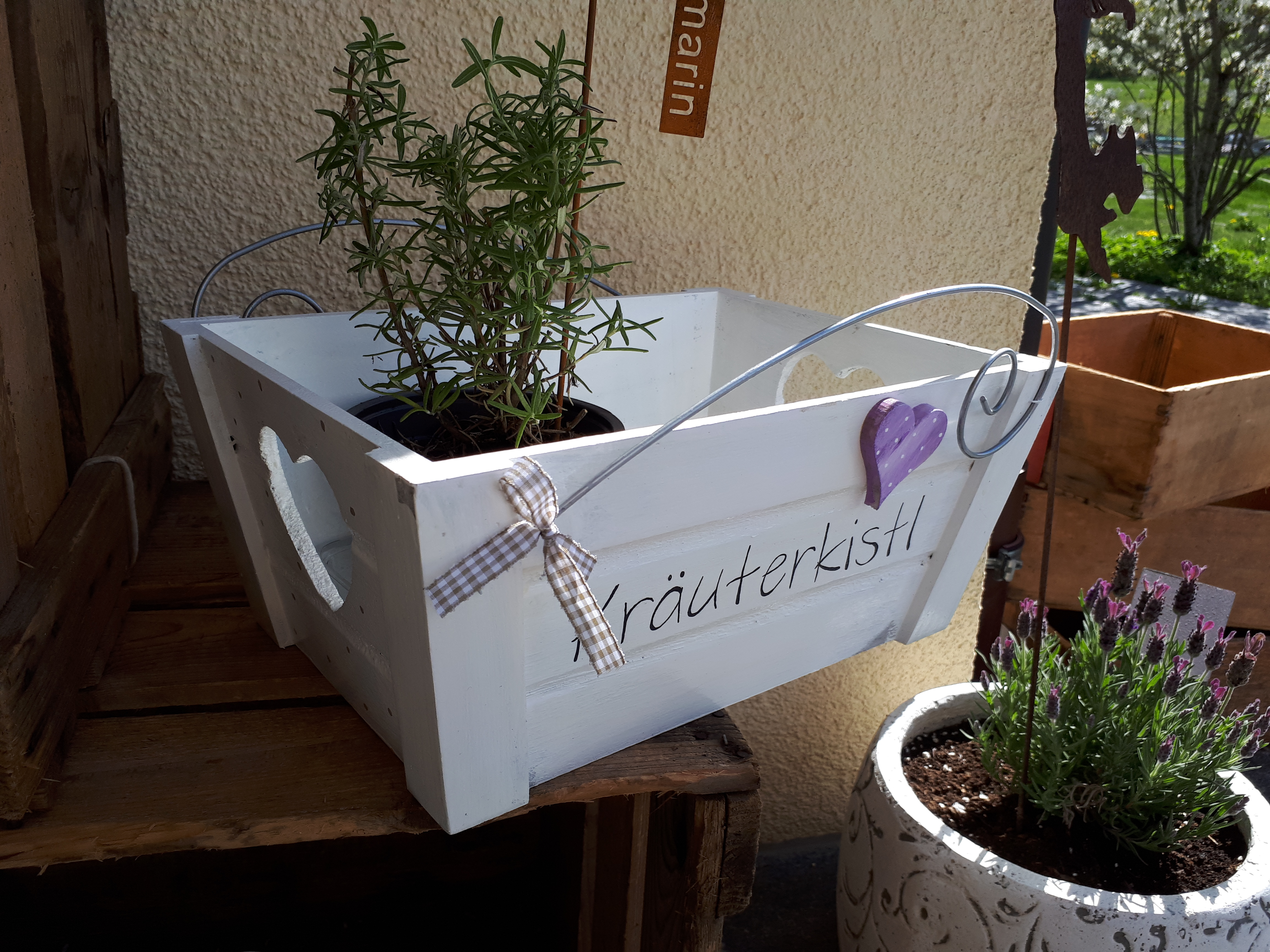 Material: Holzkiste, Holzherzen, Metallverzierung, Schleifenband, Kunststoffschalen, Acrylfarben, Acryllack