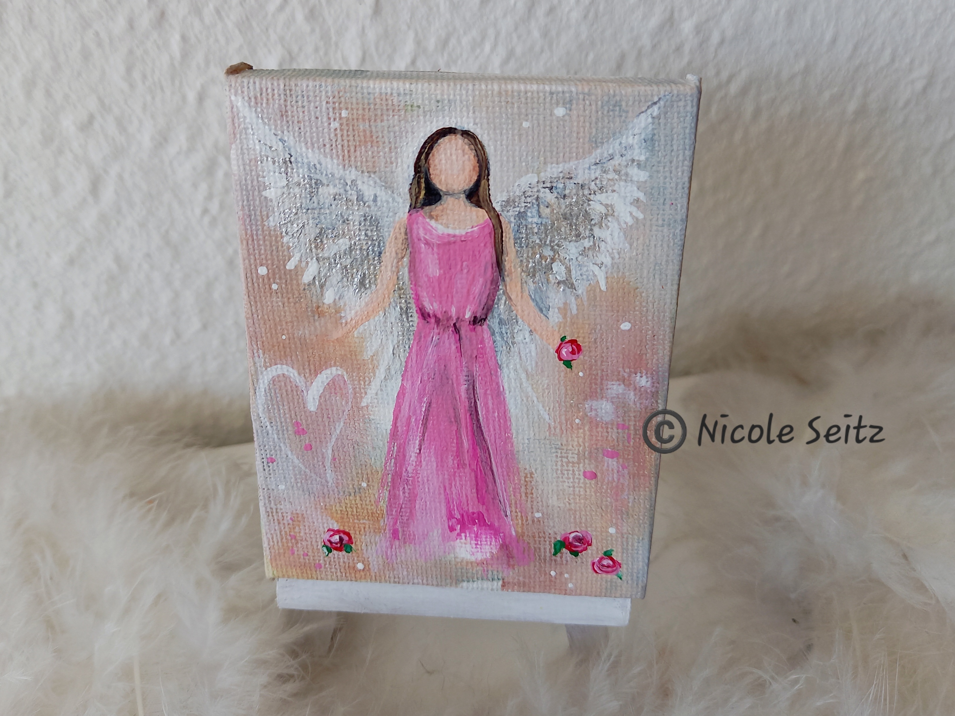 Ein Rosenengel auf einer kleinen Leinwand mit weißer Staffelei