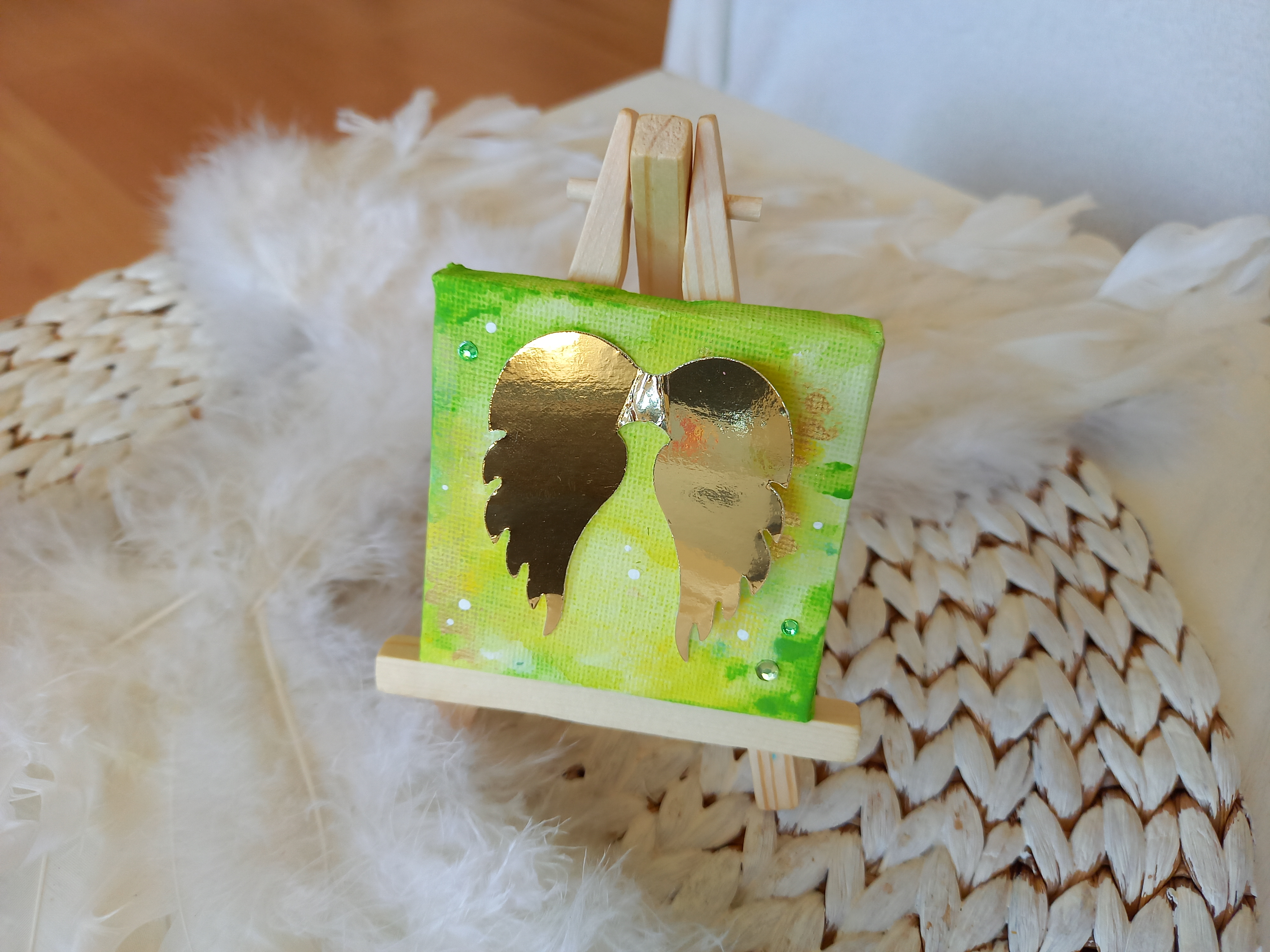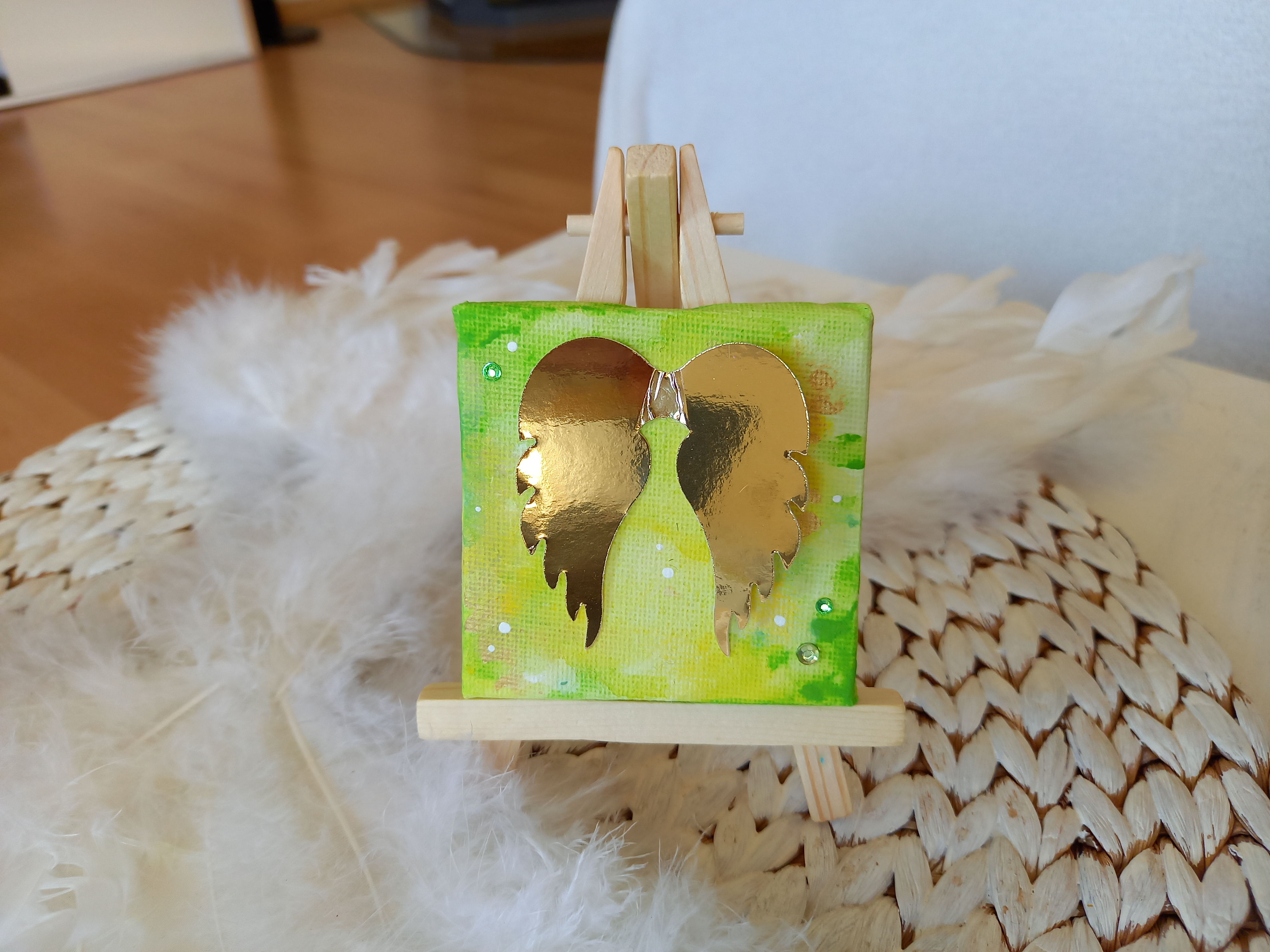 Bild mit aufgeklebten Engelsflügeln (Karton gold-glänzend) auf einer kleinen Leinwand mit Staffelei