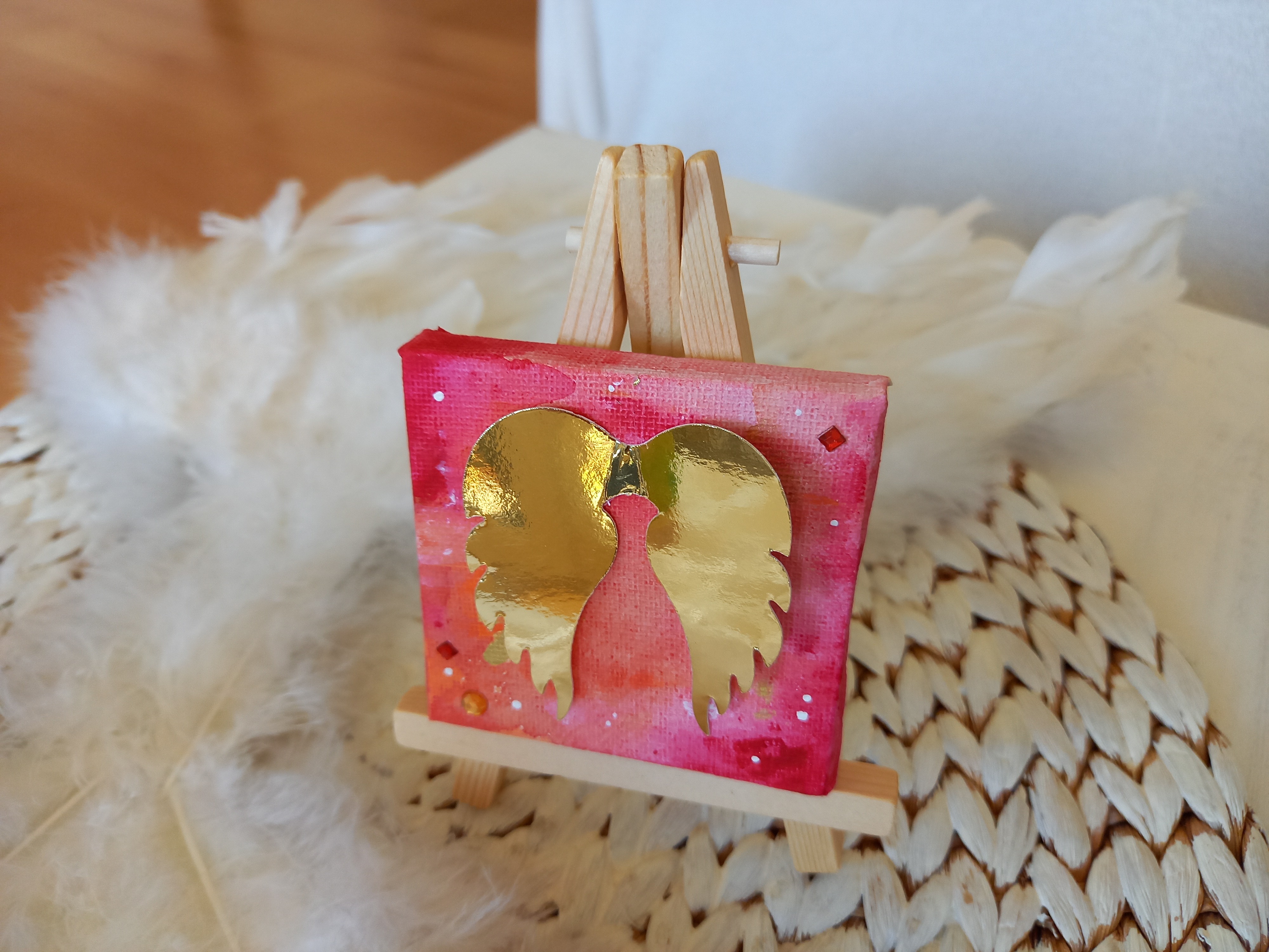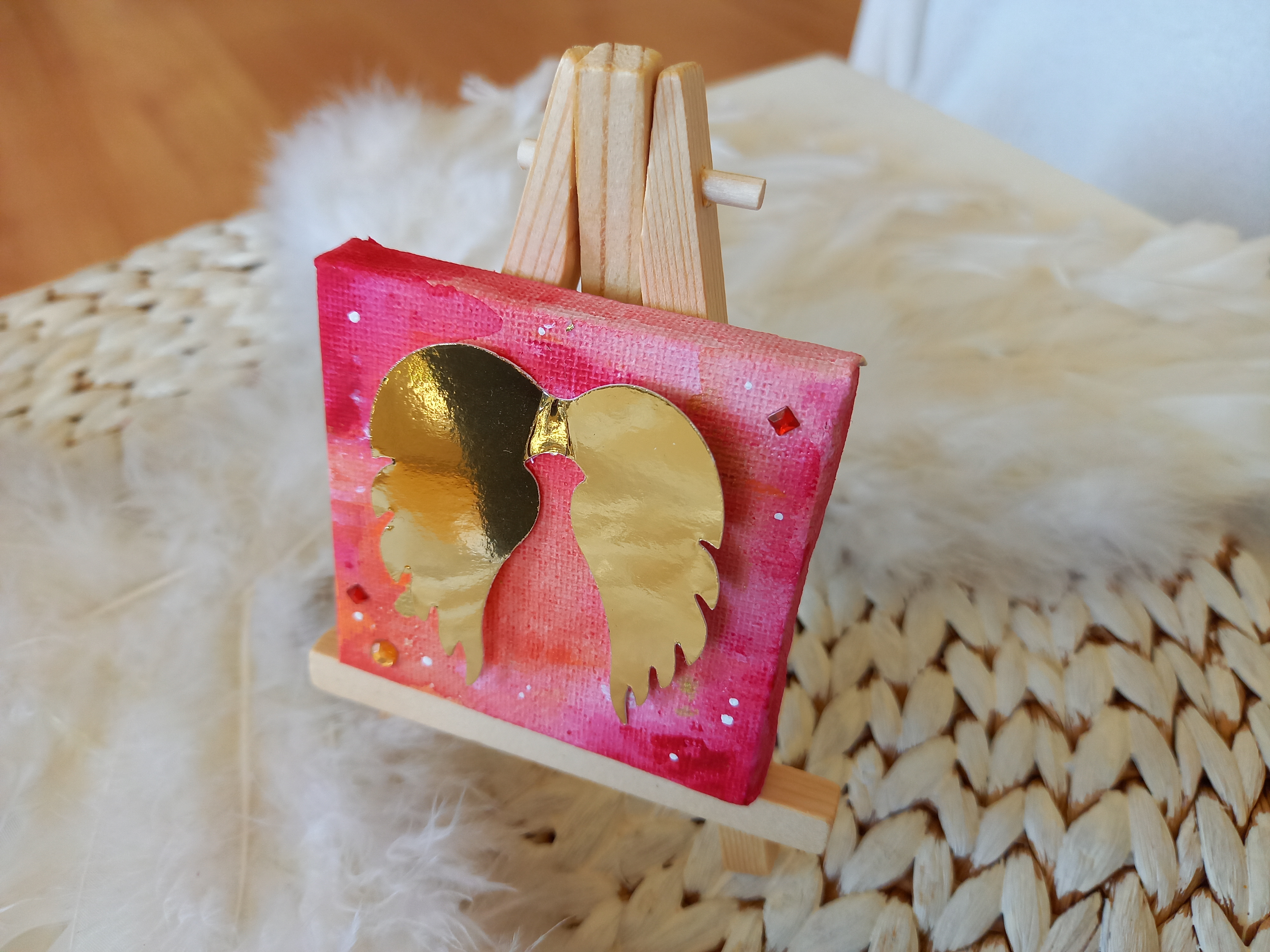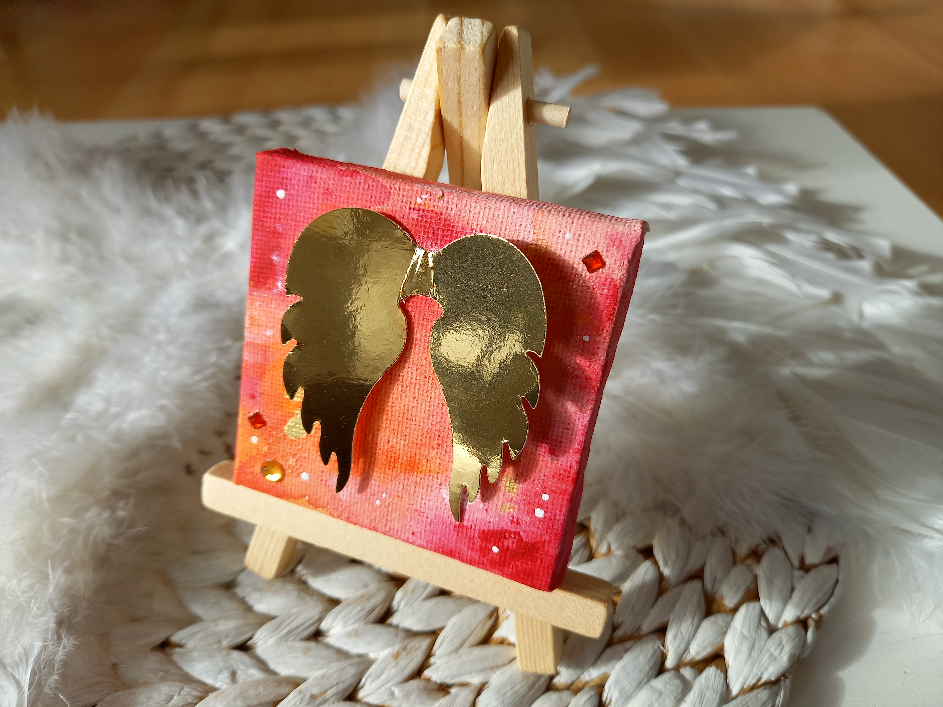 Bild mit aufgeklebten Engelsflügeln (Karton gold-glänzend) auf einer kleinen Leinwand mit Staffelei
