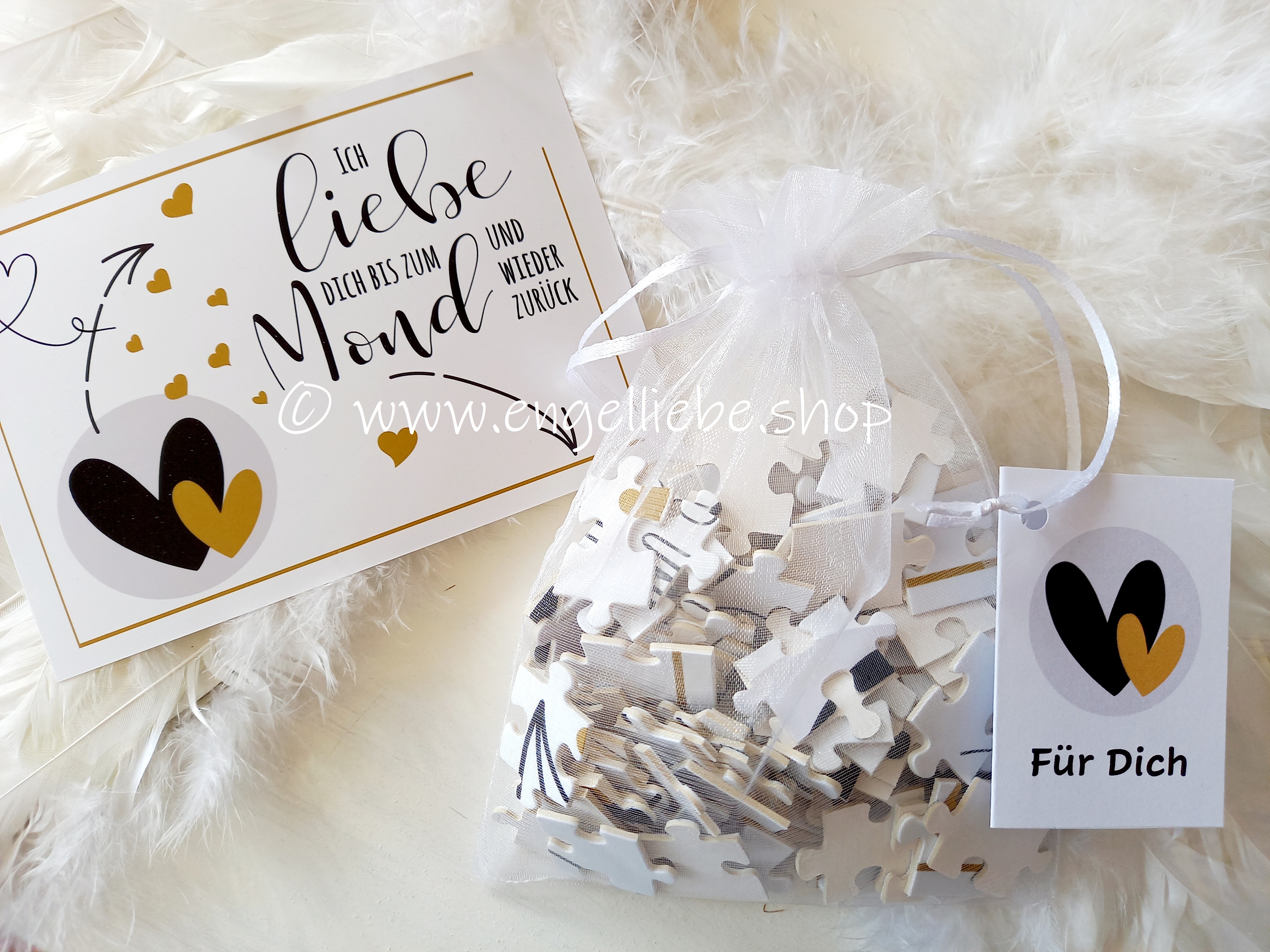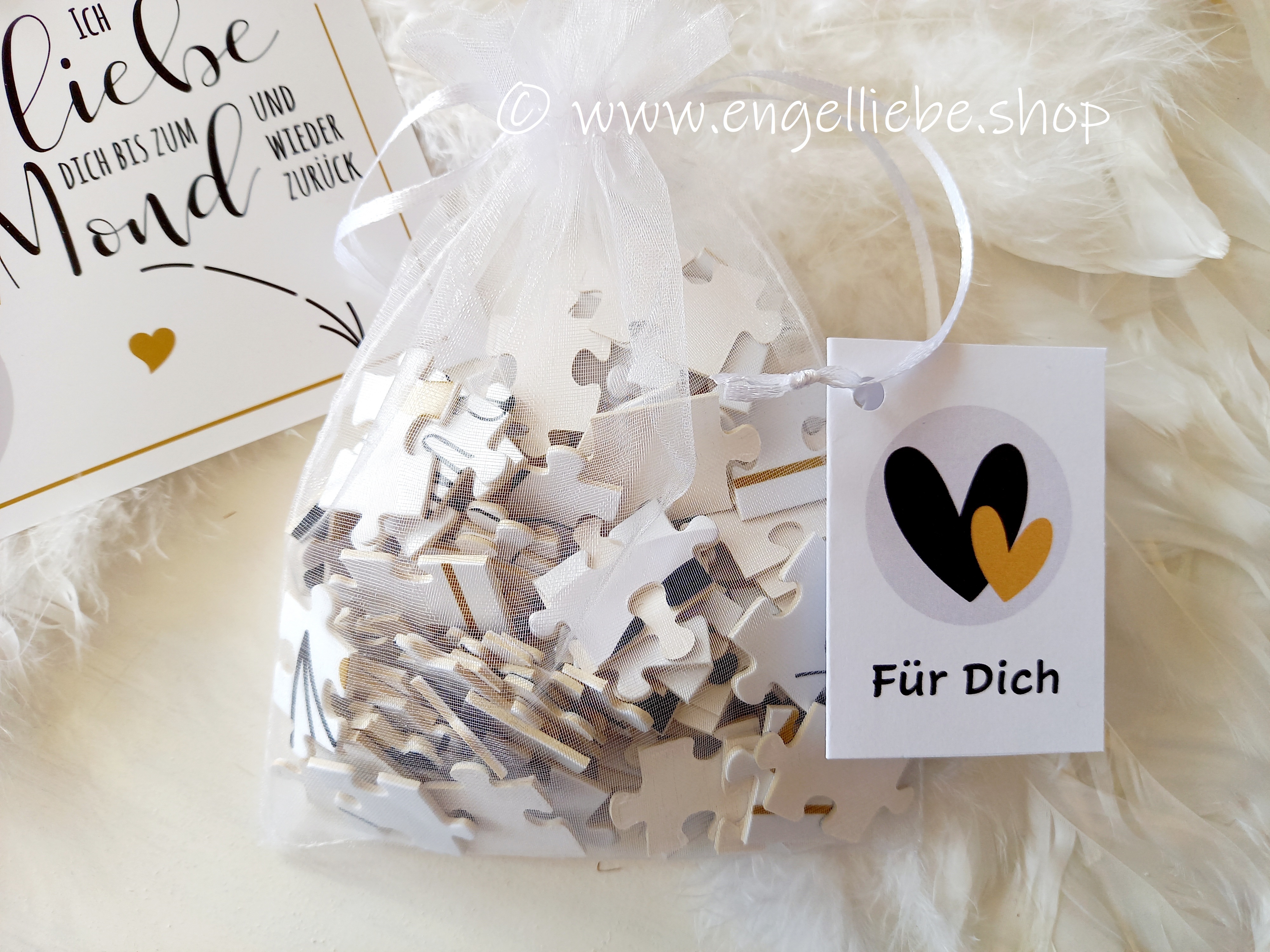 Wird erst nach Bestellung in Druck gegeben, deshalb längere Lieferzeit. (eines wäre derzeit auf Lager und somit sofort lieferbar!) Puzzle * Ich liebe Dich bis zum Mond und wieder zurück In einem weißen Organzasäckchen mit einer kleinen Grußkarte Statt einer Karte ein Puzzle verschenken ;-) Puzzlegröße: 20 x 30 cm (112 Teile)