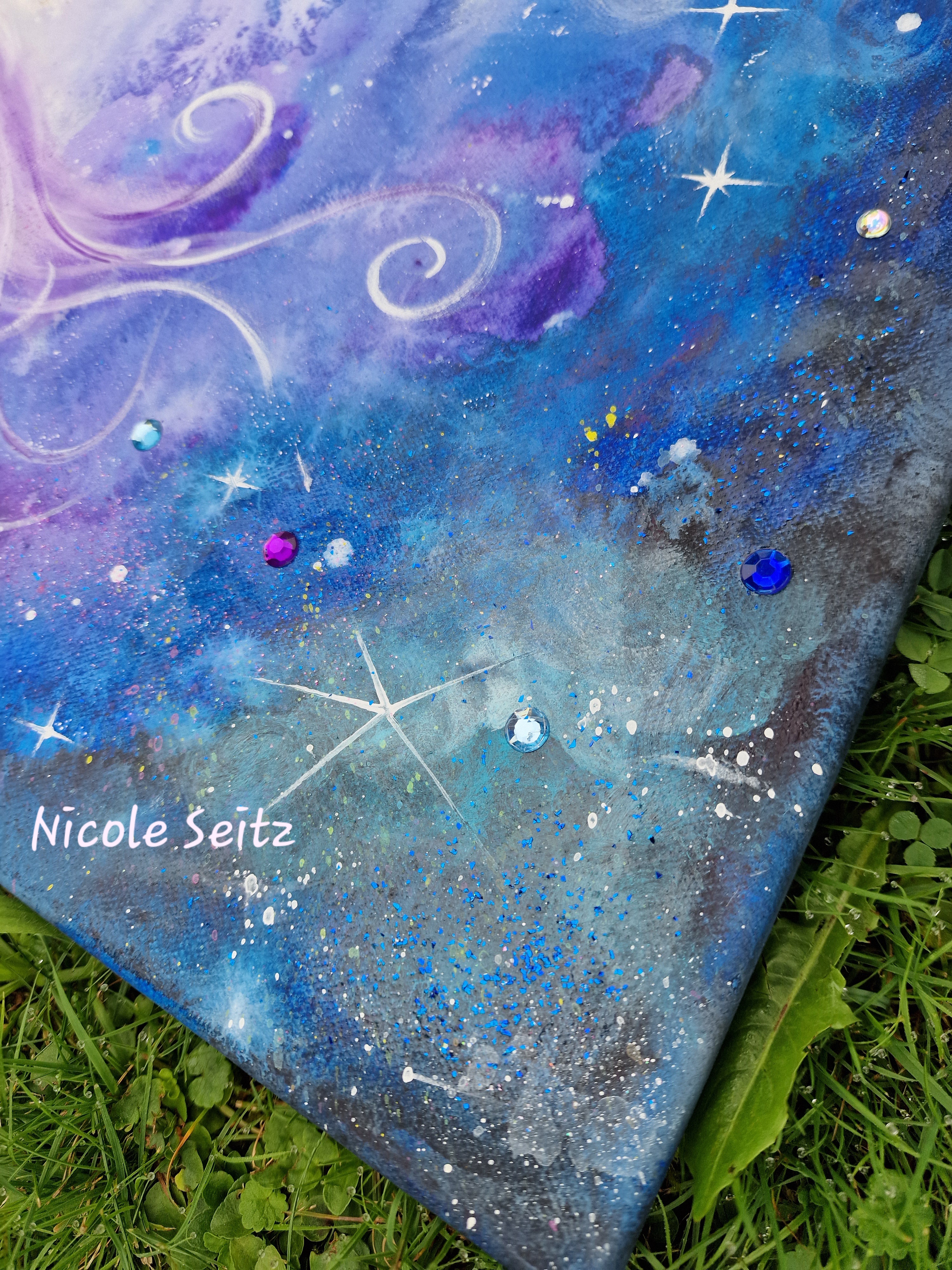 Mit Acrylfarben gemalt. Mit Glitter und Glitzersteinchen verziert.
