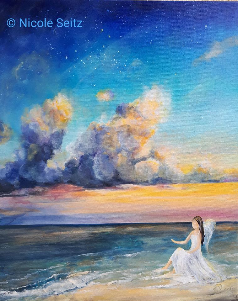 Oftmals sehnen wir uns danach, einfach nur am Meer zu sitzen und den Wellen zu lauschen. Wenn man die Augen schließt und wirklich mit einem offenen Herzen hineinfühlt in den Moment dieser Sehnsucht, tut das schon unbeschreiblich gut. Ich würde sagen, es fällt für einen kurzen Augenblick sogar ein wenig "Last" ab. Über längere Zeit wirkt das durchaus entspannend, wie Meditation. Nun stell dir vor, wie du dich zu dem Engel setzt, der dir liebevoll die Hand reicht und dich zur Begrüßung tröstend in den Arm nimmt. Das glasklare Wasser umspült dich und reinigt deine Energien. Die Wellen tragen Stress, Sorgen etc. einfach ganz weit hinaus ins Meer. Hinter den bzw. auch um die dunklen Wolken (Gedanken...