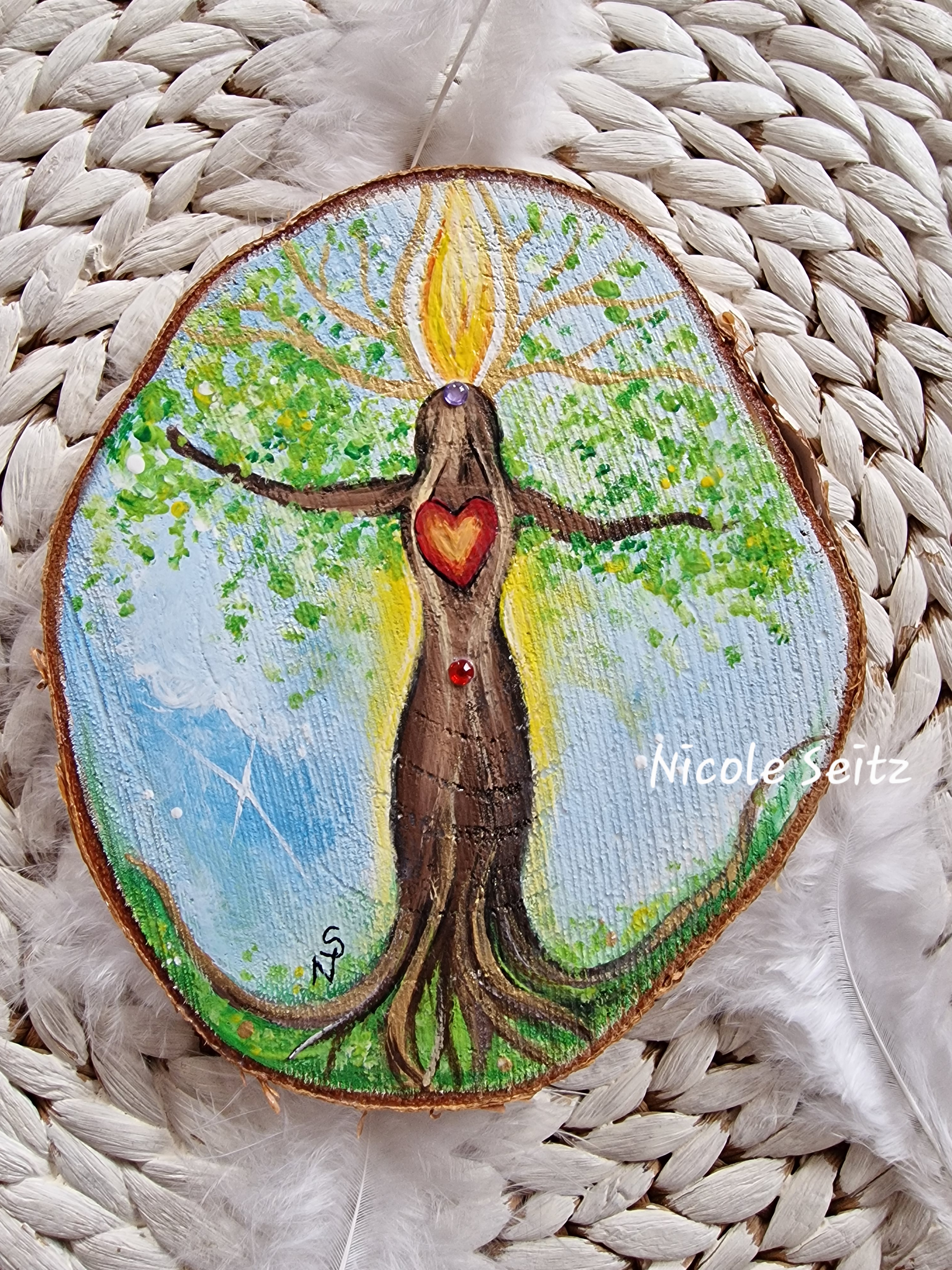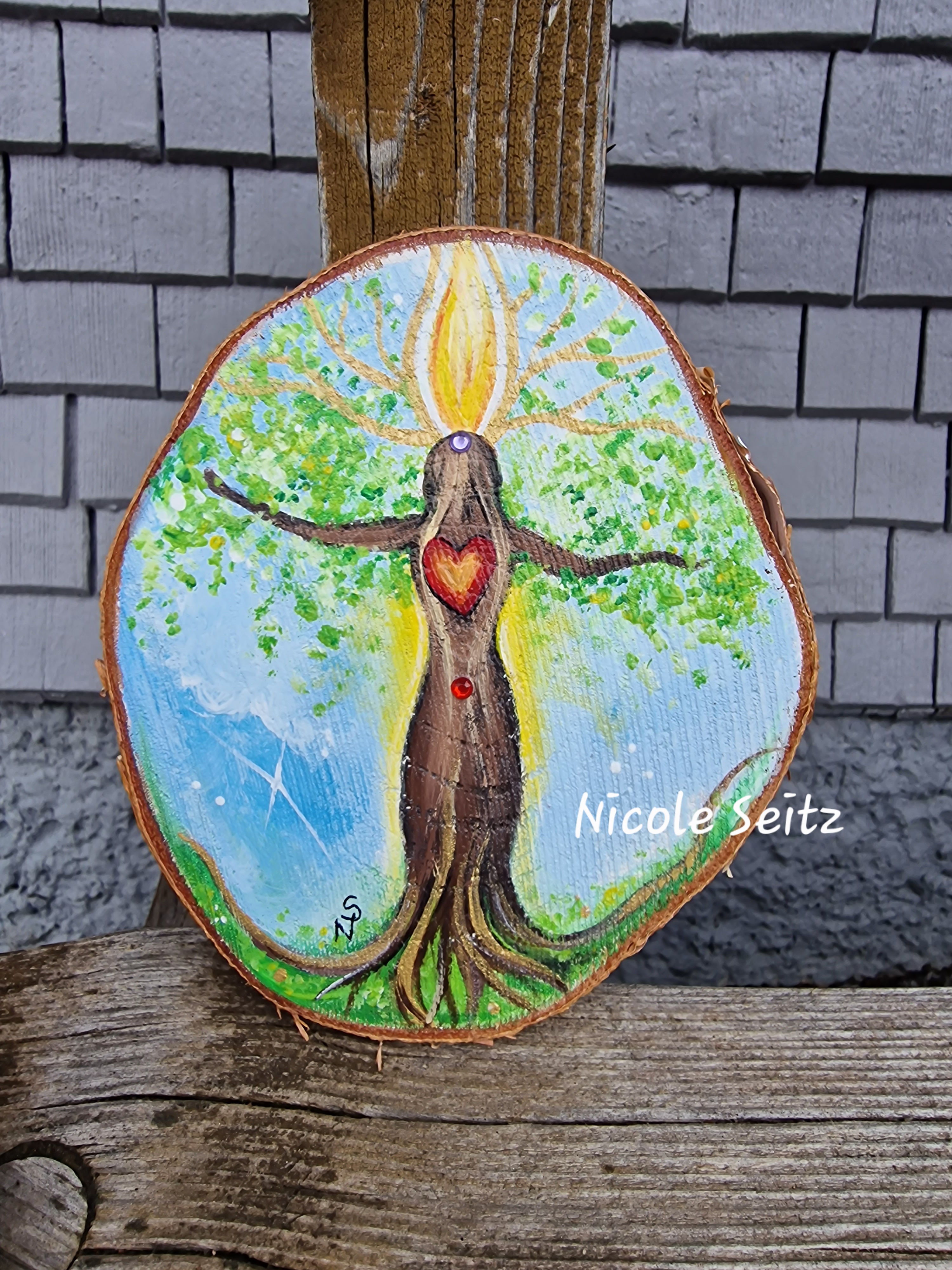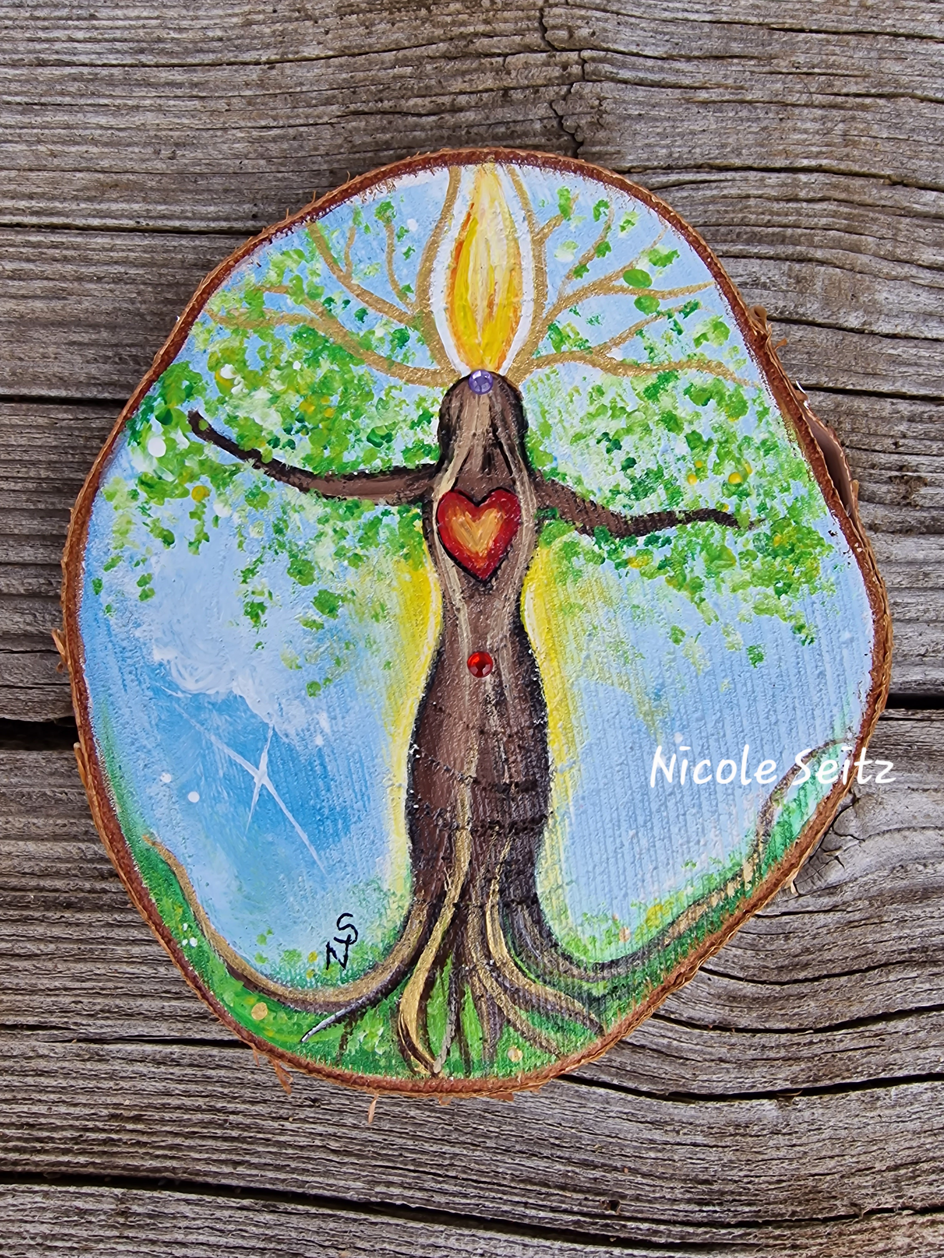 Baum der Verwurzelung auf Birkenbaumscheibe gemalt