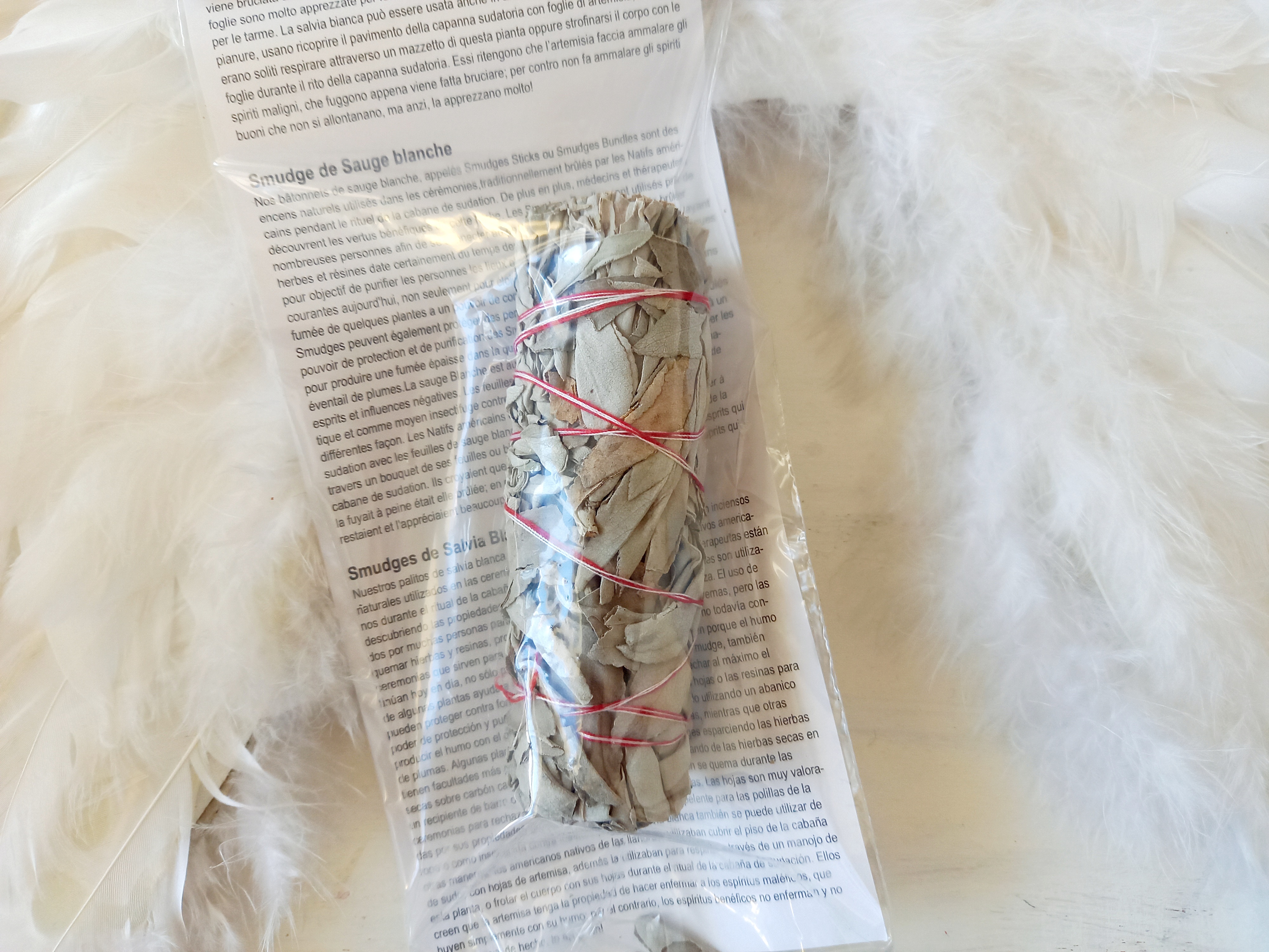 Hierbei handelt es sich um durch und durch natürliche White Sage Smudge Sticks oder Weißer Salbei Bündel, wie sie traditionell bei Räucherzeremonien der Ureinwohner Amerikas verbrannt werden, z.B. in Schwitzhütten. Zunehmend entdecken auch Ärzte, Therapeuten und alle, die beruflich um das Wohl des Körpers bemüht sind, den segensreichen Aspekt dieser Kräuter. Diese Kräuterbündel geben uns überall auf der Welt die Möglichkeit, uns wieder mit der Kraft von Mutter Erde zu verbinden. Der Gebrauch von Pflanzen- und Harzrauch stammt wohl aus uralten Zeiten, als die ersten Feuer in den Höhlen brannten. Die Zeremonie Menschen, Orte und Dinge mithilfe von Rauch zu reinigen hat sich bis heute erhalten. Insekten werden durch den Rauch ferngehalten; und bestimmte Formen des Räucherns machen Lebensmittel und Vorräte haltbar. Darüber hinaus können manche Räucherstoffe Schutz vor unsichtbaren Geistern und negativen Gedanken gewähren. Um die reinigende und beschützende Kraft eines Räucherwerks zu entfalten, wird ein Blatt oder Harz erhitzt und sein Rauch über die Person oder ein Objekt gefächelt, oft mit einem Federfächer. Manchen Pflanzen wird dabei eher eine heilende Wirkung, anderen eine Kraft spendende zugesprochen.Der Weiße Salbei wird traditionell bei Zeremonien benutzt und wird in Medizinbeuteln und Bündeln verwahrt. Darüber hinaus werden die Blätter wegen ihres starken Aromas geschätzt, das sie auch zum natürlichen Mottenschutz macht.