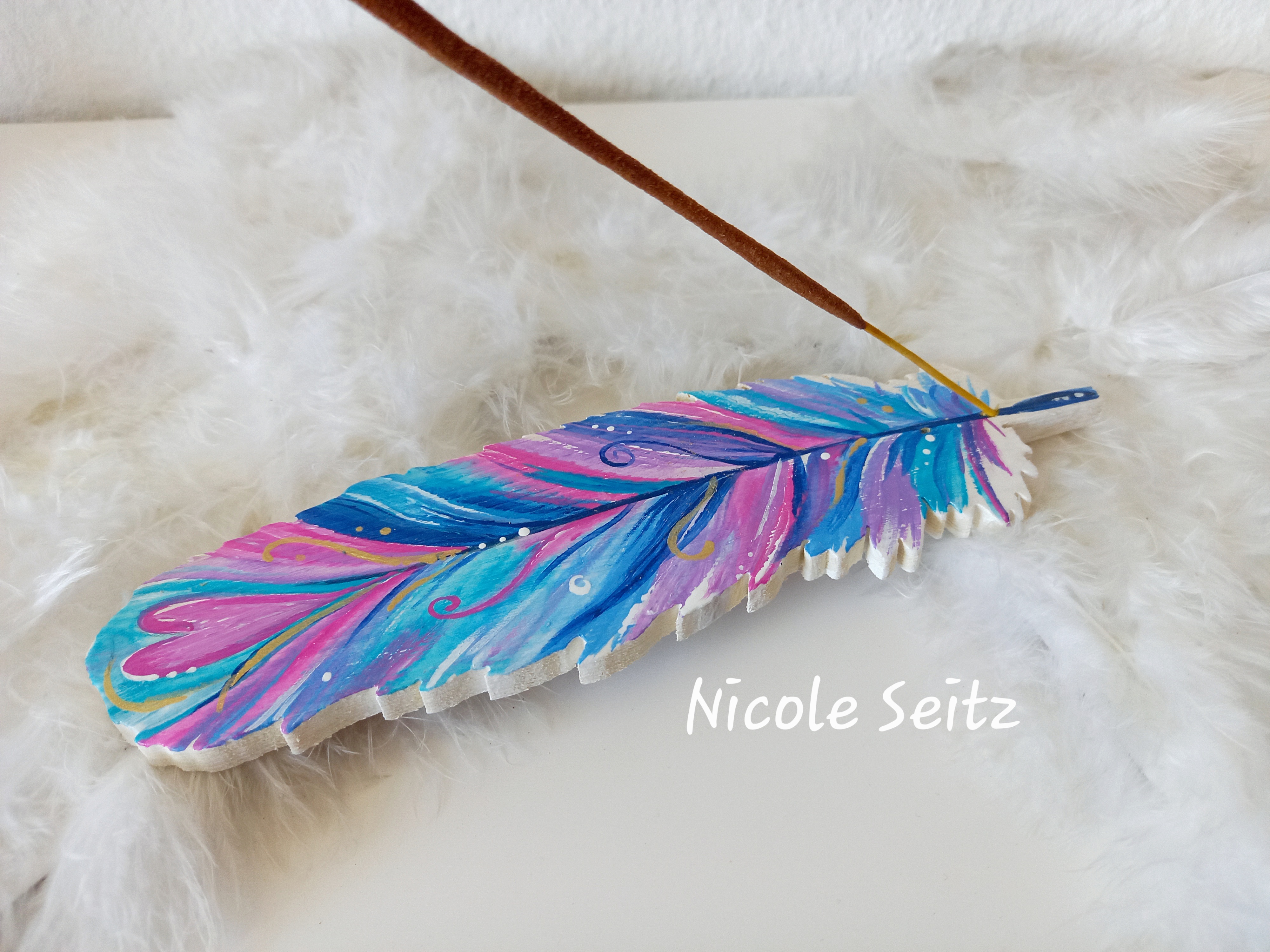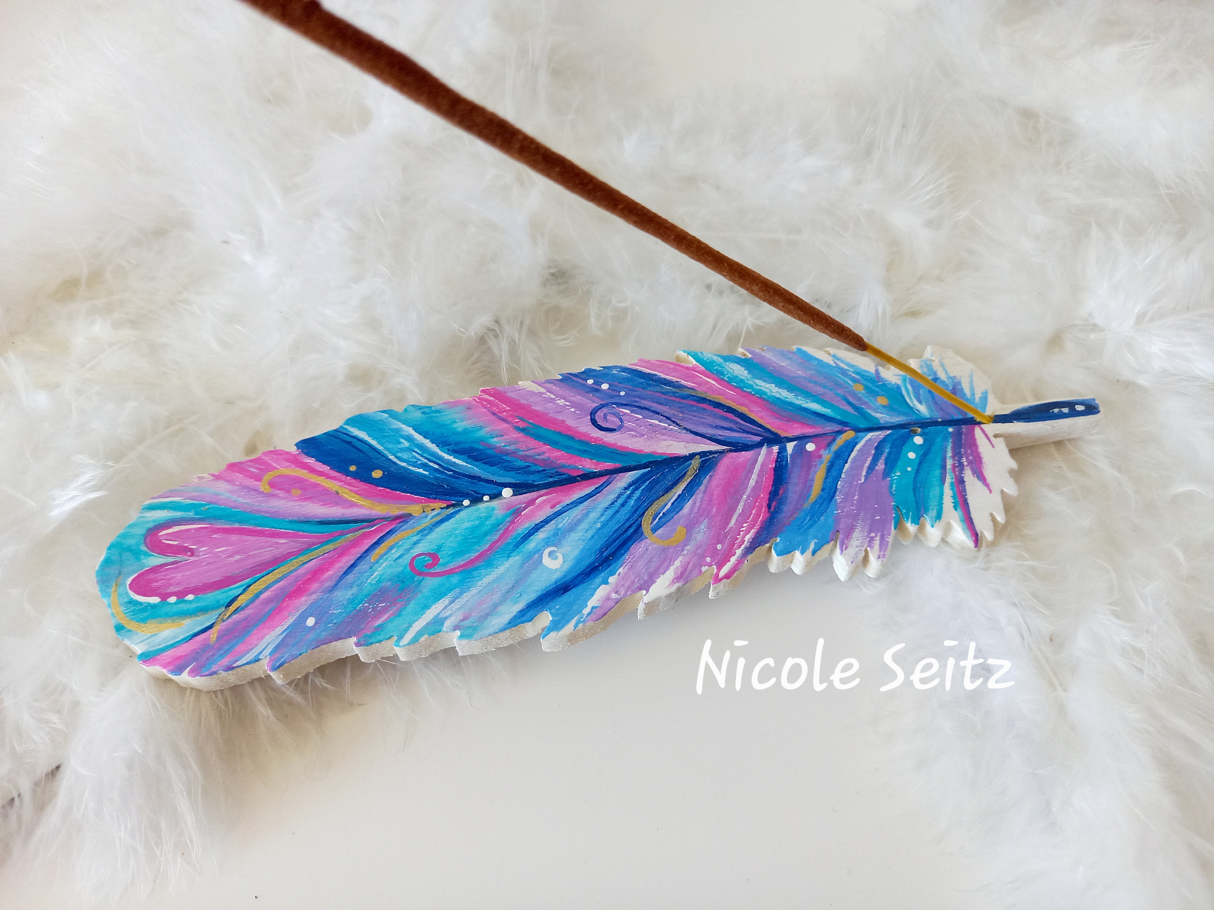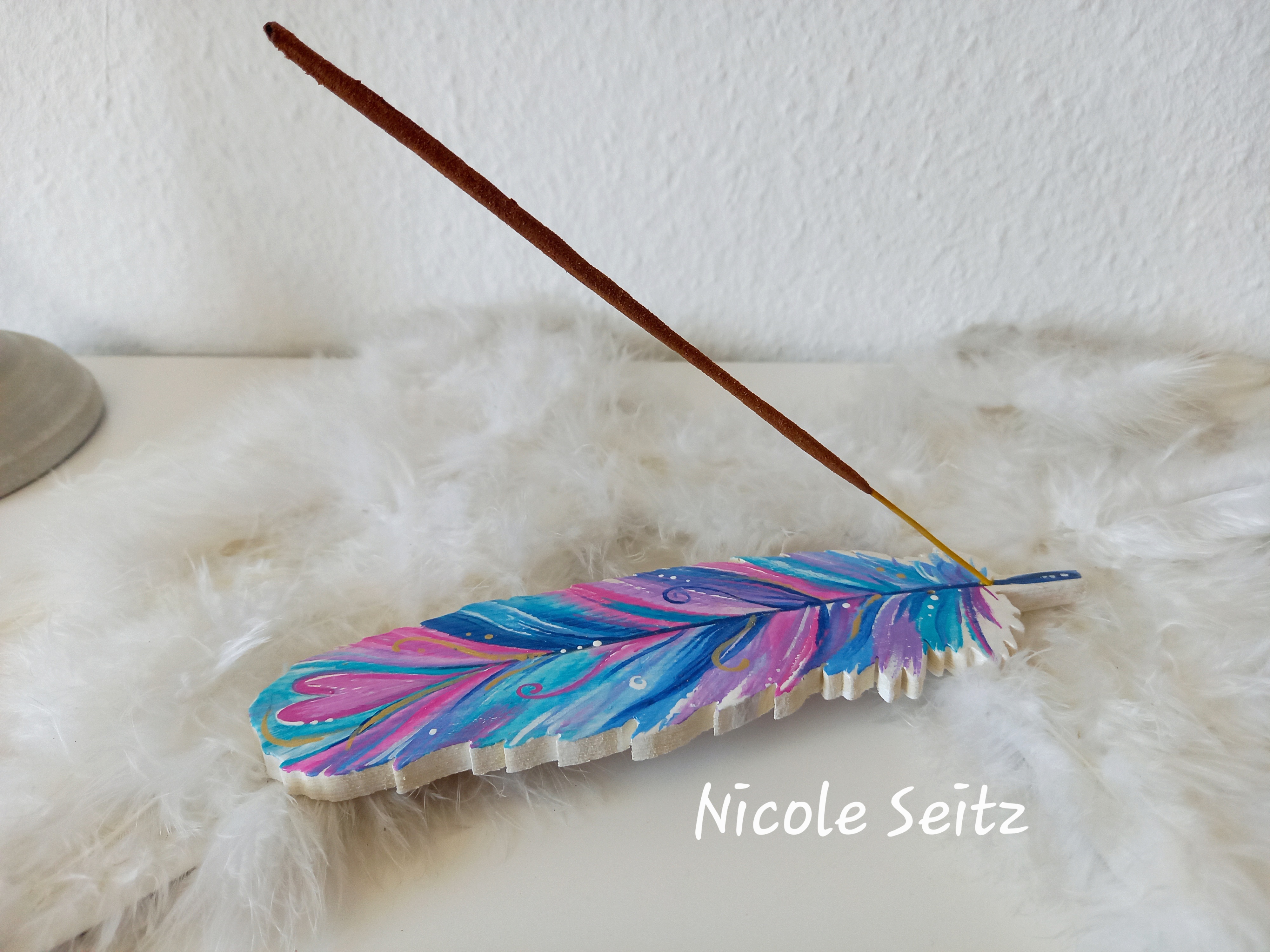 Räucherstäbchenhalter * Feder * Handarbeit, handbemalt * Blau, Pink, Lila