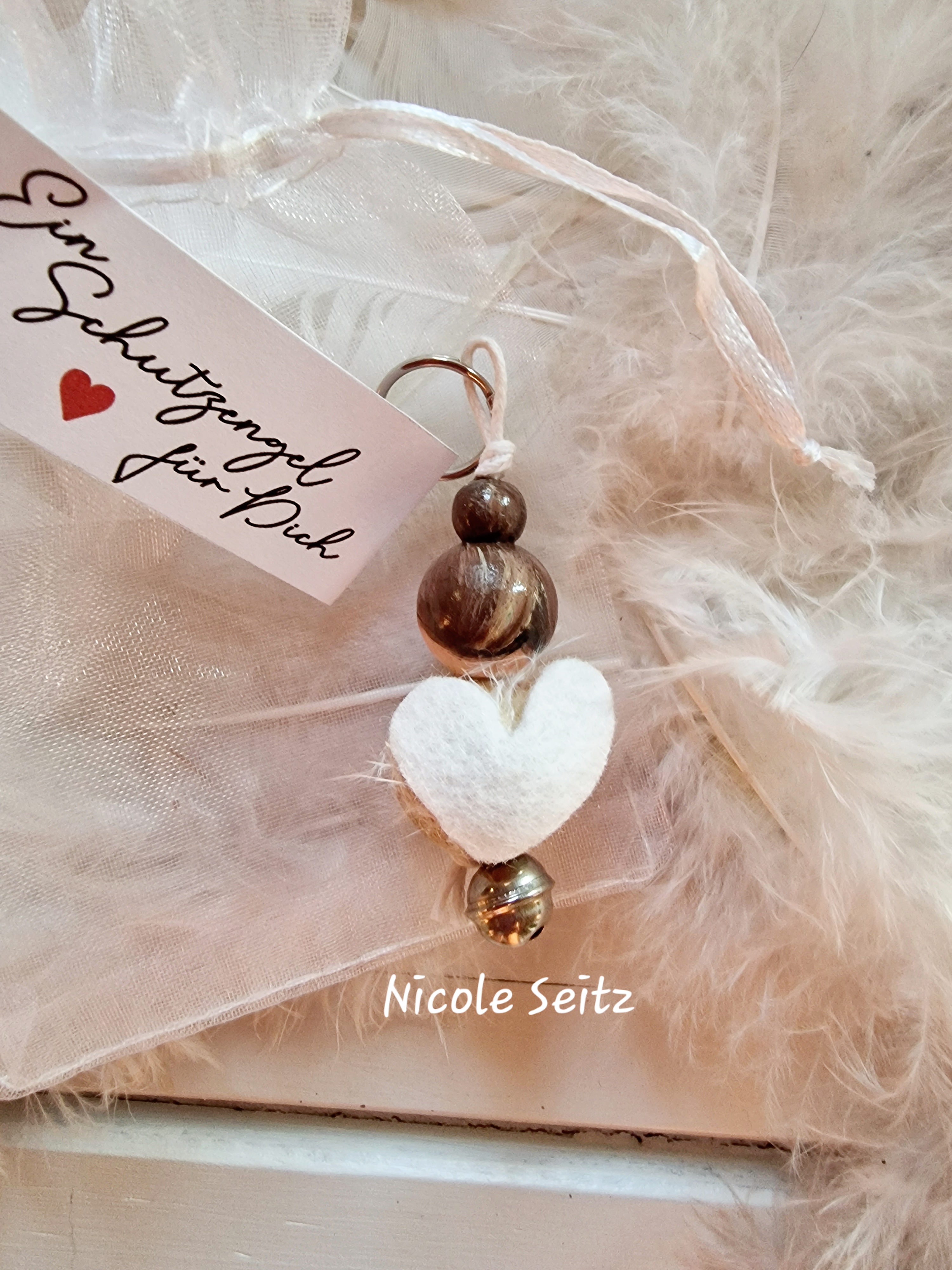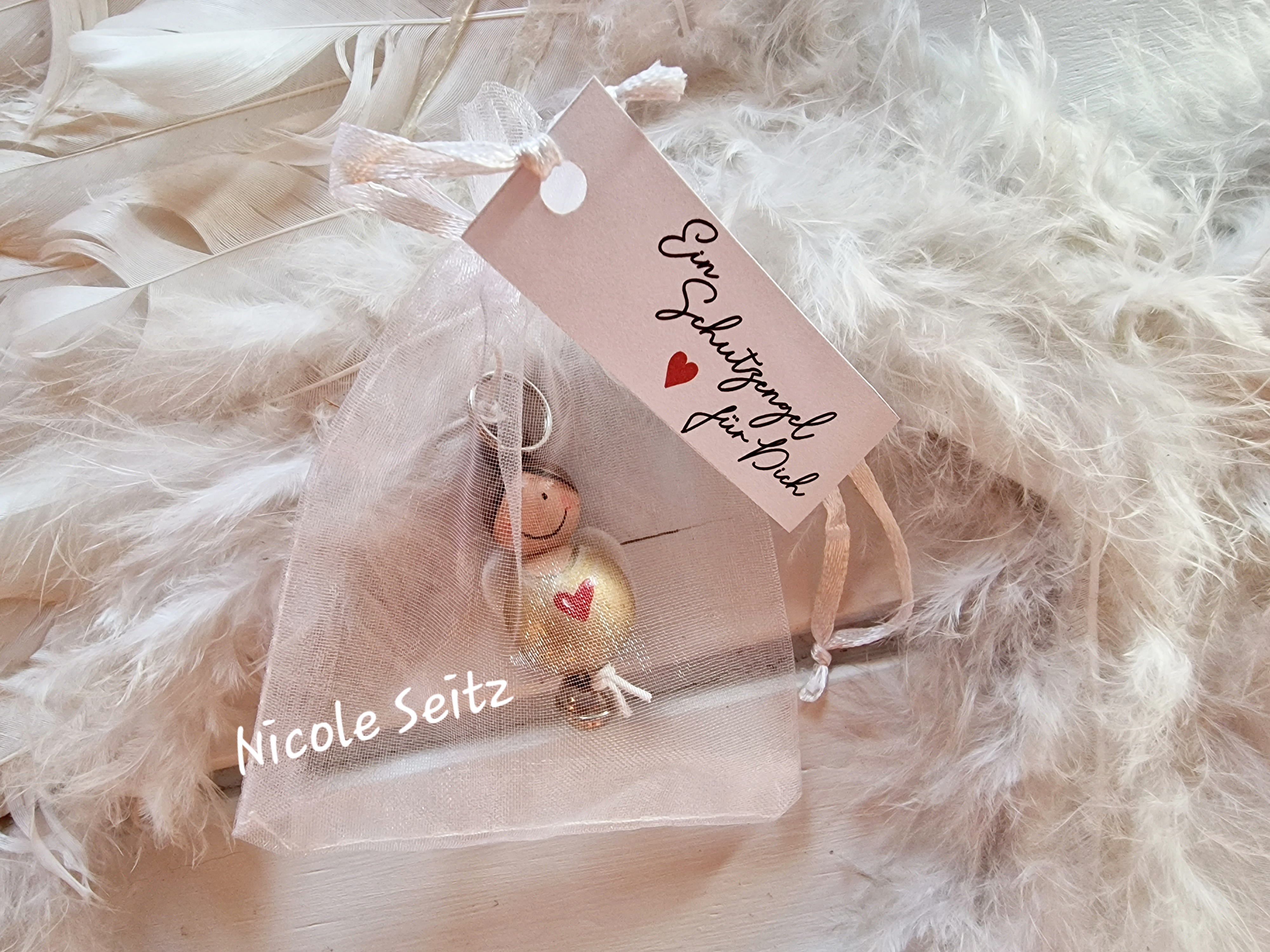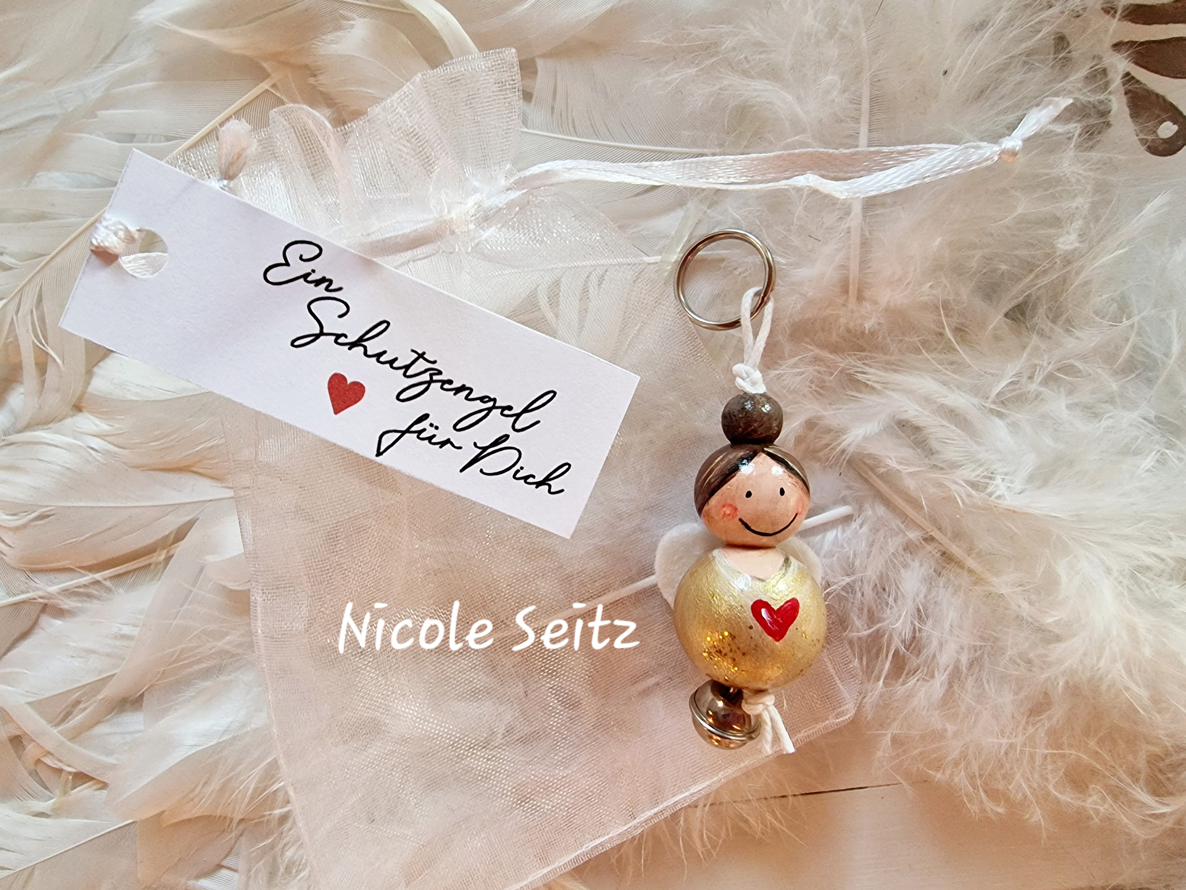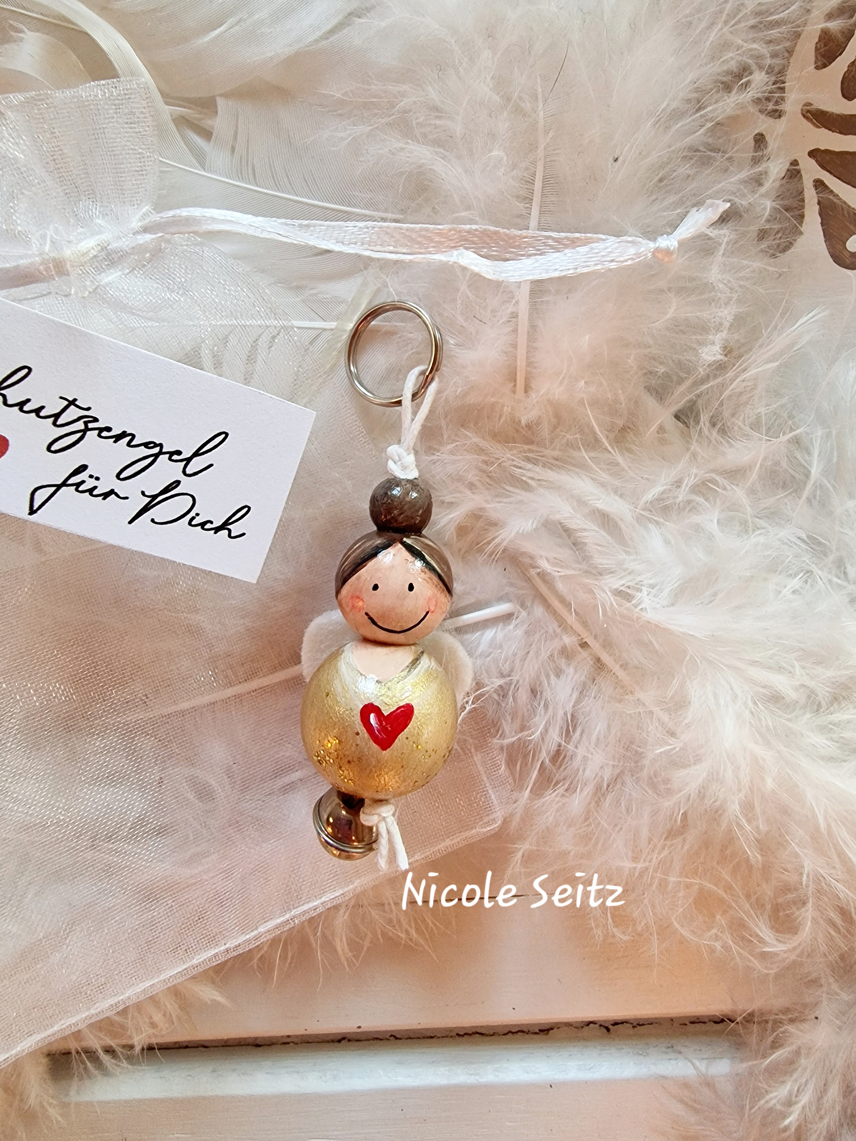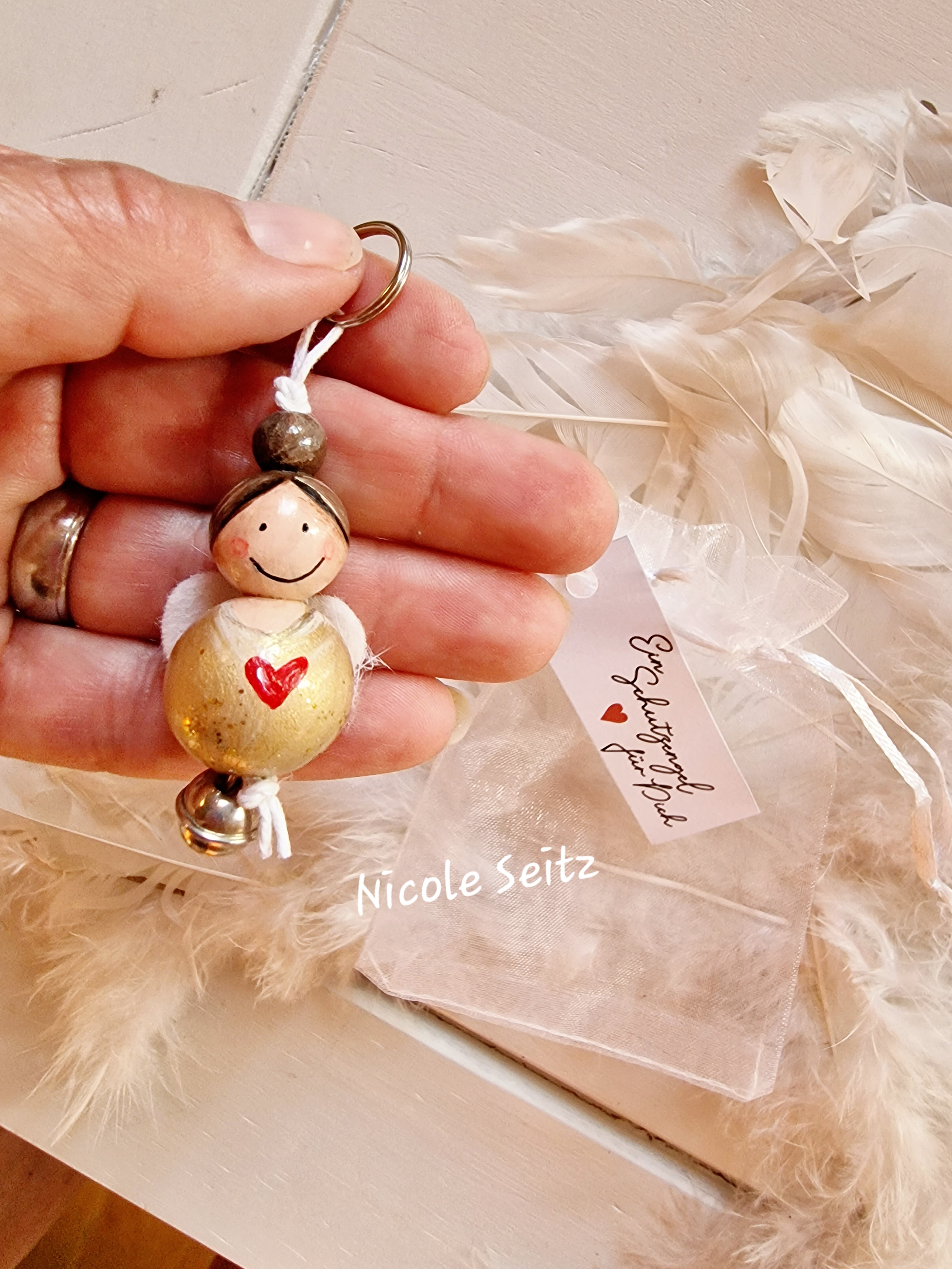 Schlüssel-/Taschenanhänger * Engel * aus handbemalten Holzperlen * im Organzabeutel * Gold