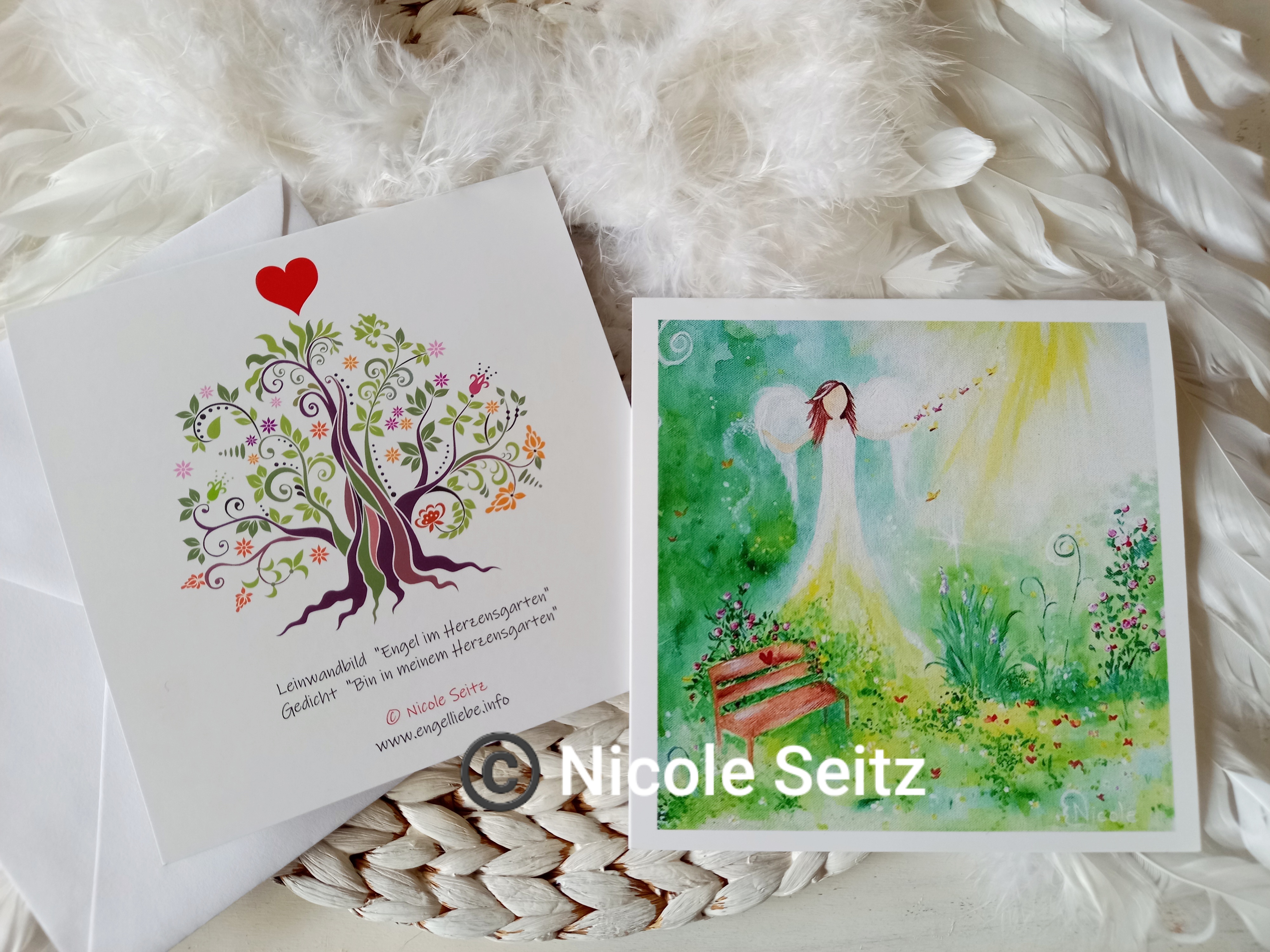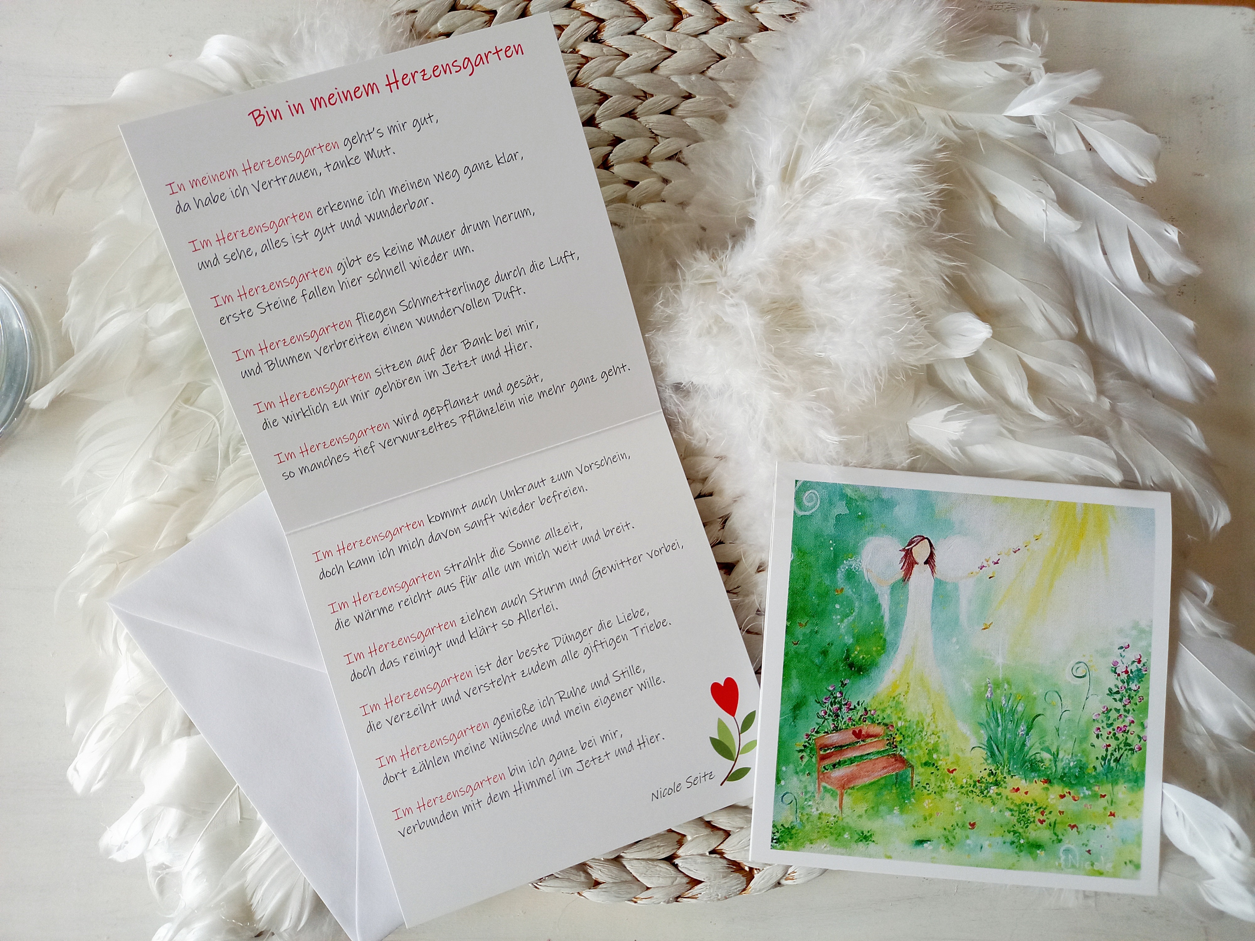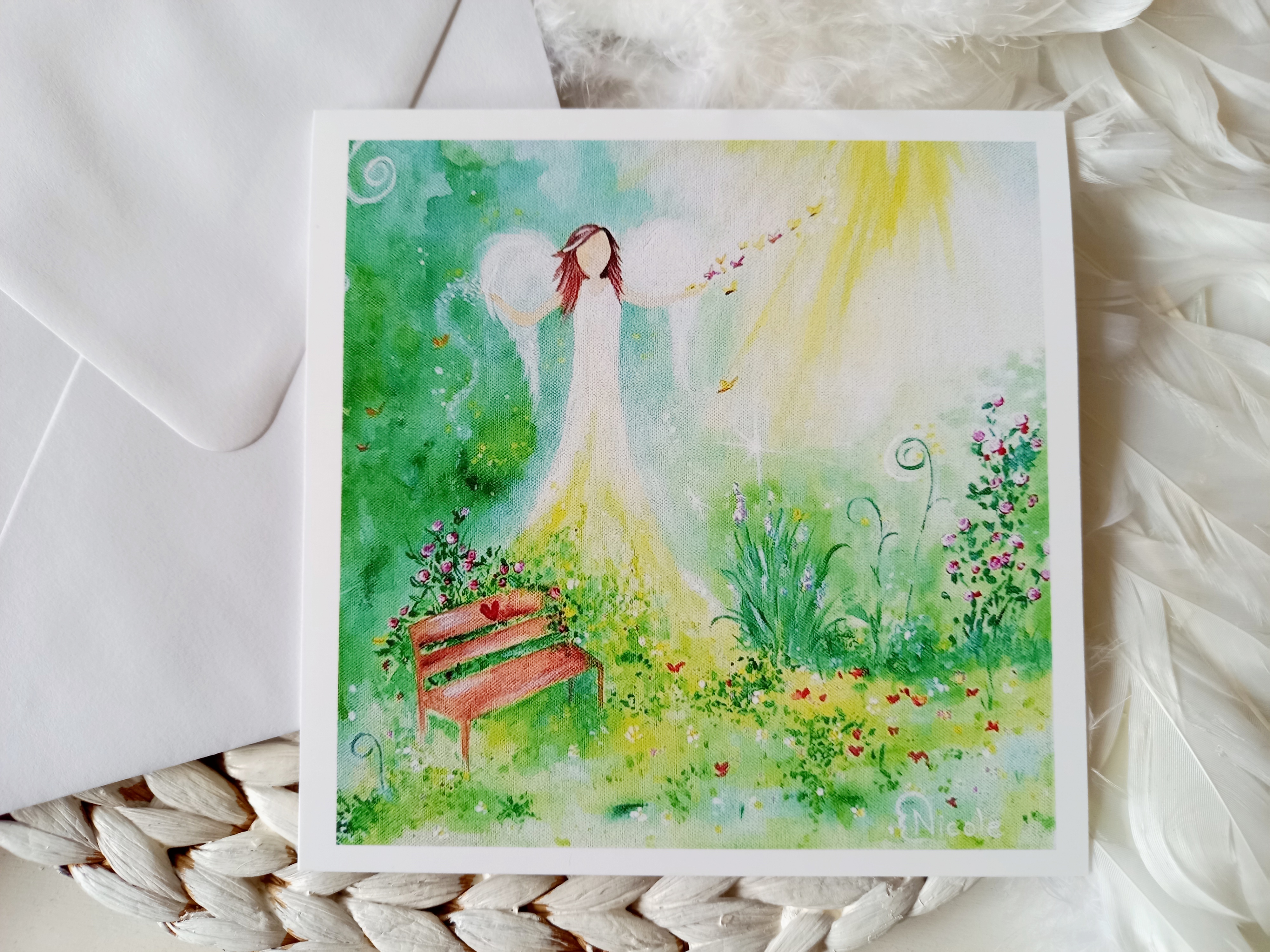 Quadratische Karte mit meinem Engelbild "Engel im Herzensgarten" bedruckt (Originalbild bereits verkauft), den ich zu meinem Gedicht "Bin in meinem Herzensgarten" gemalt habe. Dieses ist auf die Innenseite der Karte gedruckt.