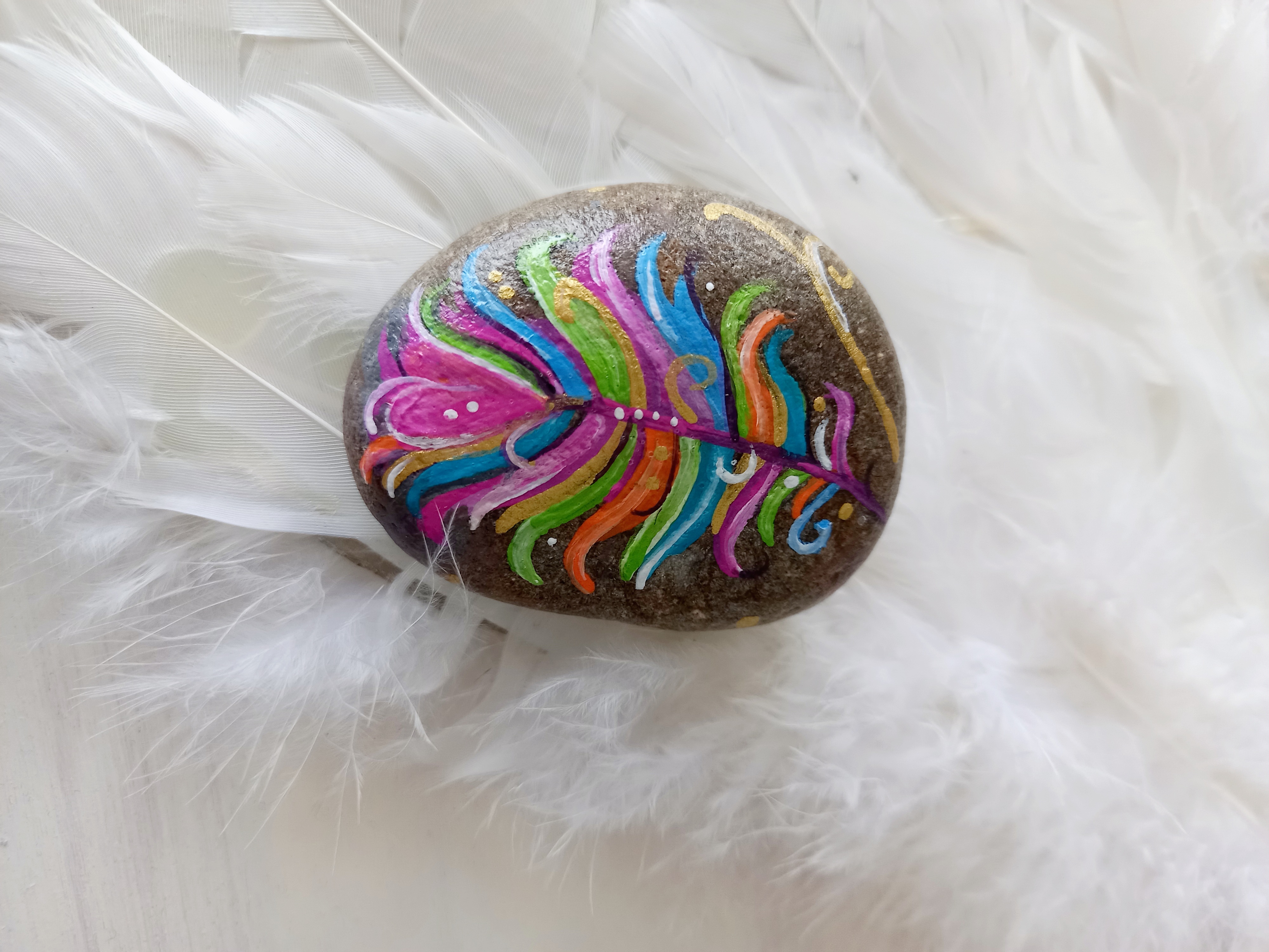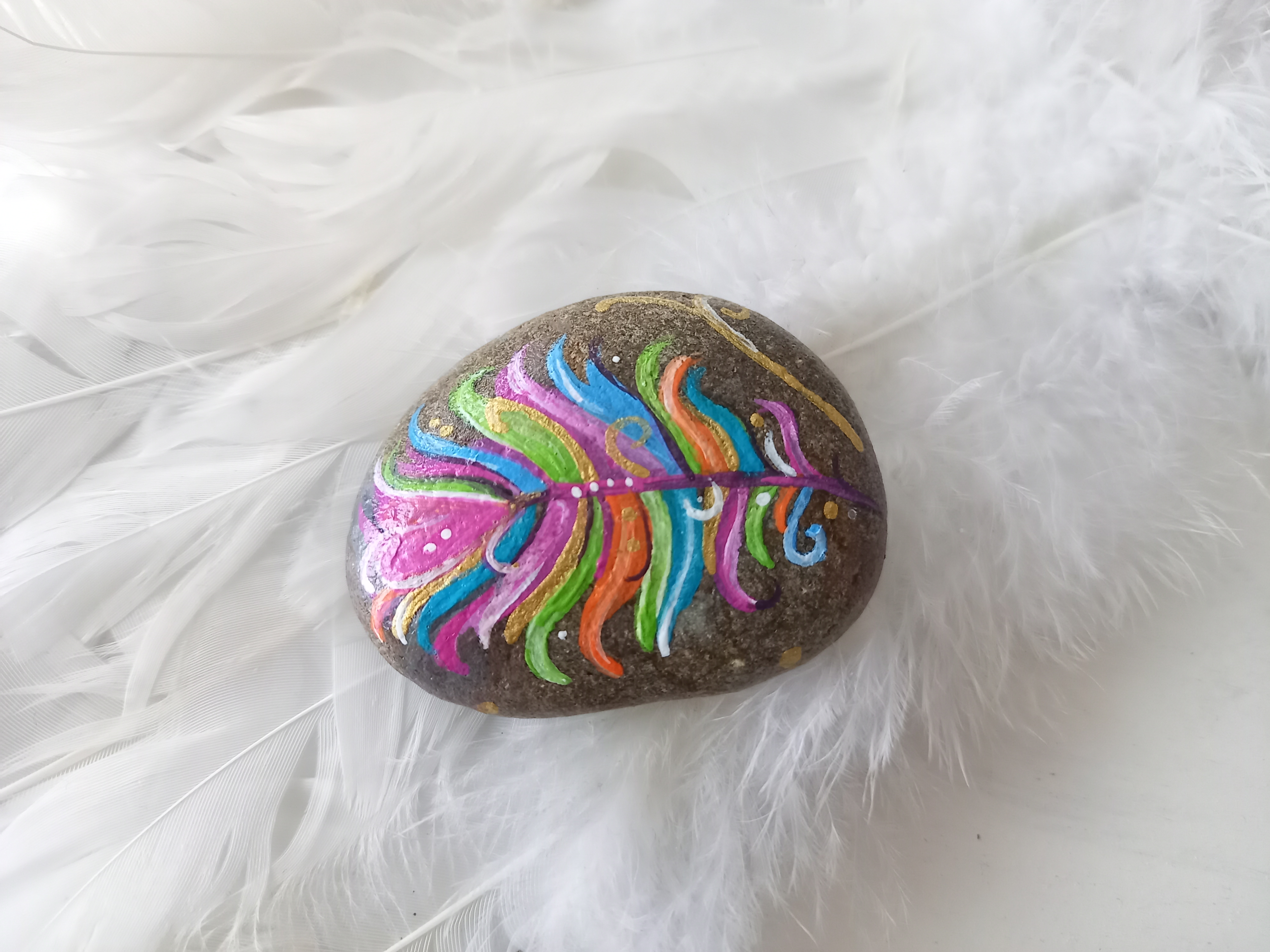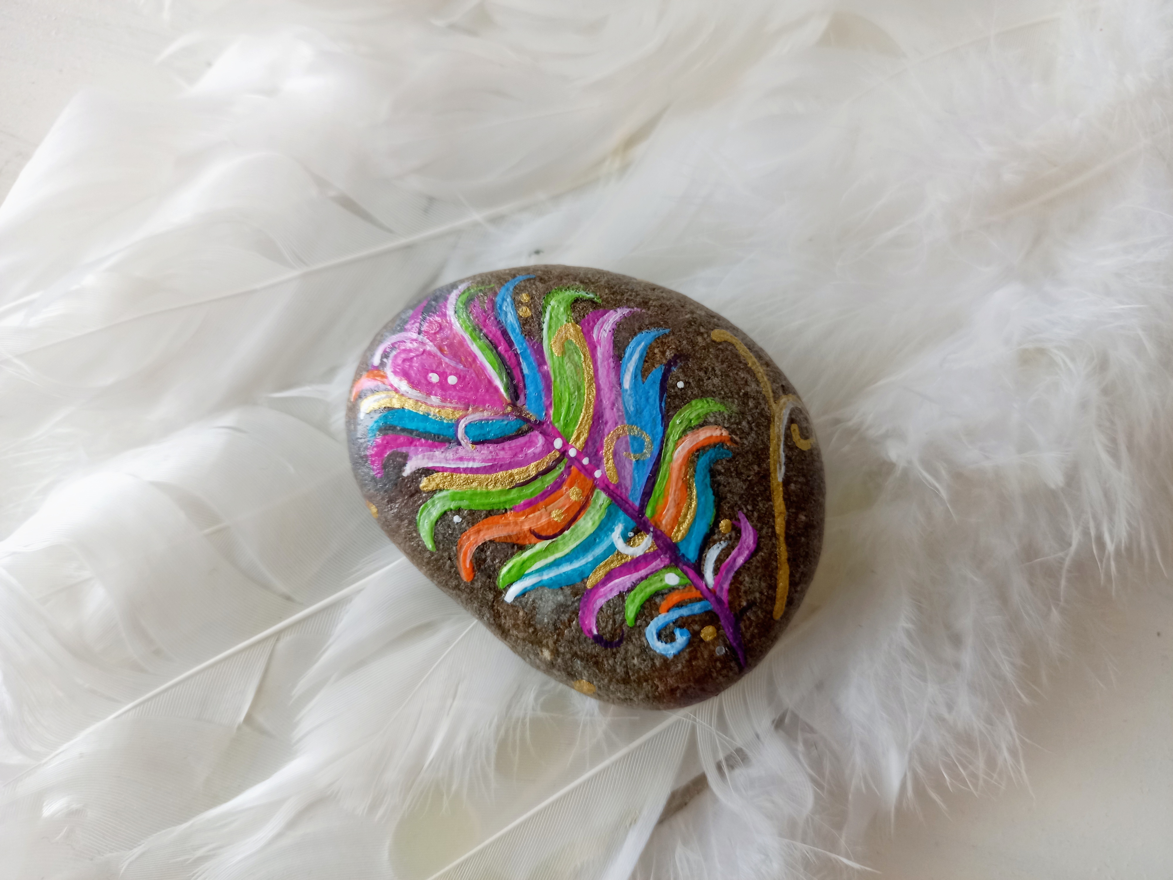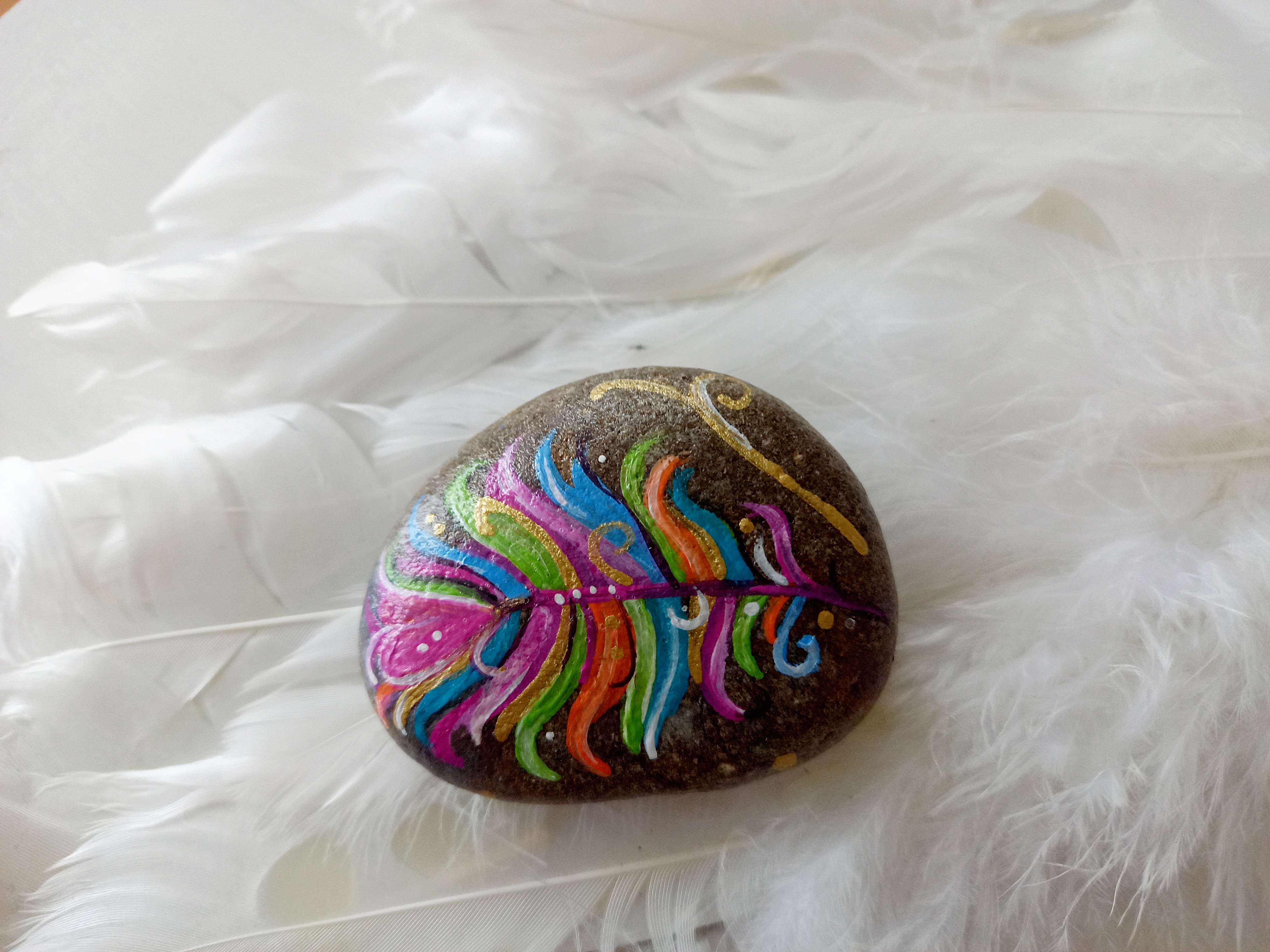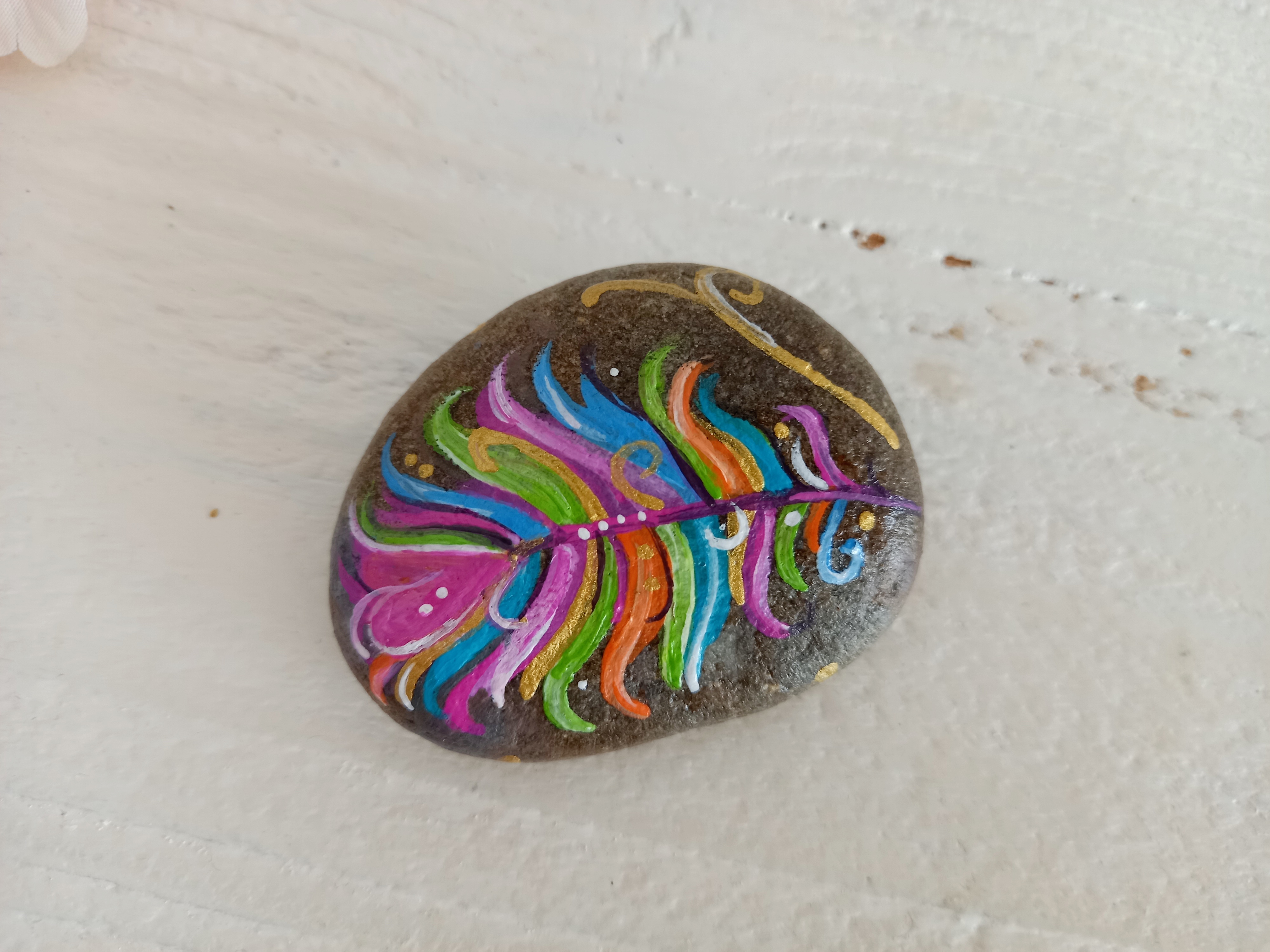 Stein mit bunter Feder bemalt