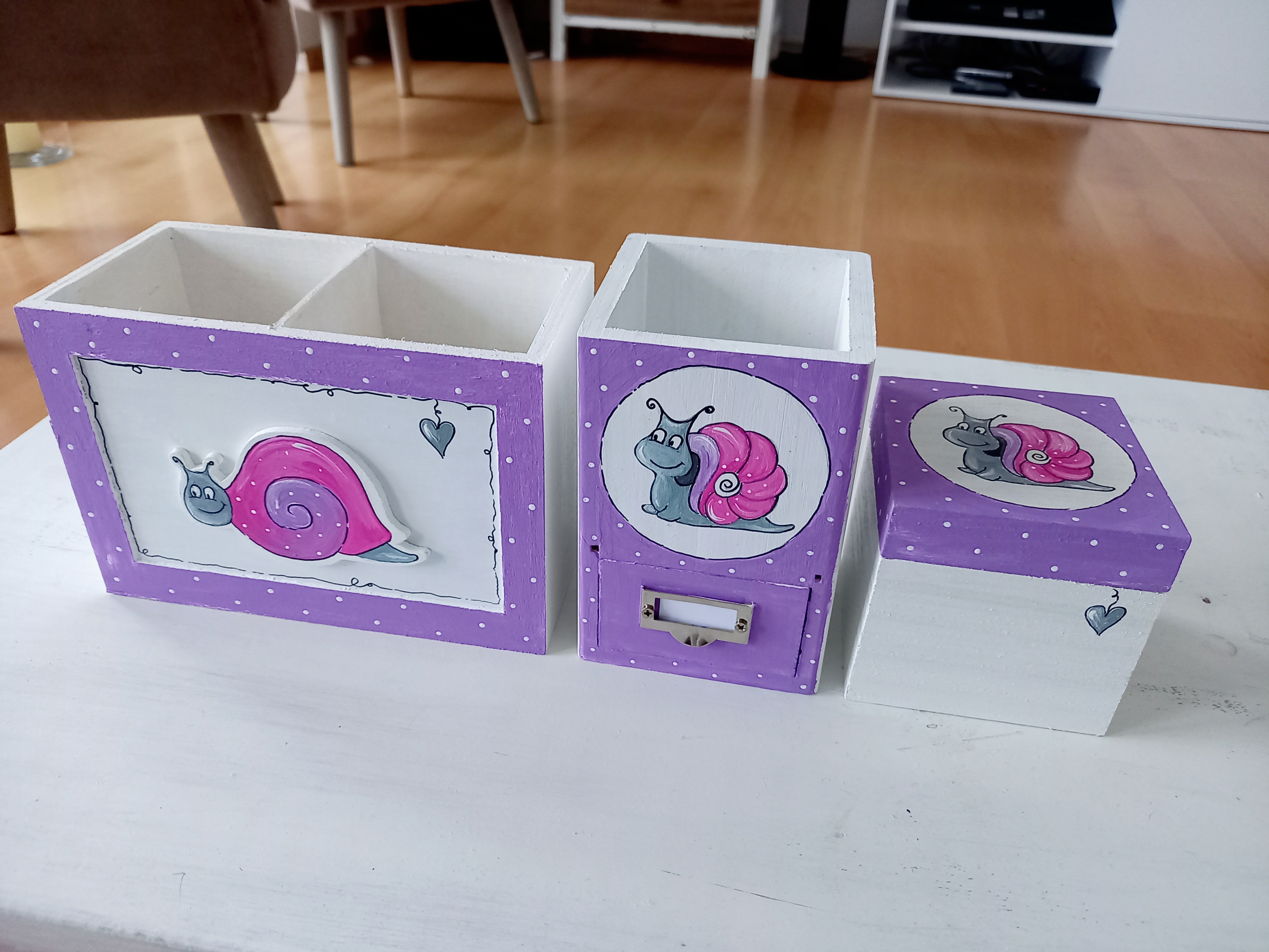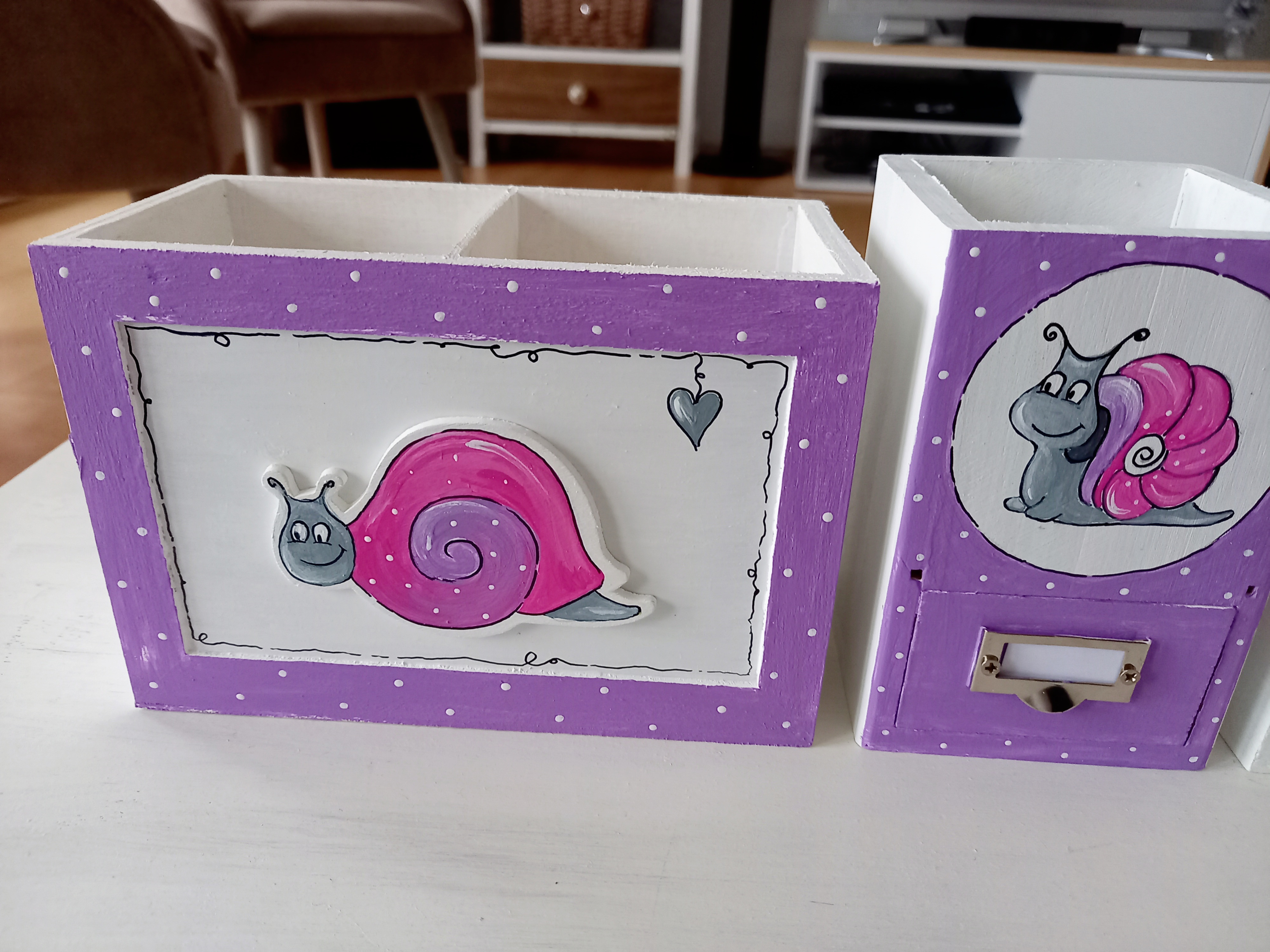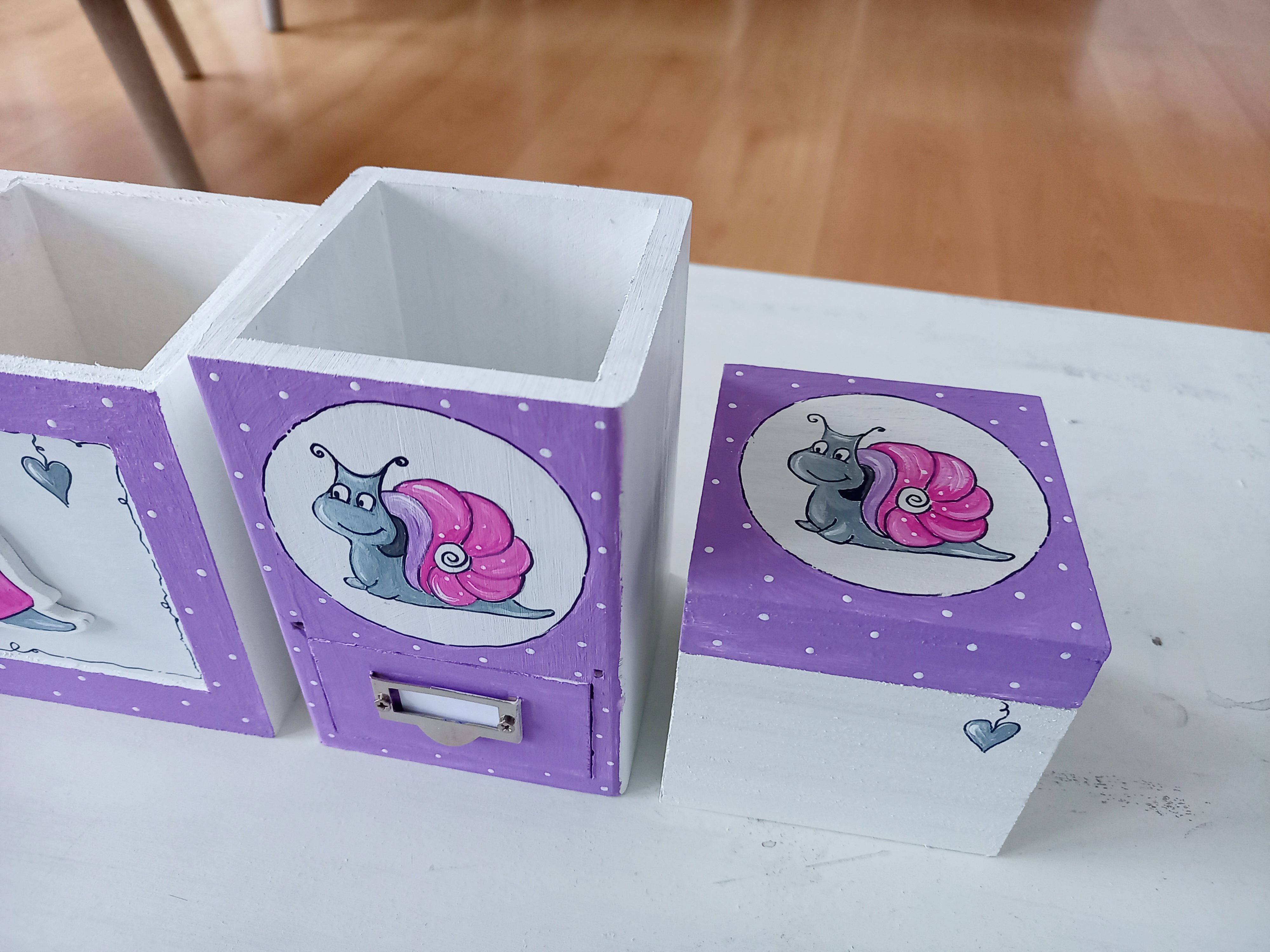 Stiftehalter mit bemaltem Holzmotiv. Utensilienbox mit kleiner Schublade (+Beschriftungsfeld).