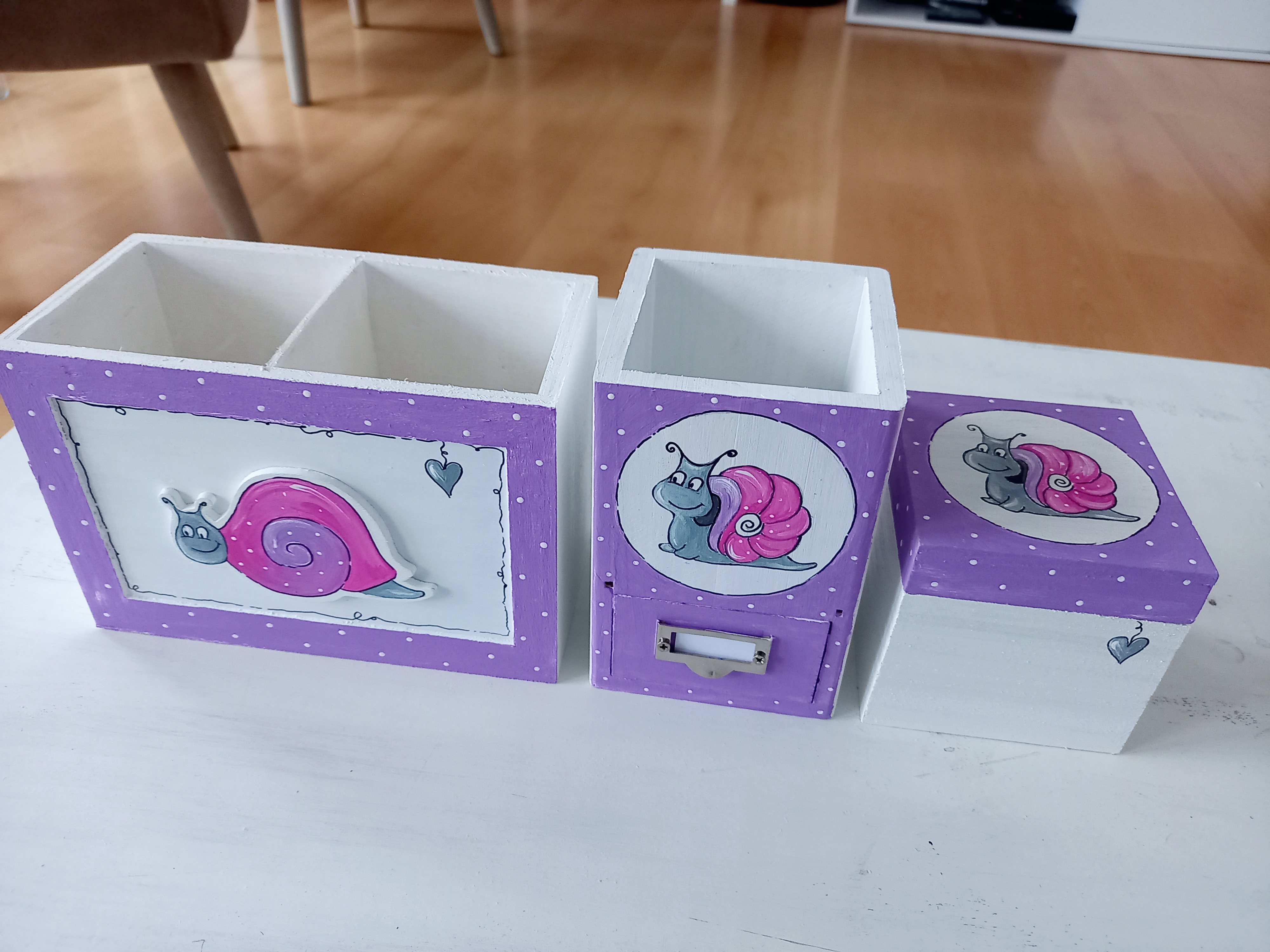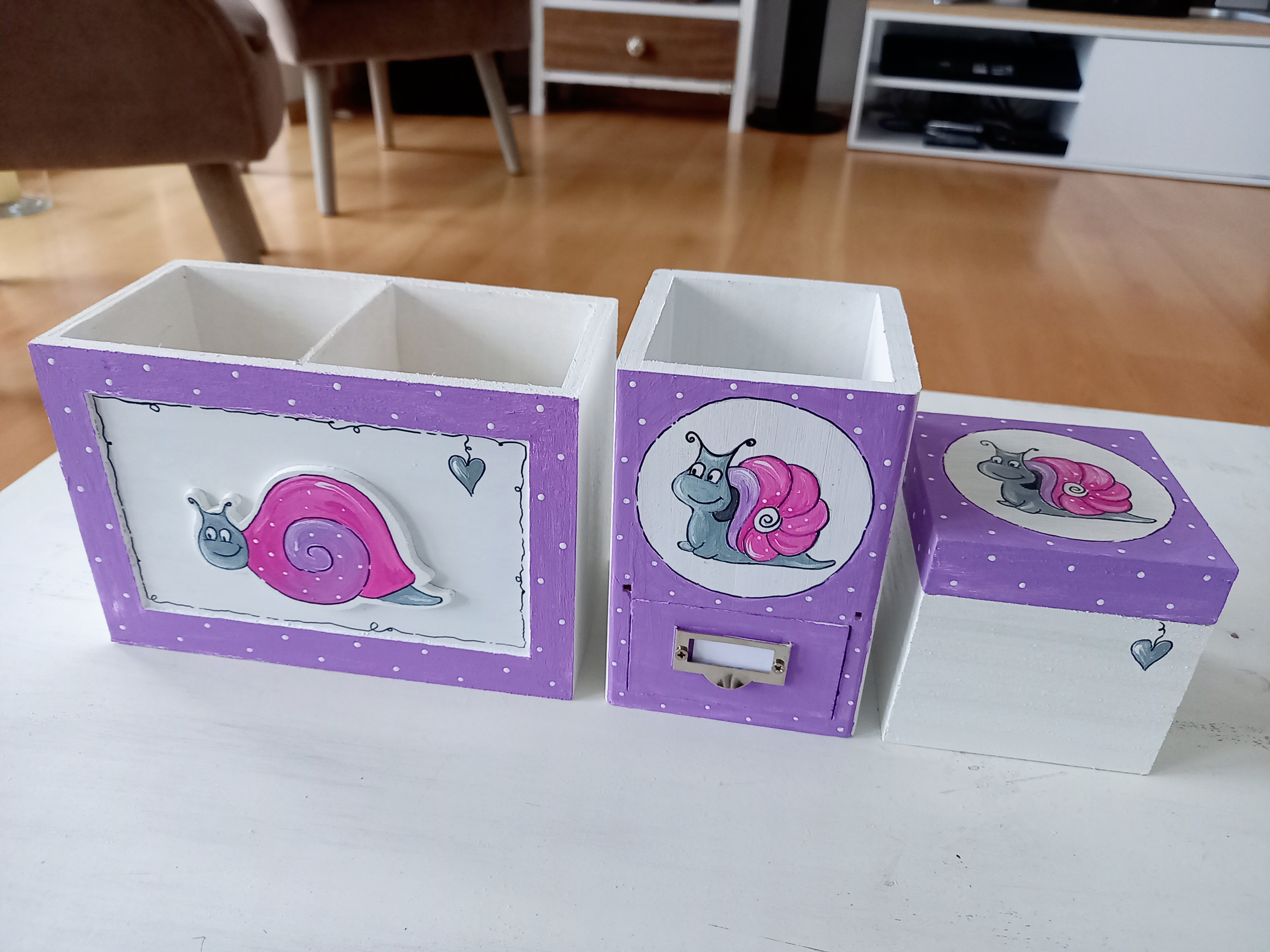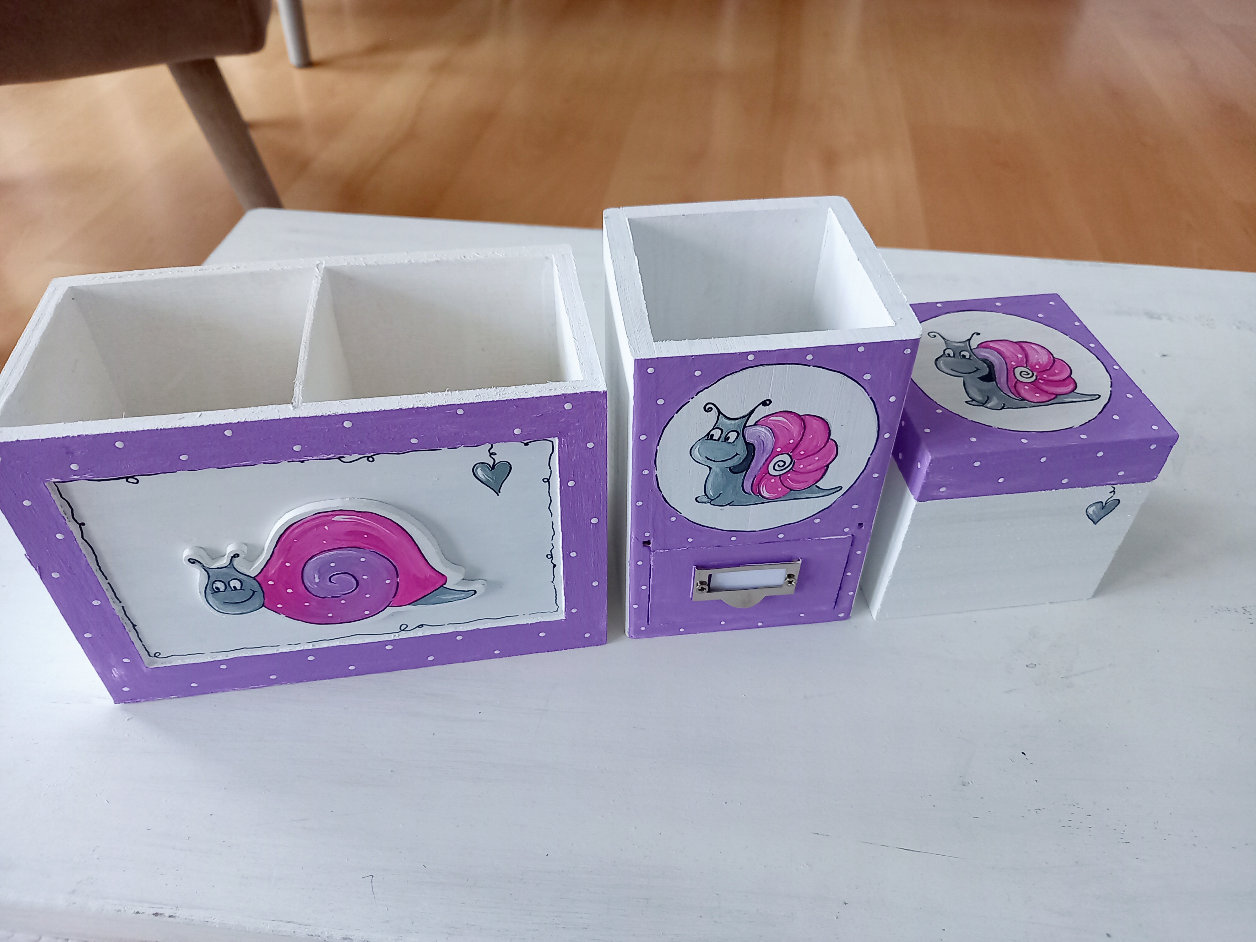Stiftehalter mit bemaltem Holzmotiv. Utensilienbox mit kleiner Schublade (+Beschriftungsfeld).