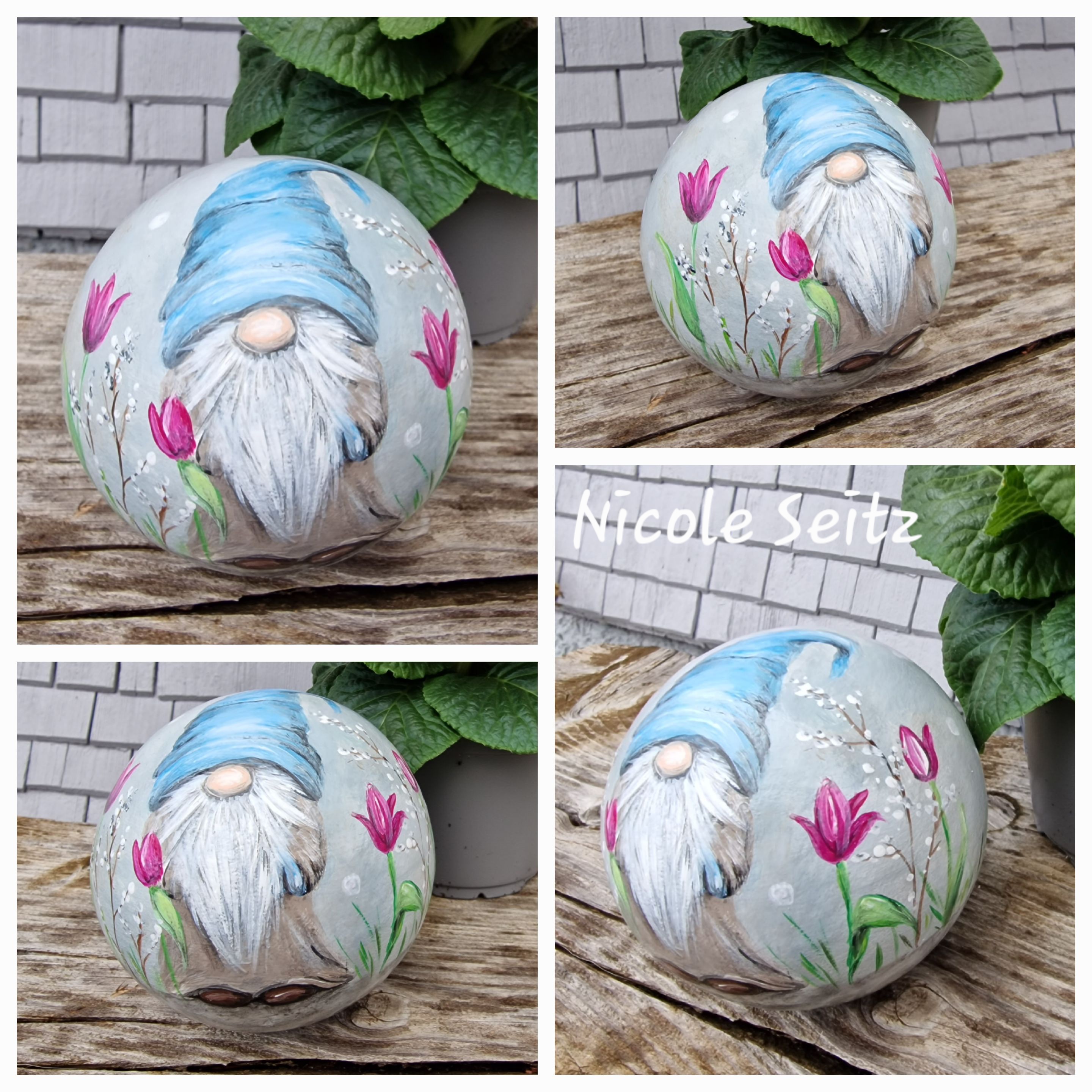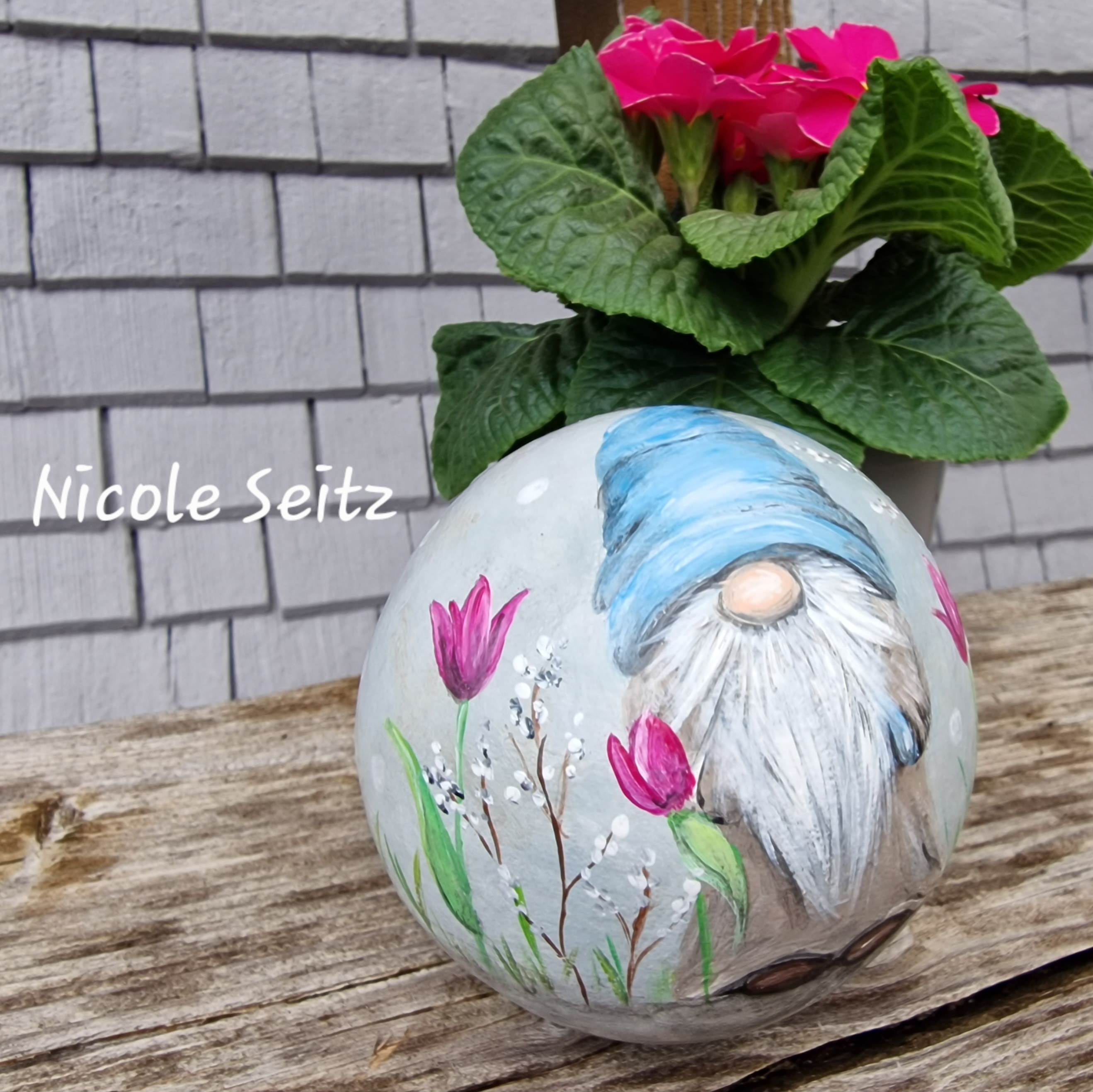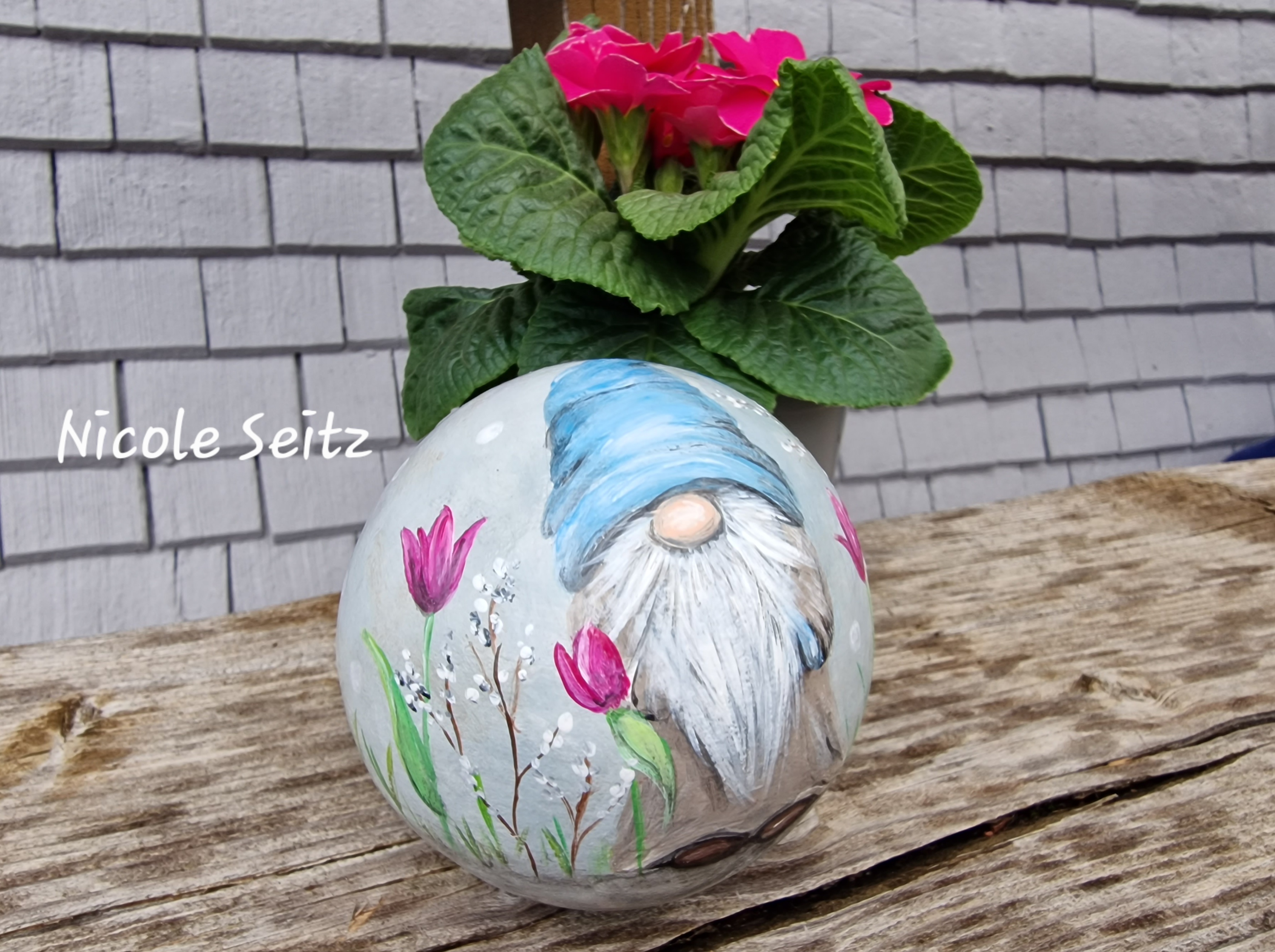 Zweimal mit guten Farben für den Außenbereich bemalt und mit einem glänzenden Acryllack zum noch besseren Schutz überzogen.