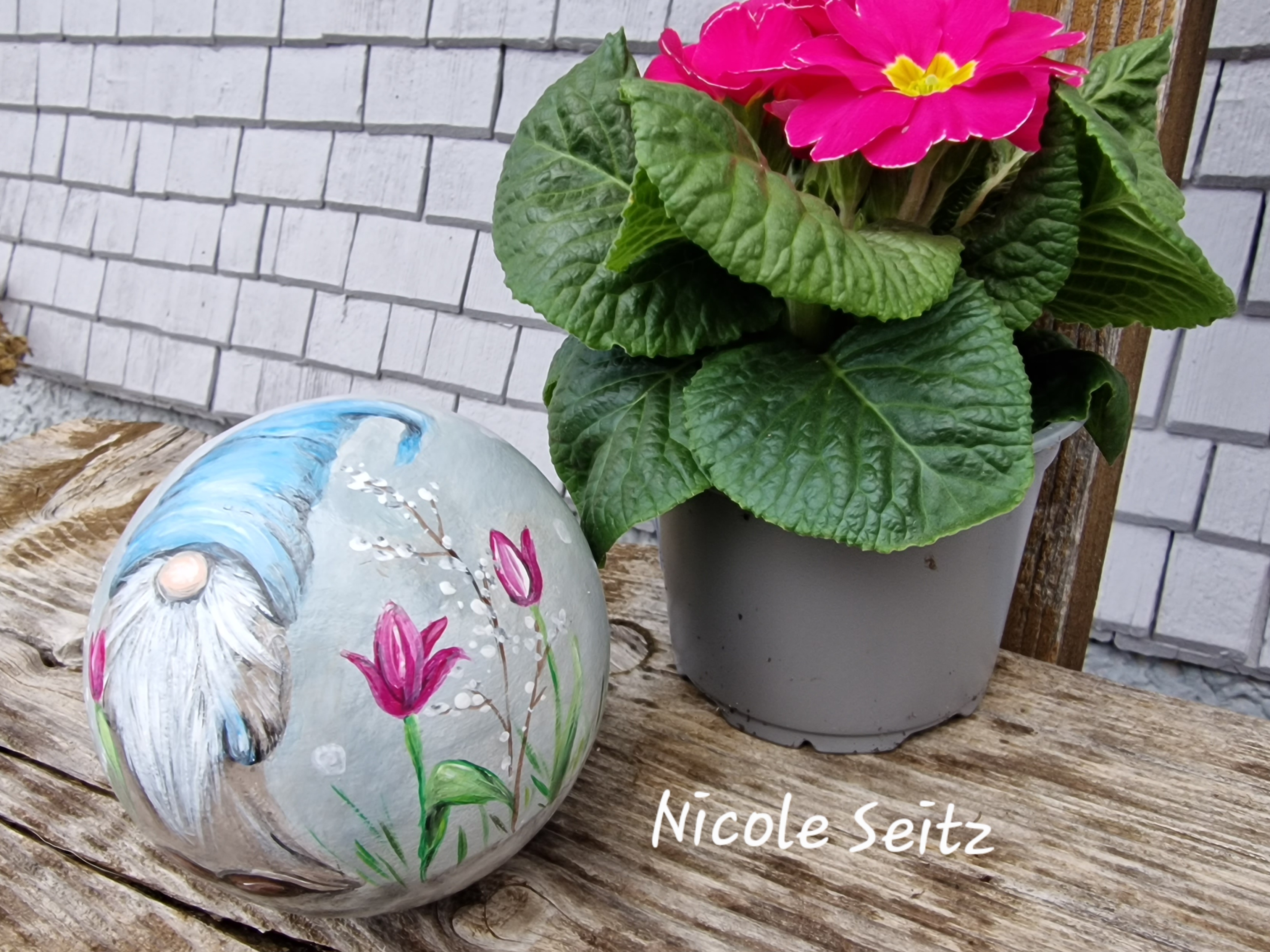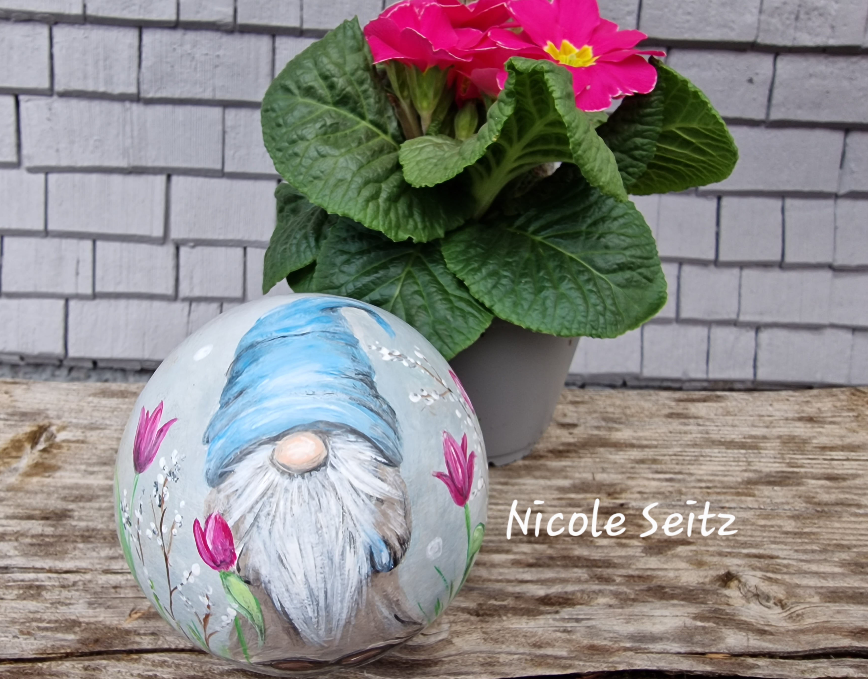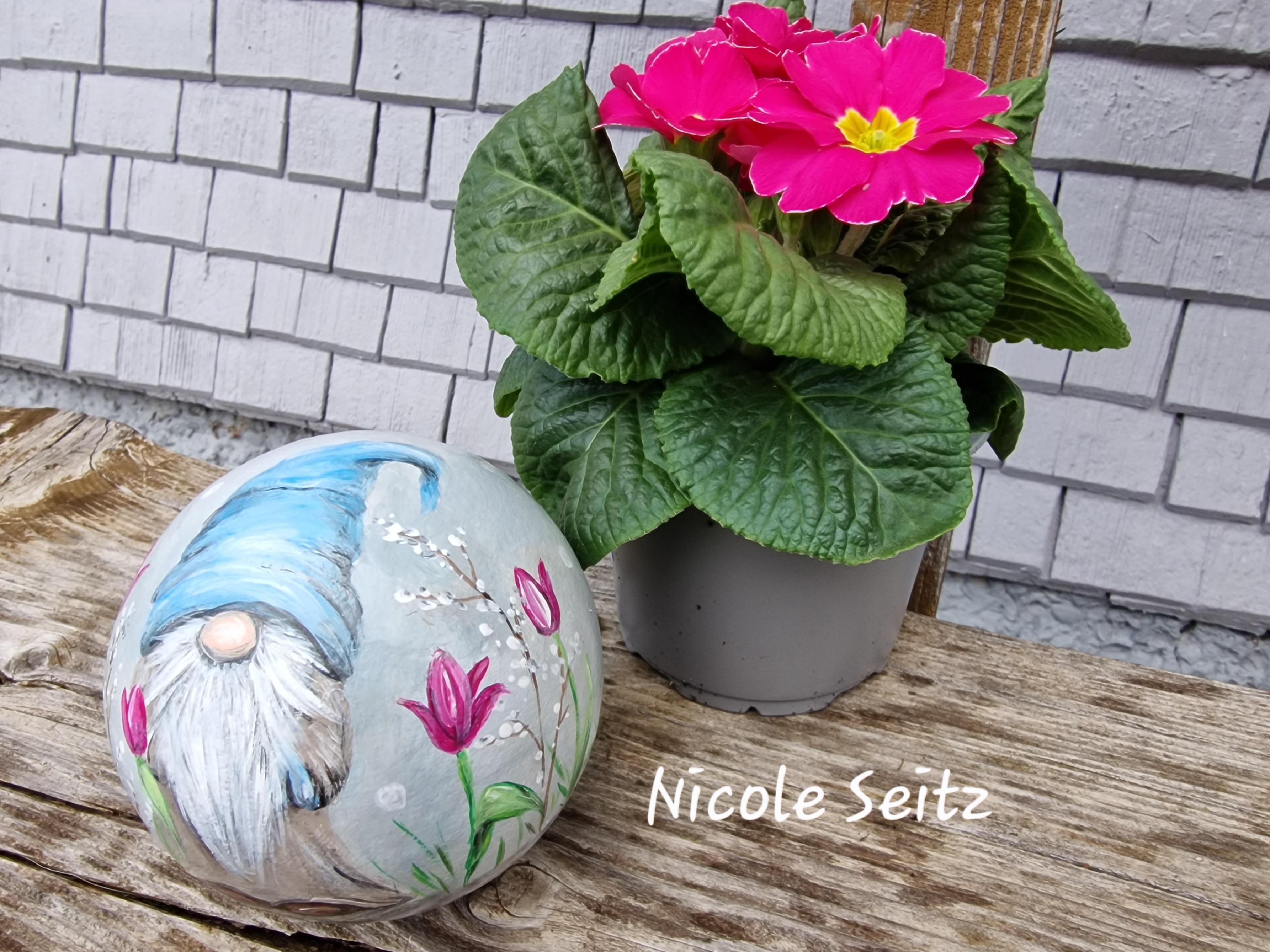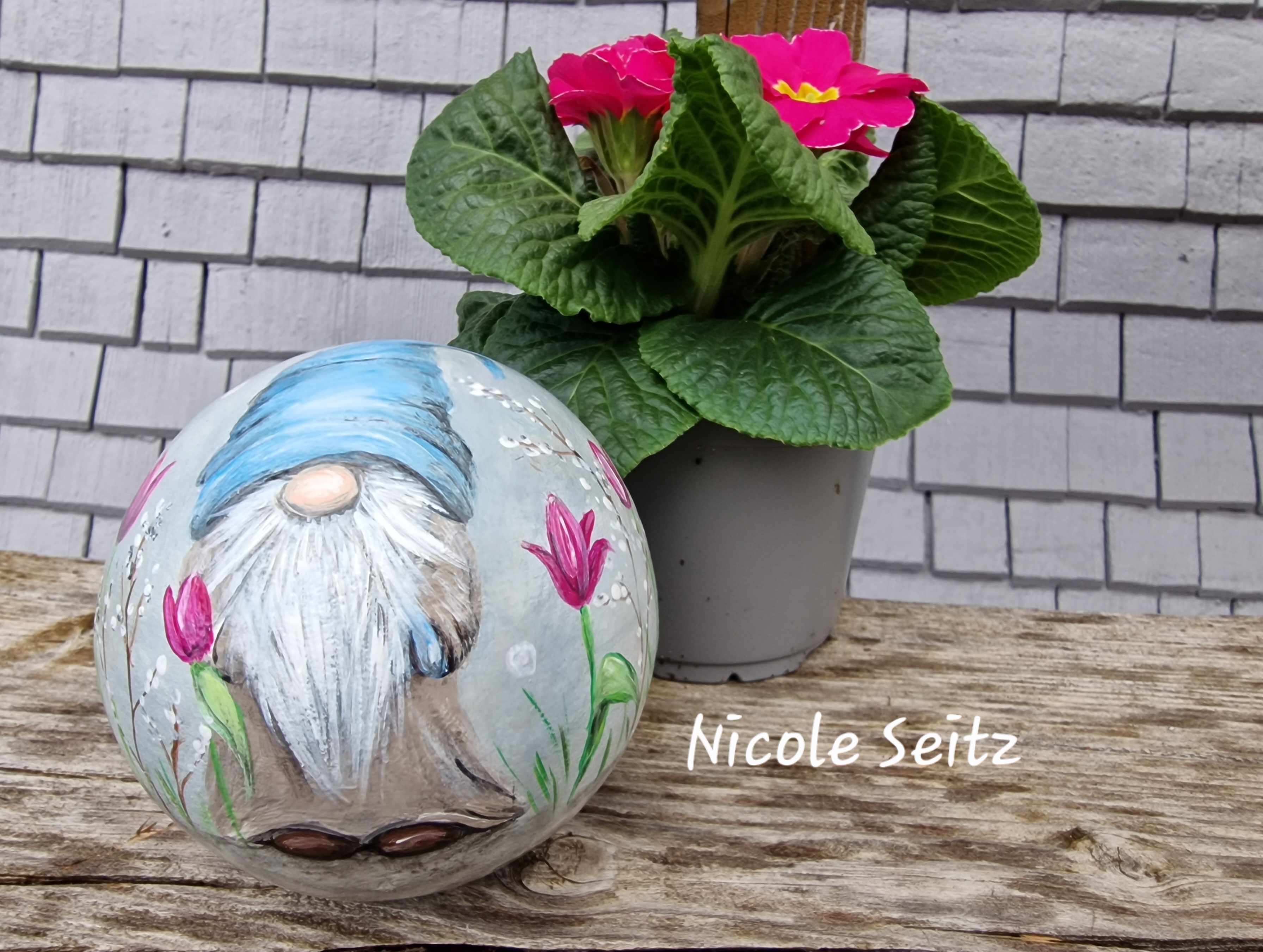 Zweimal mit guten Farben für den Außenbereich bemalt und mit einem glänzenden Acryllack zum noch besseren Schutz überzogen.