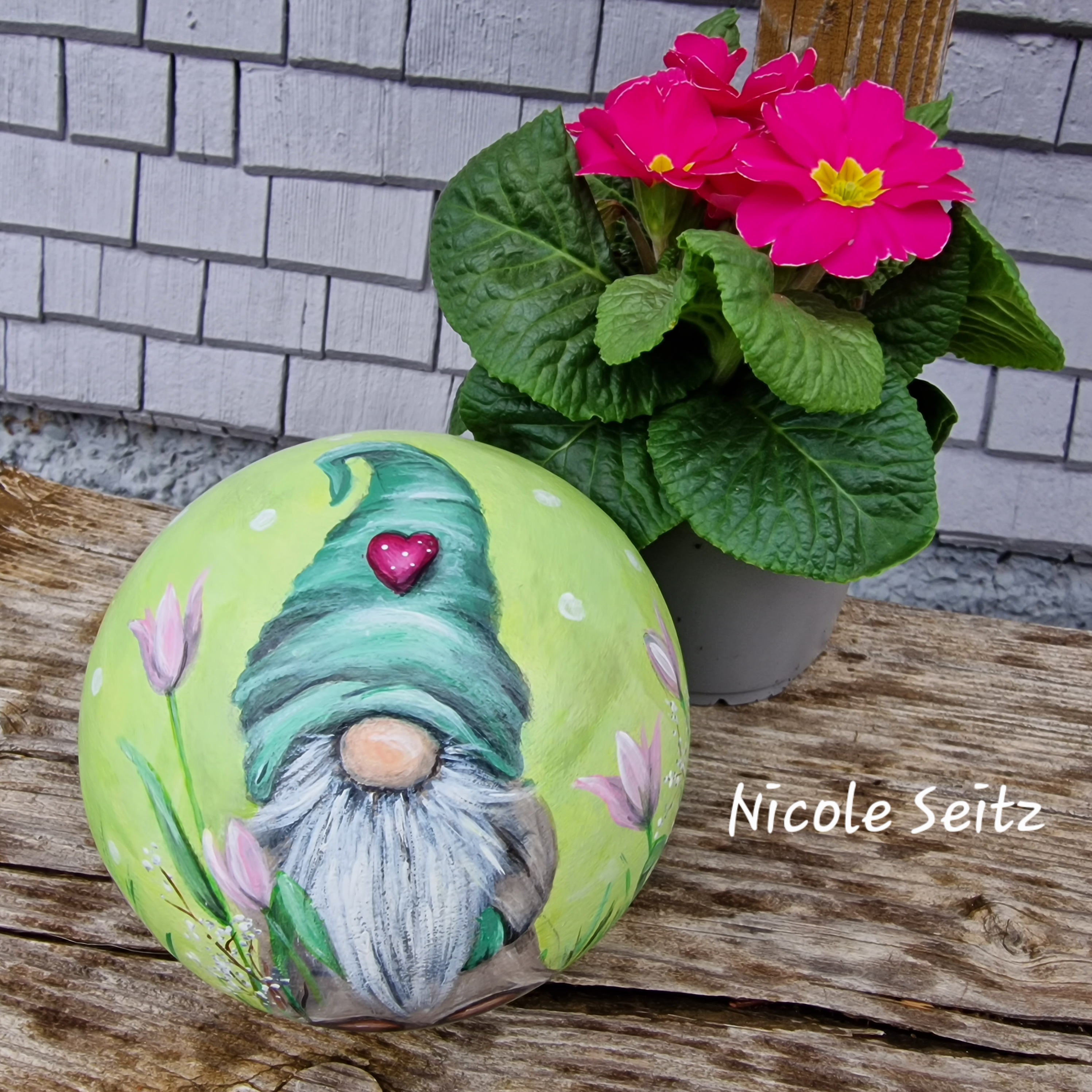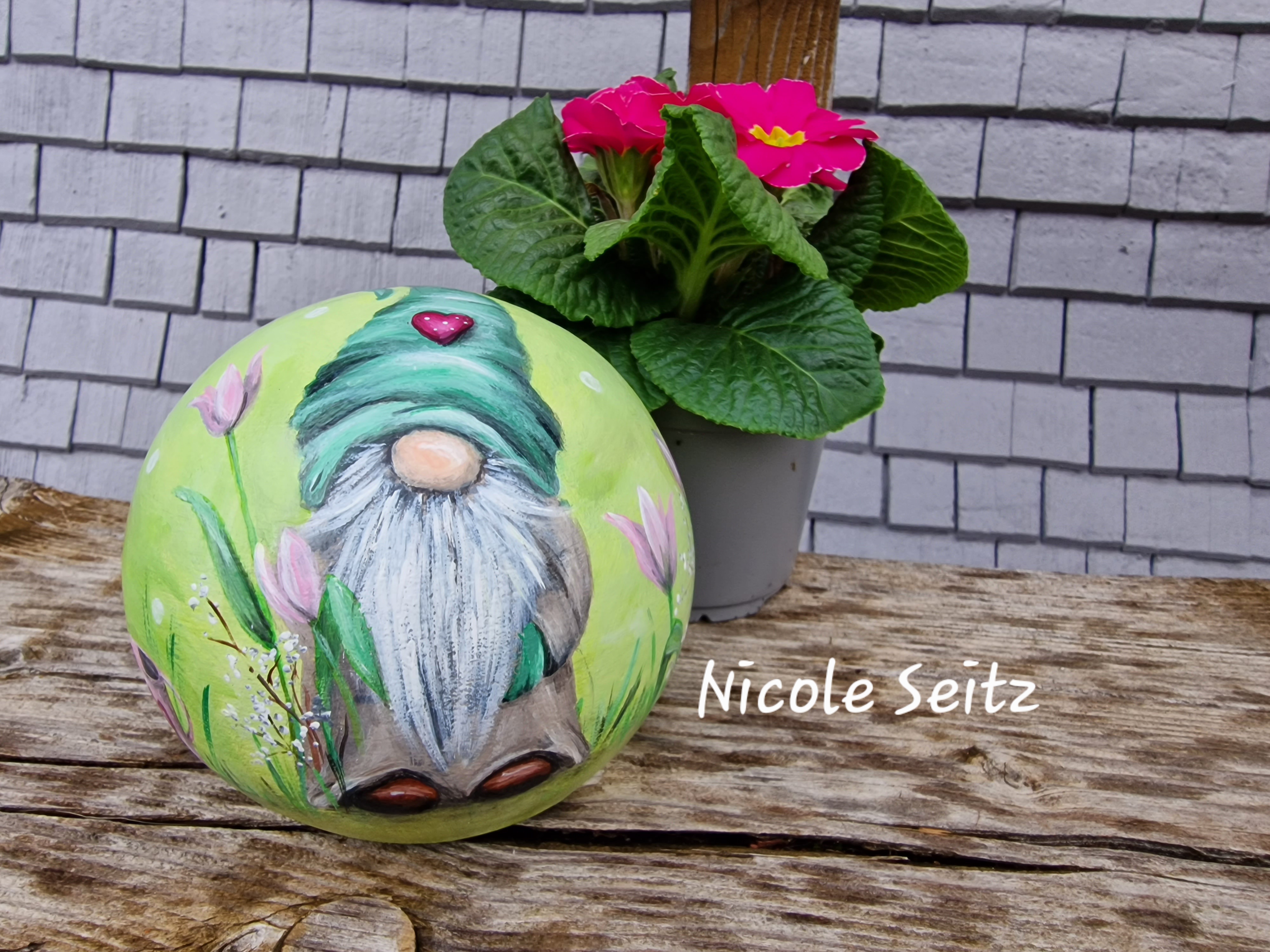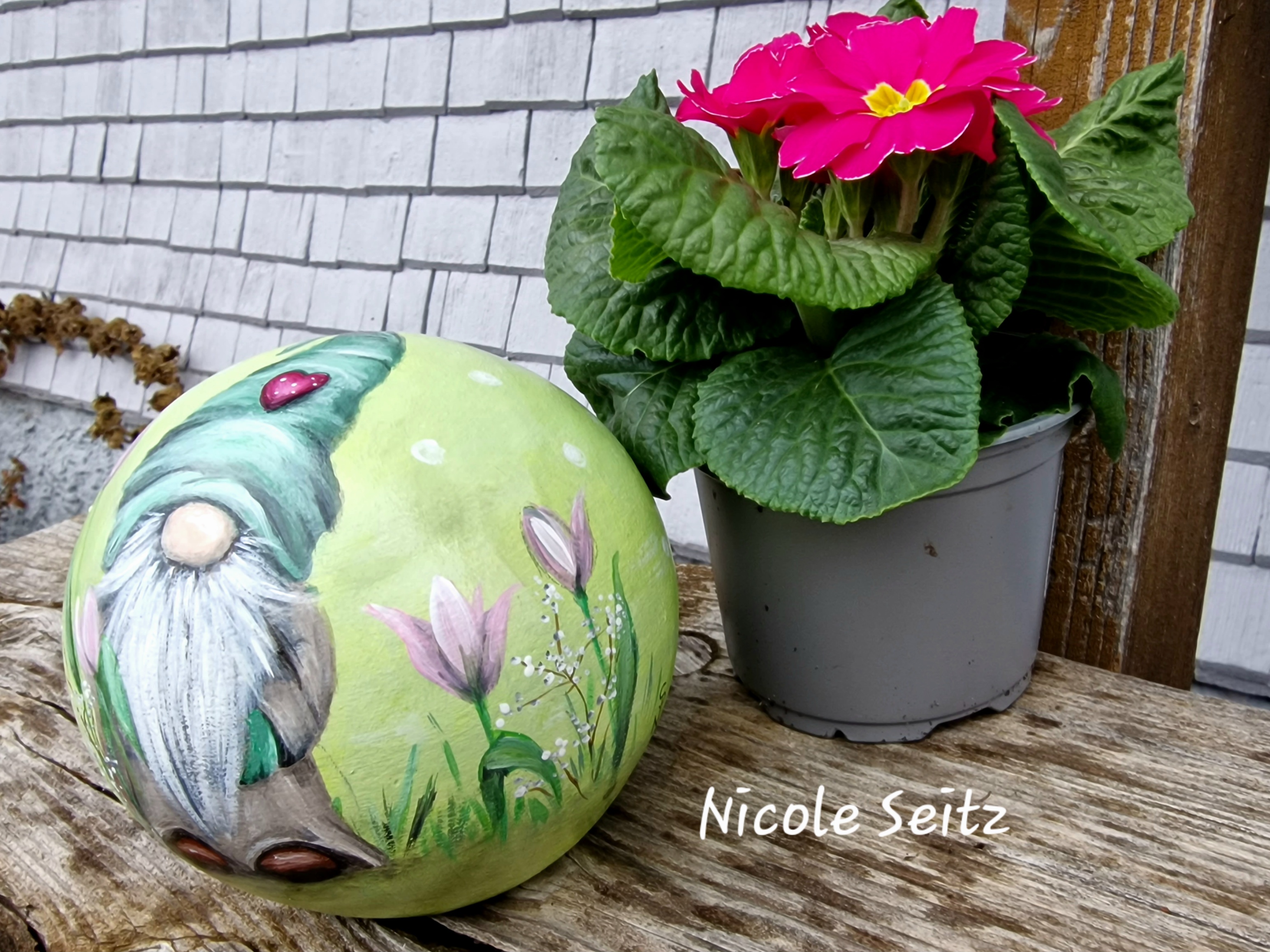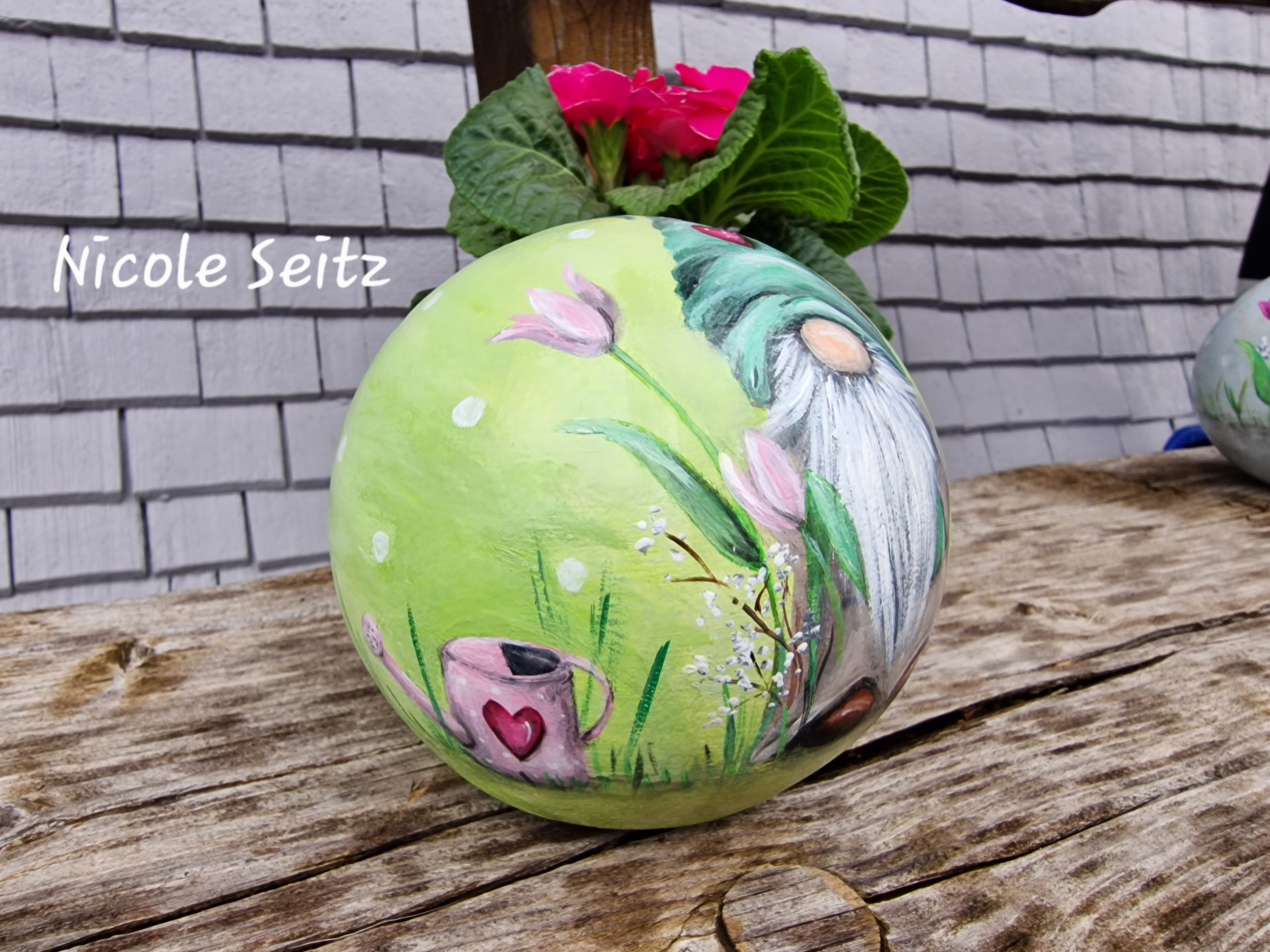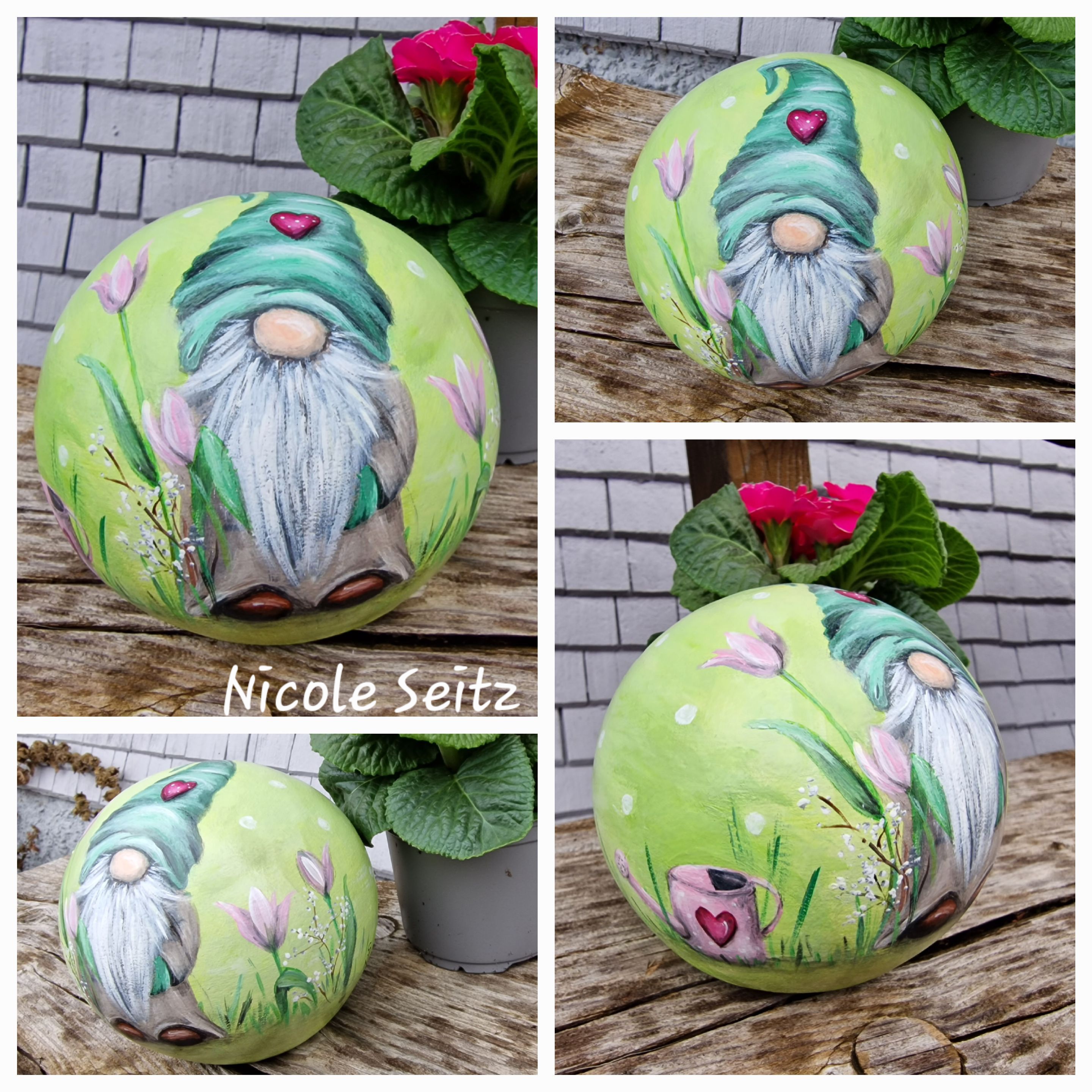 Zweimal mit guten Farben für den Außenbereich bemalt und mit einem glänzenden Acryllack zum noch besseren Schutz überzogen.