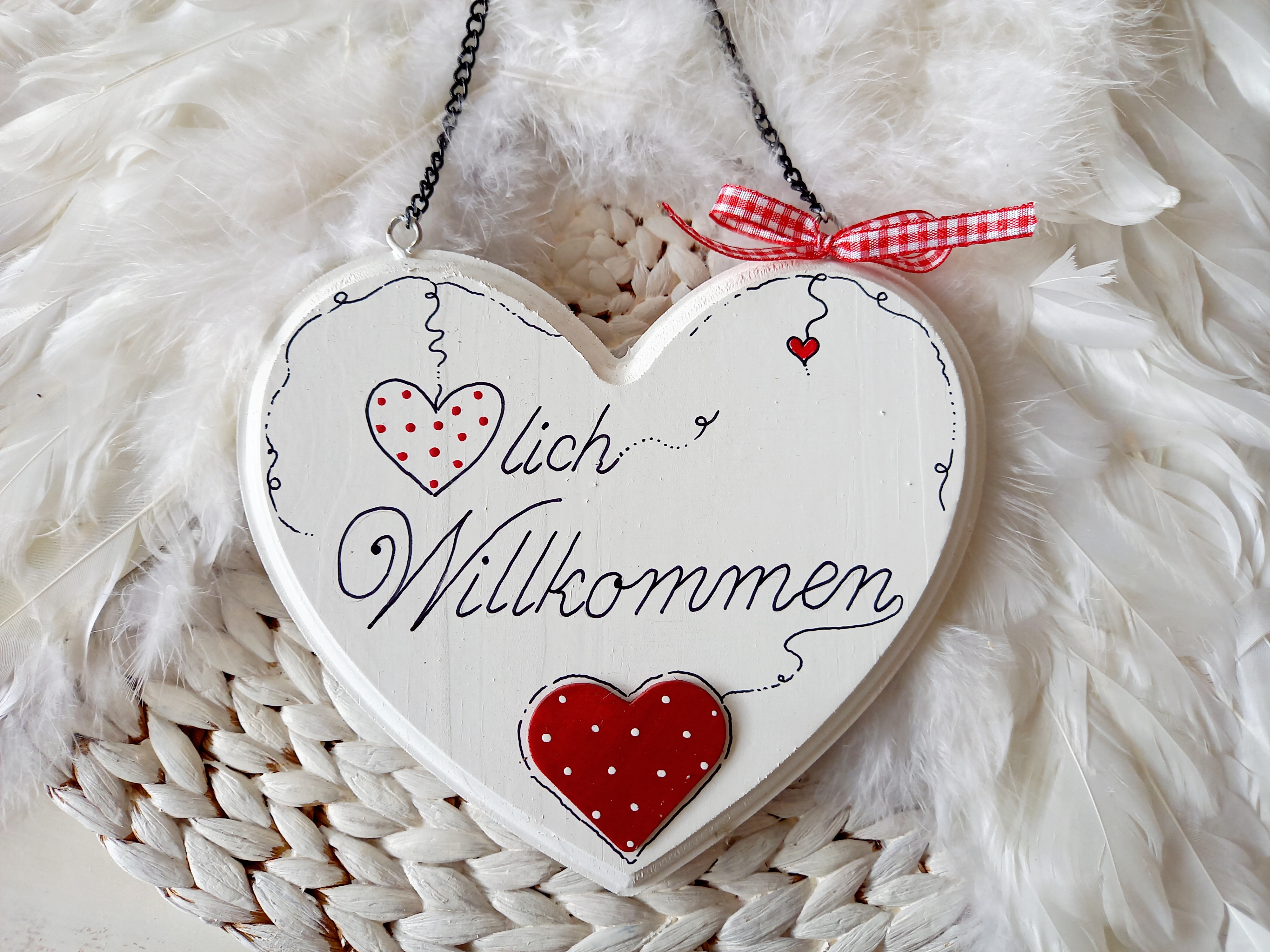 Material: Holzschild, Holzherz, Schleifenband, Acrylfarben, Acryllack