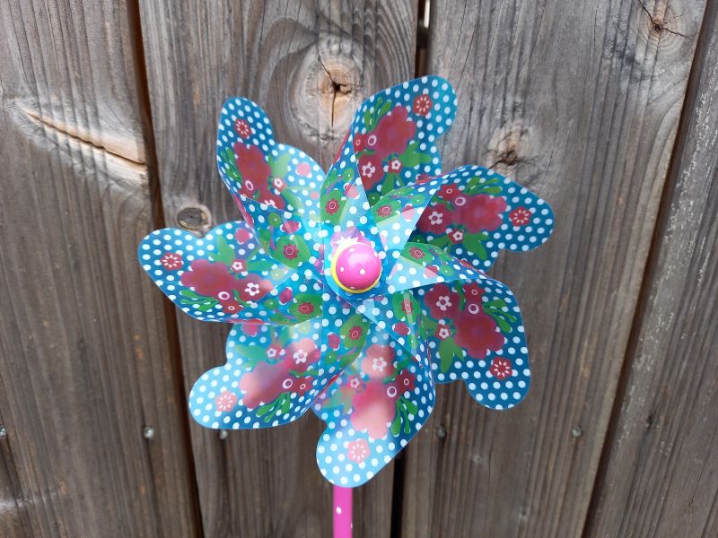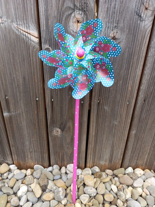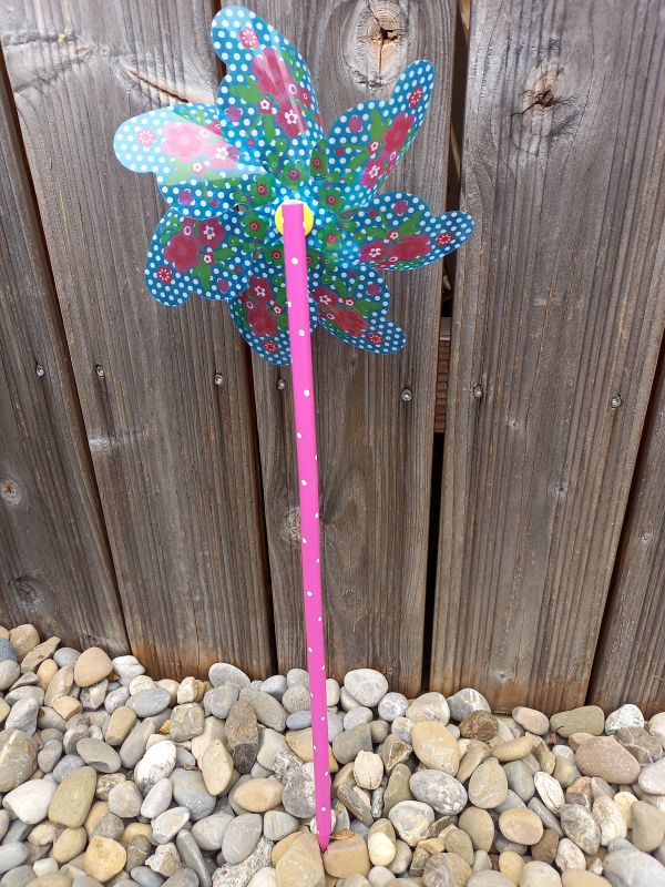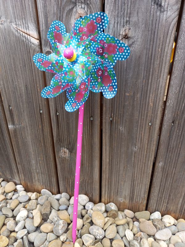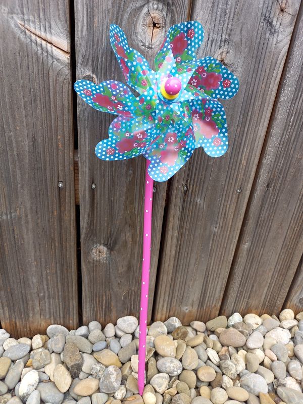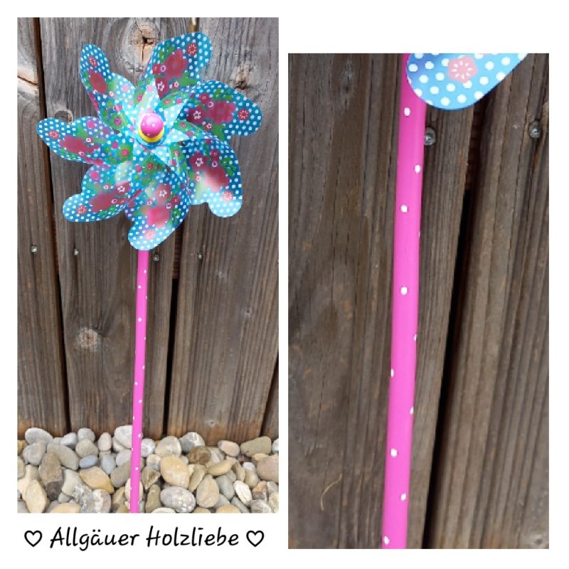 Stabiles Windrad - ein schöner, bunter Blickfang im Garten oder auf dem Balkon Holzstil und -kugel mit Blümchen und Pünktchen bemalt und mit einem glänzenden Acryllack zum Schutz überzogen. Größe: Durchmesser Windrad 17 cm, Länge gesamt ca. 49 cm Farben: Blau-Türkis, Pink, Weiß, Hellgrün Motiv: Blumen, Punkte Material: Kunststoff, Holz