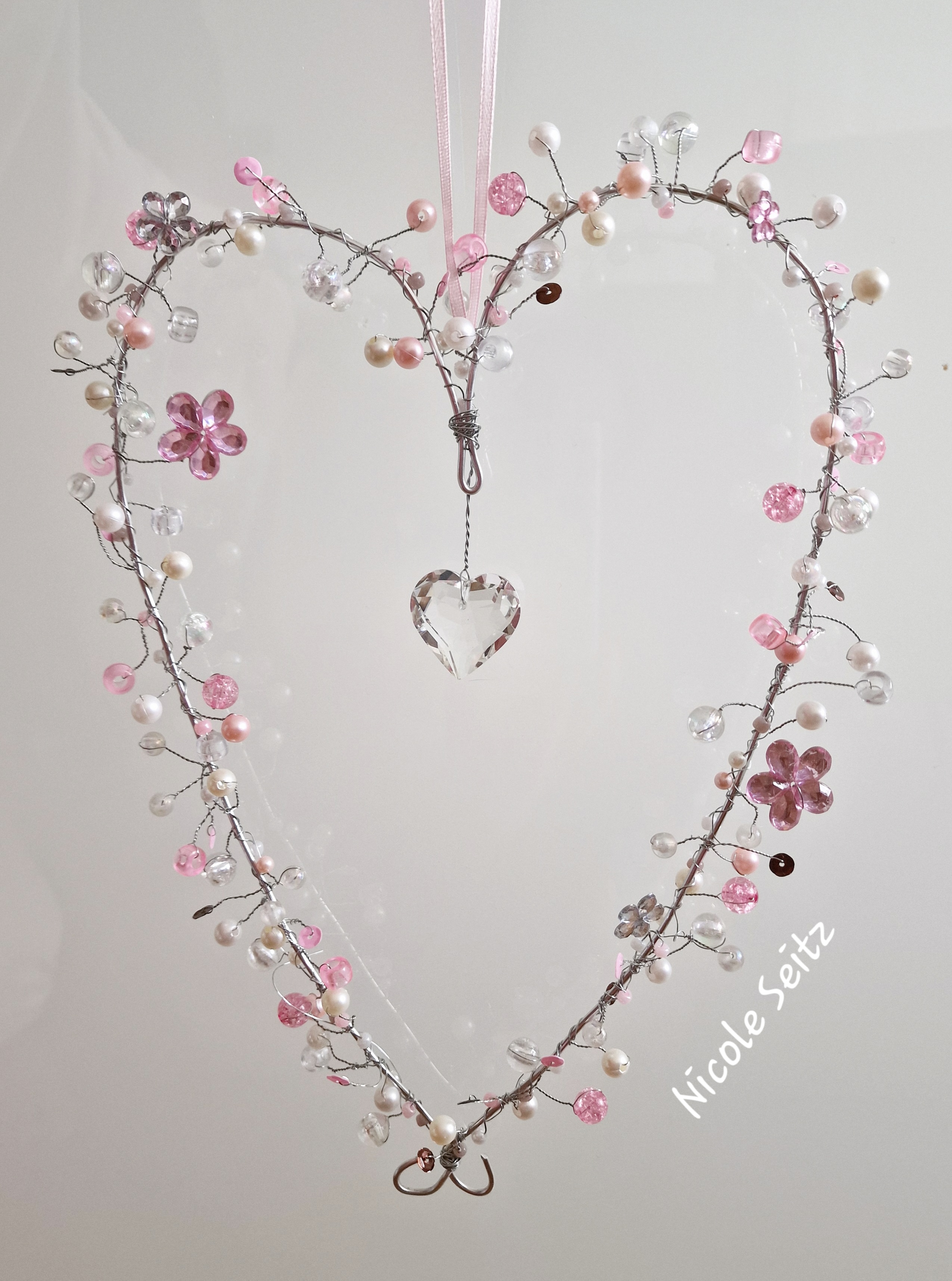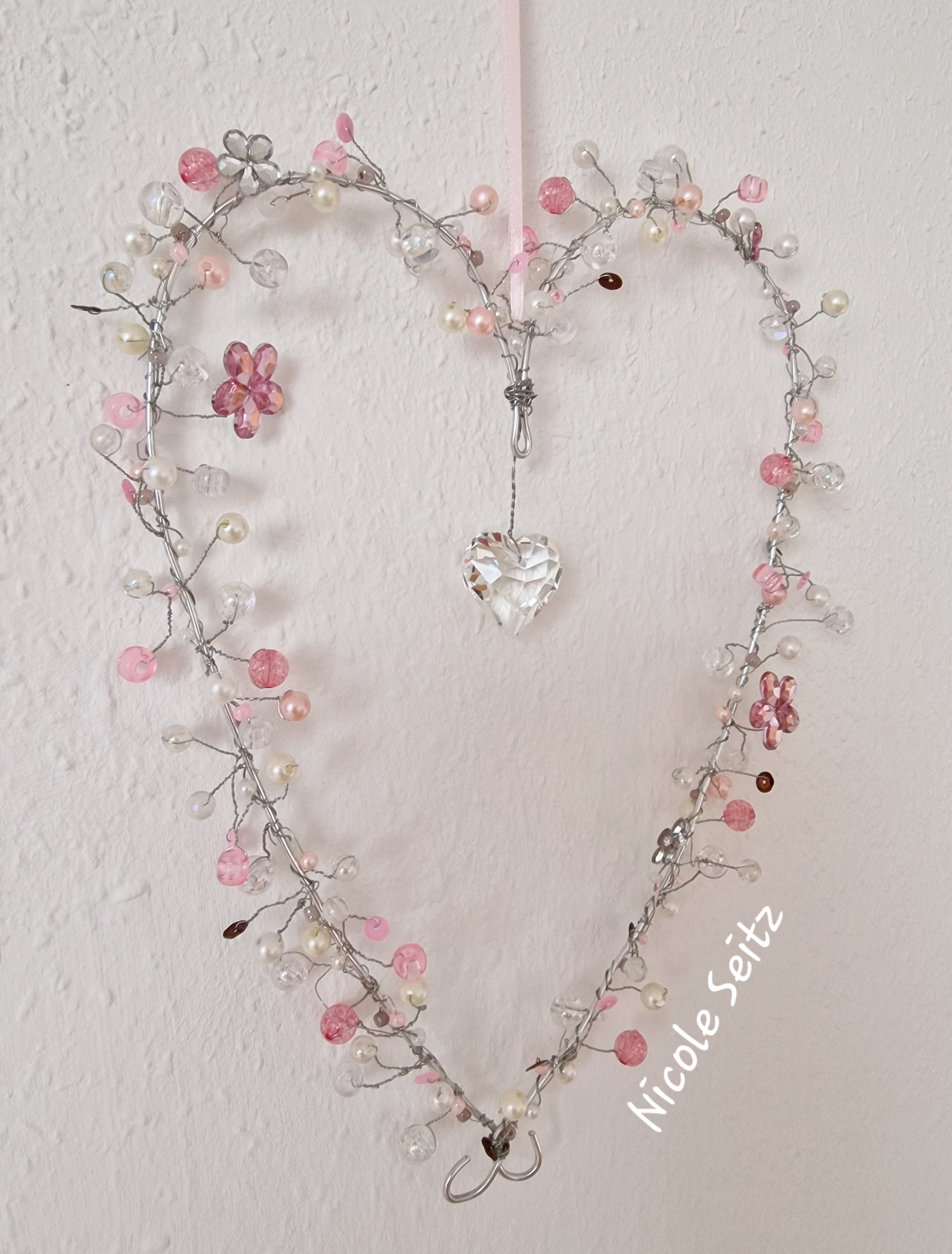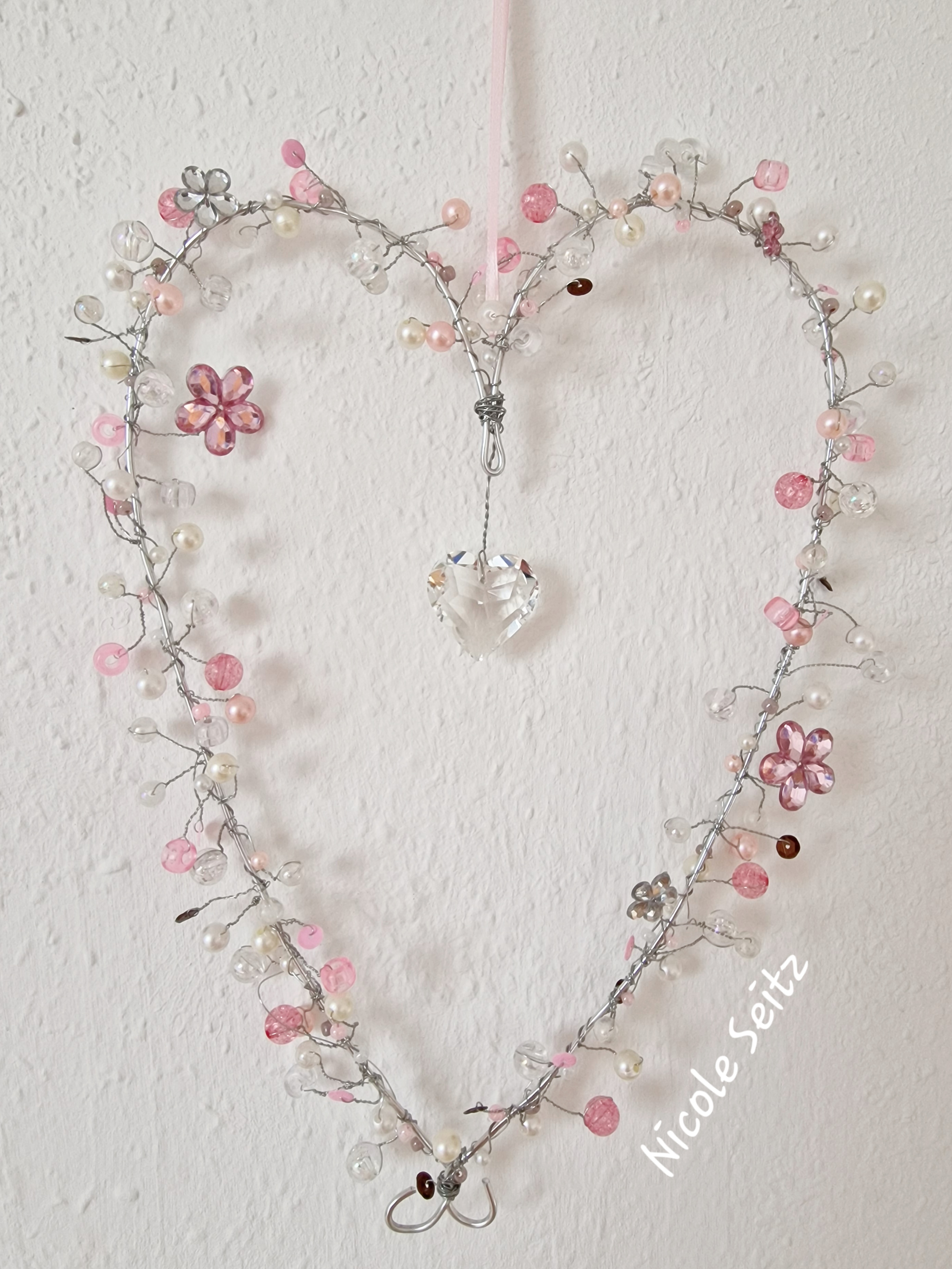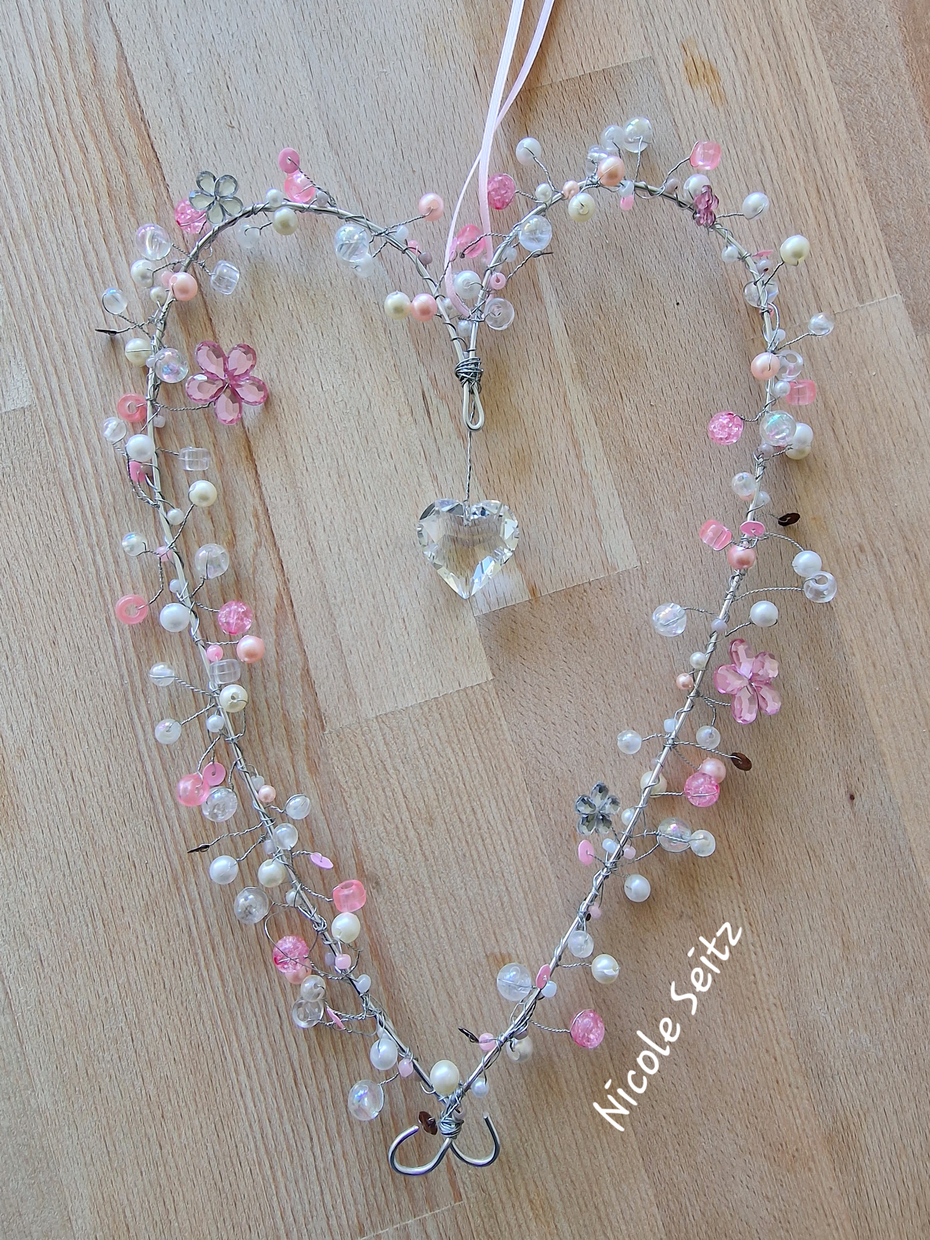 Material: Silberdraht, Kunststoffperlen und -blümchen, Pailletten, Kristallherz, Aufhängeband