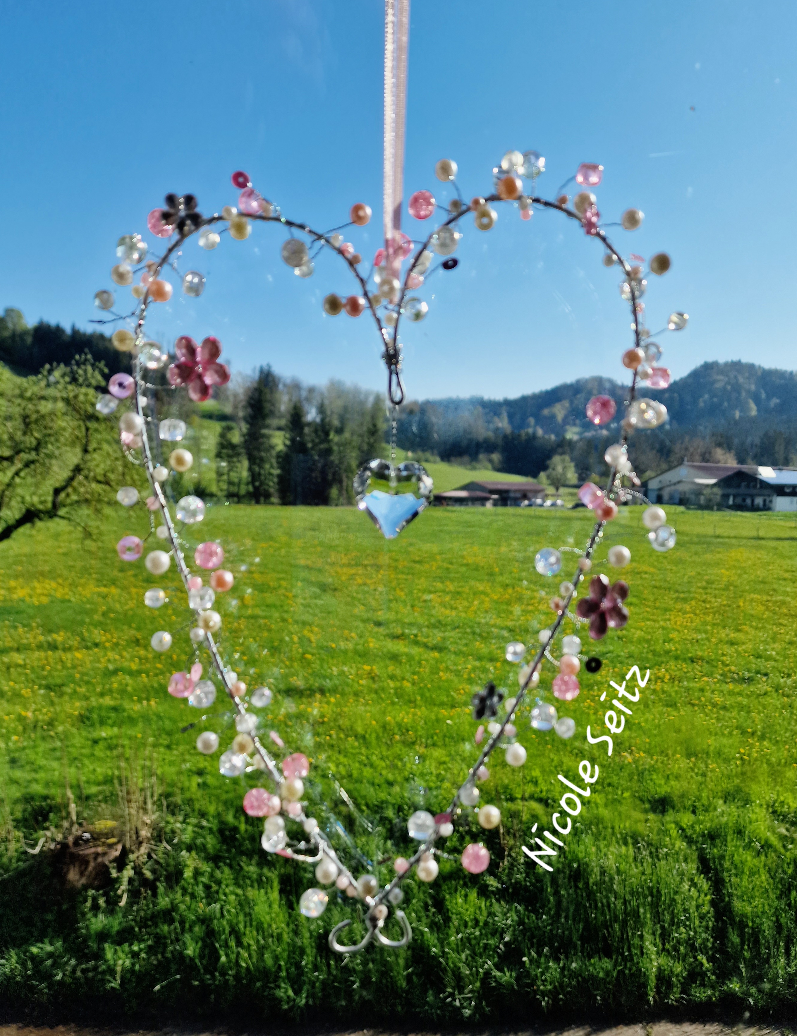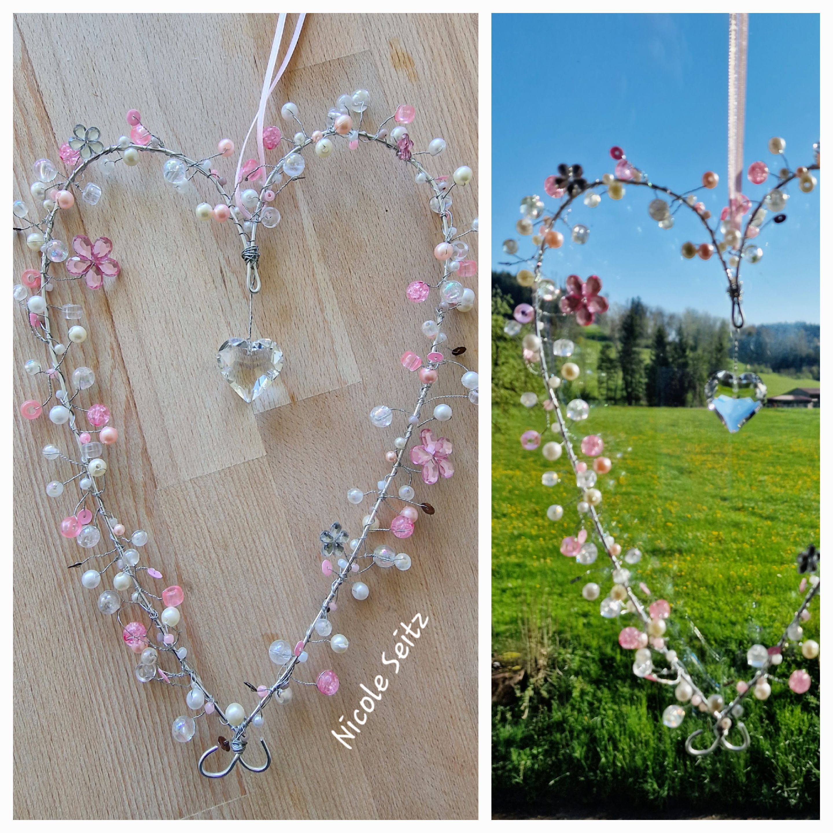 Ganzjährige Fensterdeko, die für eine angenehme, schöne Stimmung bei allen in der Familie sorgt, weil sich einfach immer wieder jeder über die hüpfenden Regenbogenflecken im Raum freut - natürlich vorausgesetzt, die Sonne scheint... Aber auch sonst ist das liebevoll angefertigte Herz ein toller Blickfang mit seinen funkelnden Perlen :-)